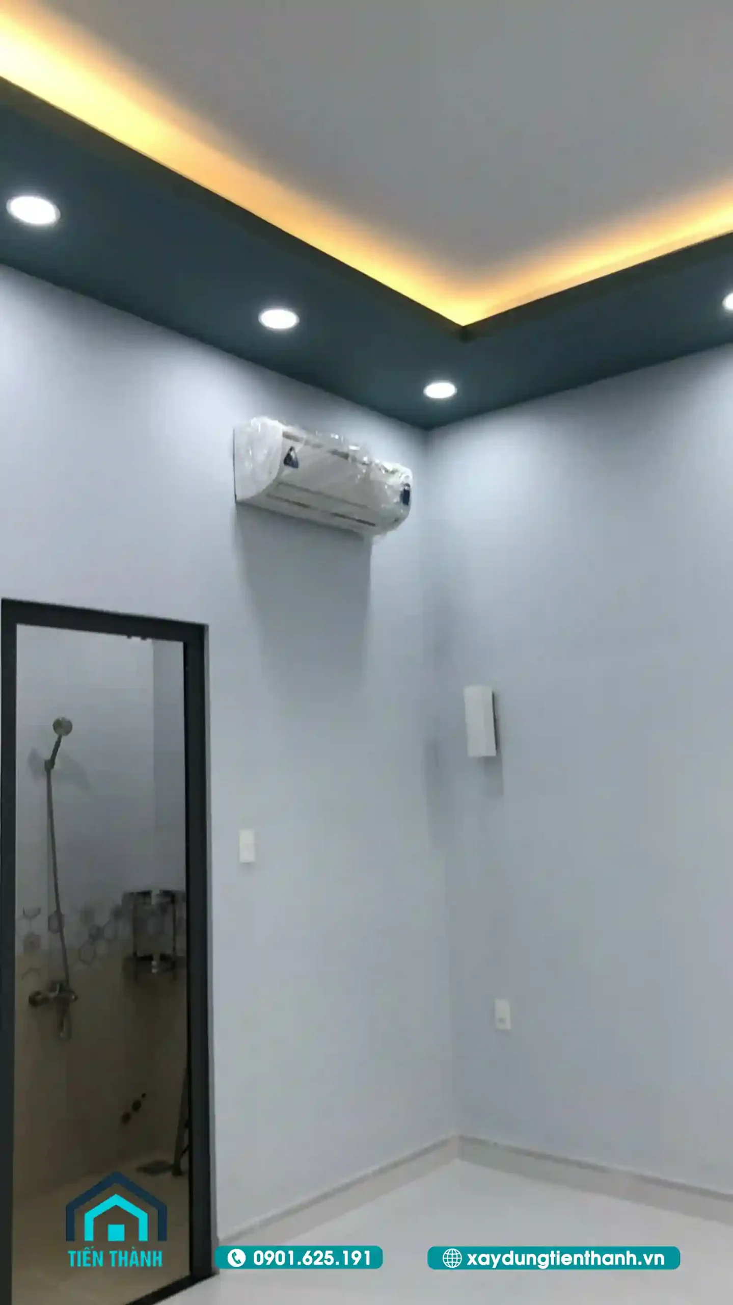 Phòng ngủ hiện đại với trần thạch cao giật cấp, đèn LED âm trần và máy lạnh lắp sẵn tiện nghi.