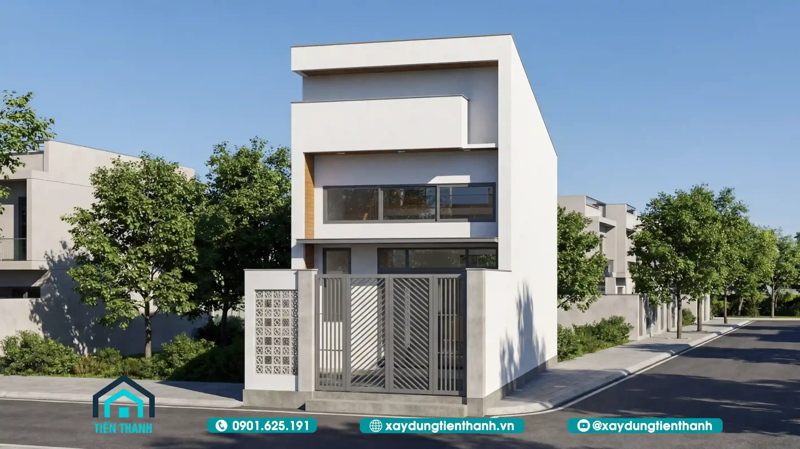 Phối cảnh mặt tiền nhà phố 5x12m thiết kế hiện đại, tối giản với tông màu trắng thanh lịch.