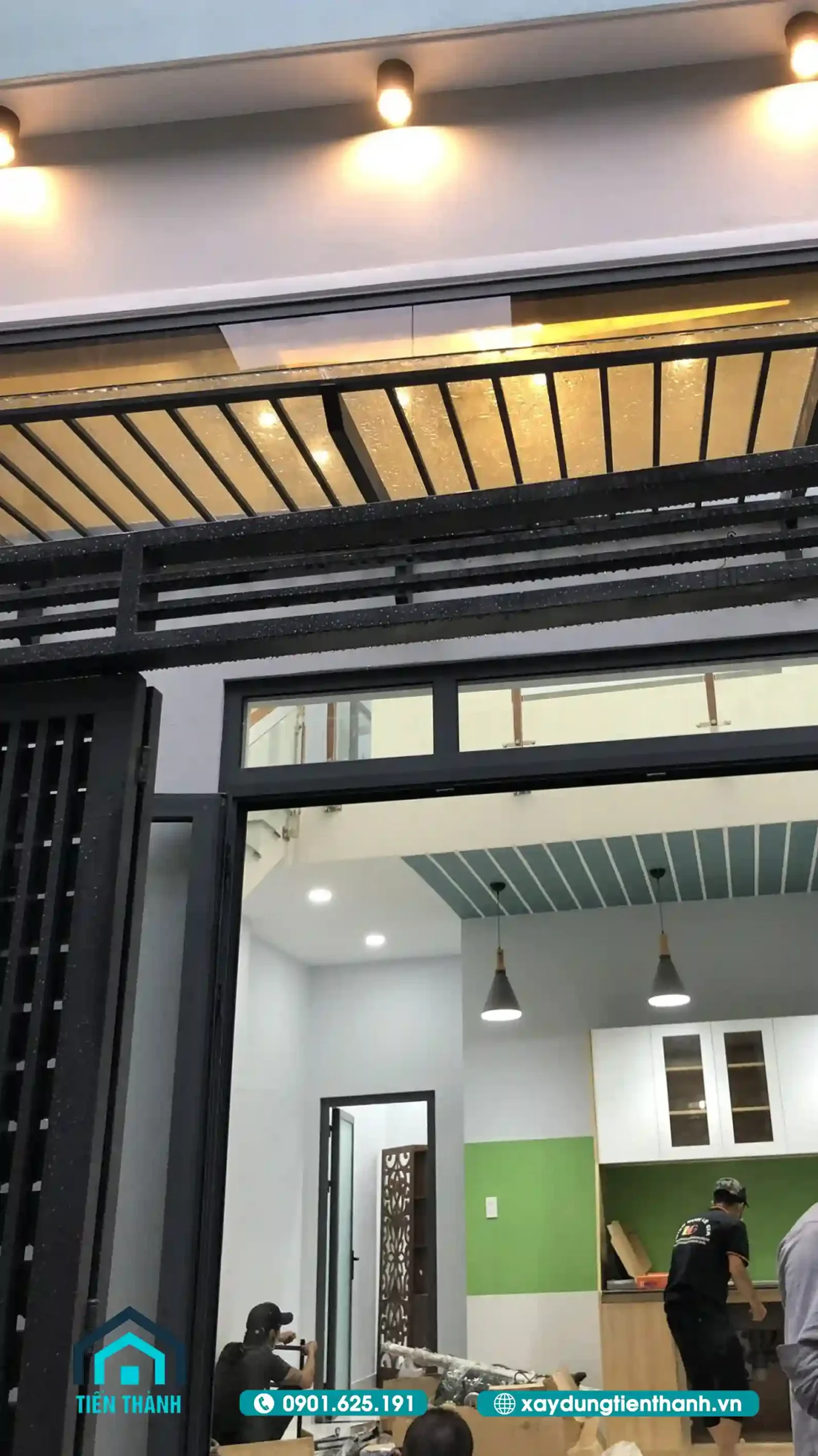 Góc nhìn từ cổng vào không gian nội thất đang hoàn thiện với khu bếp và gác lửng phía trên.