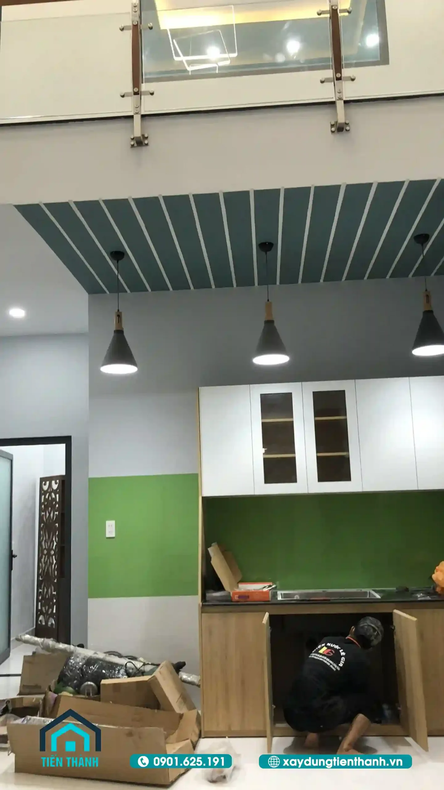 Khu vực bếp đang được lắp đặt tủ gỗ, nổi bật với mảng tường xanh và hệ đèn thả trang trí.