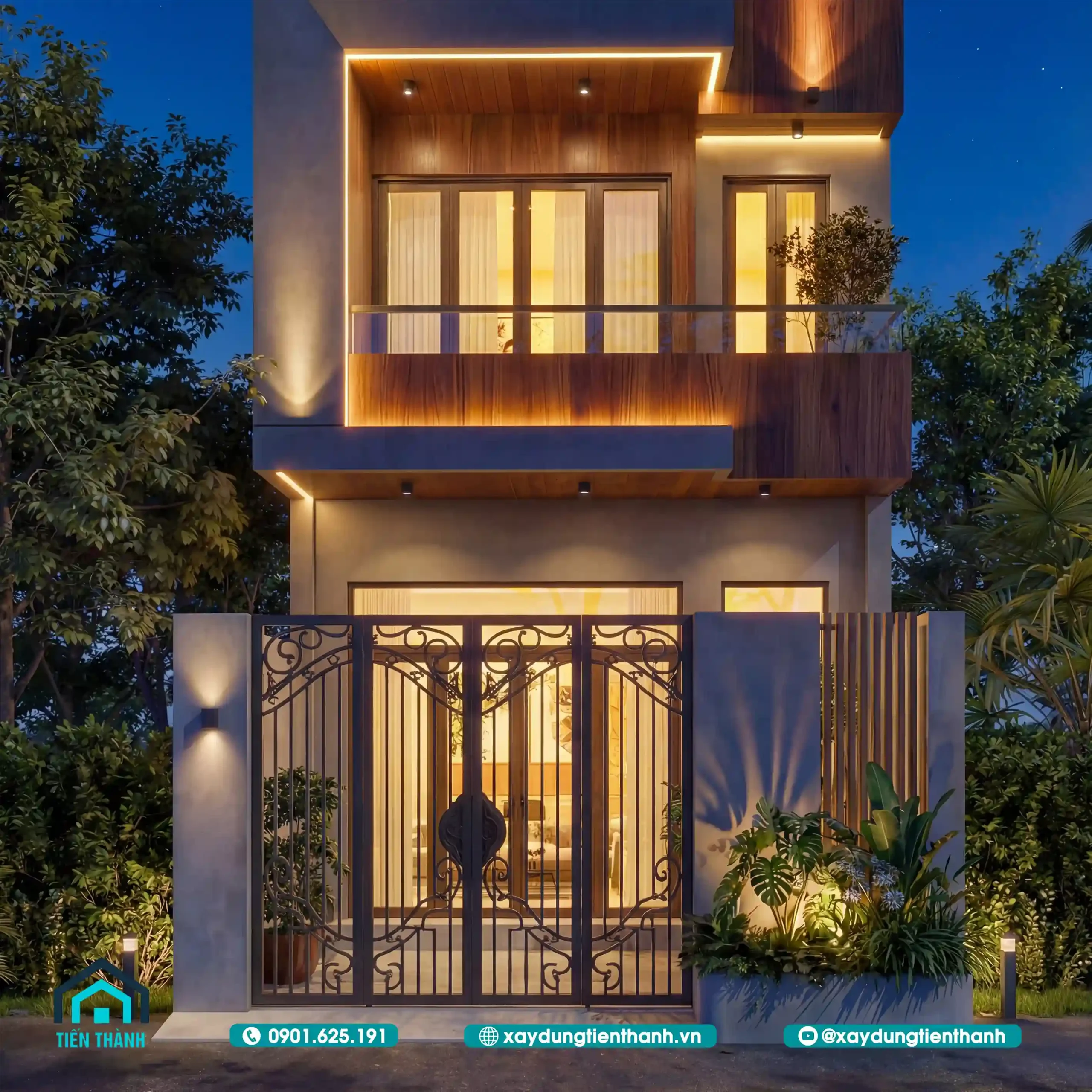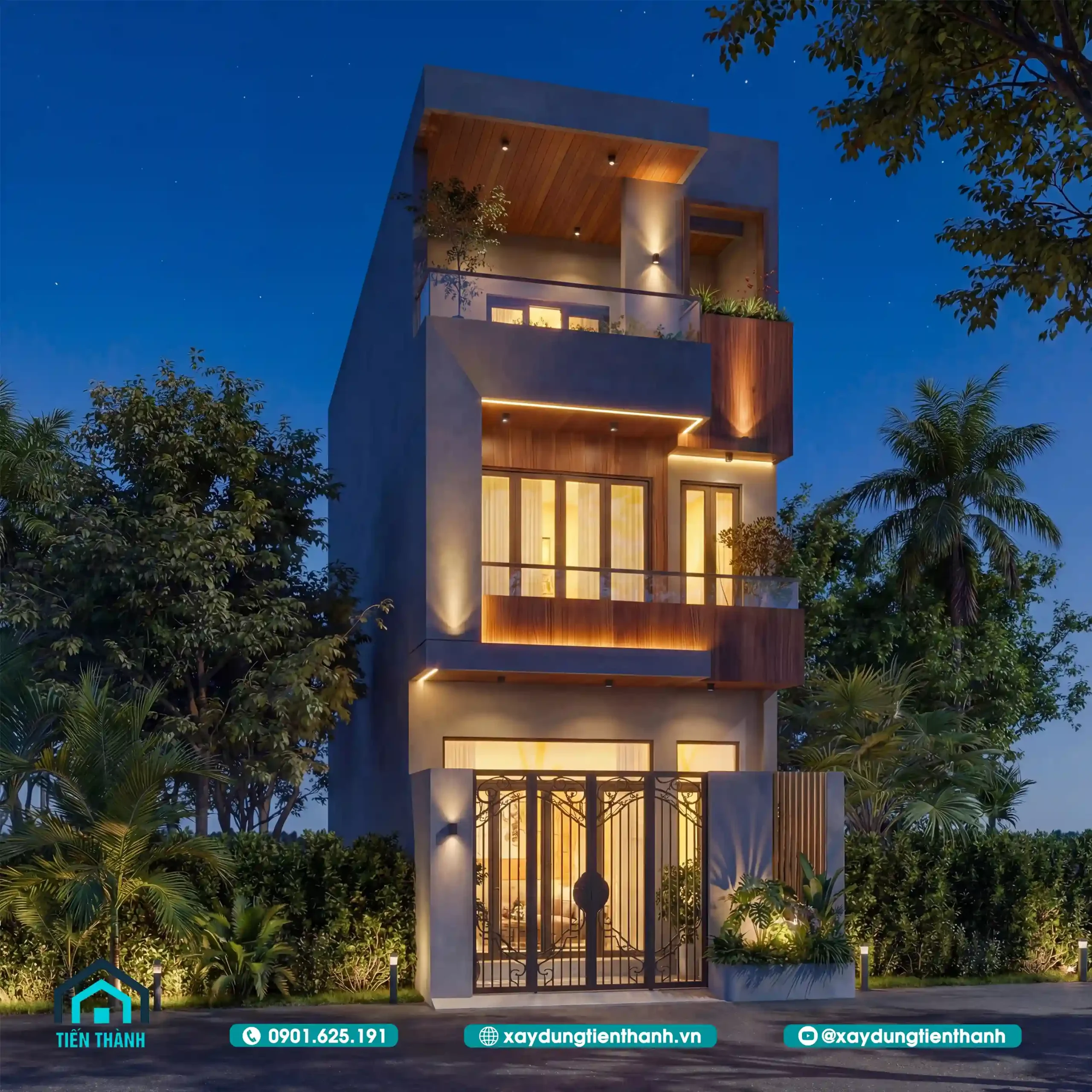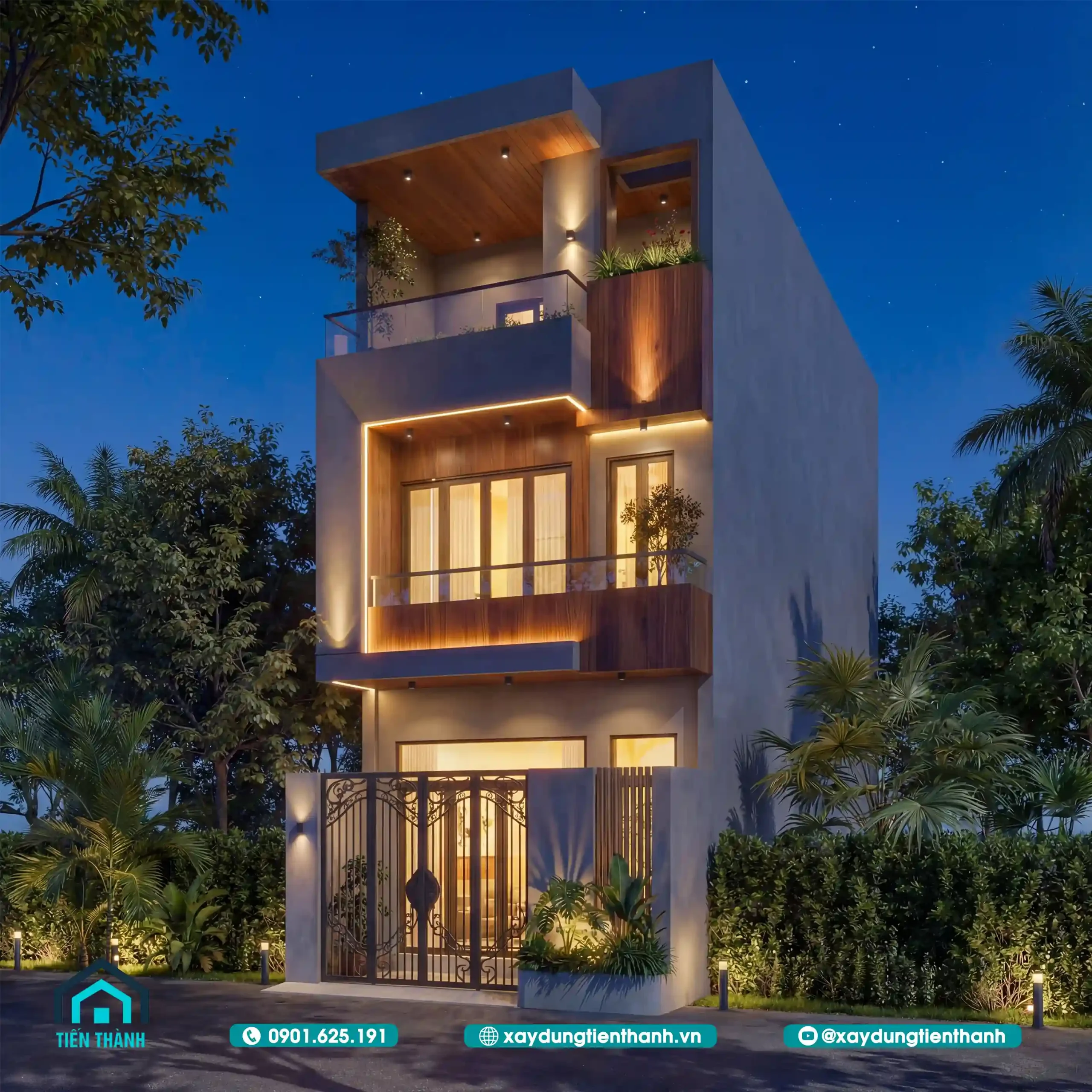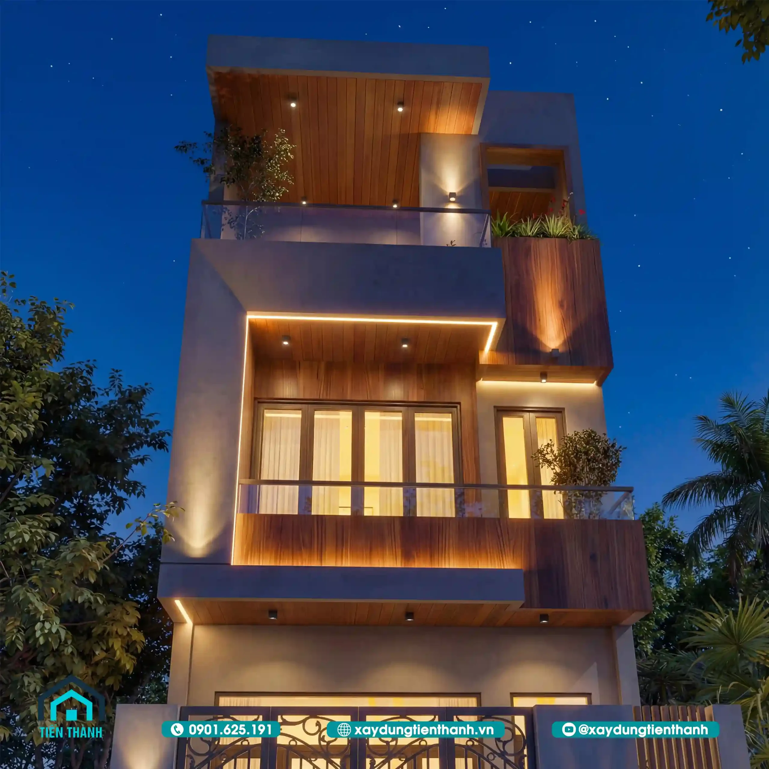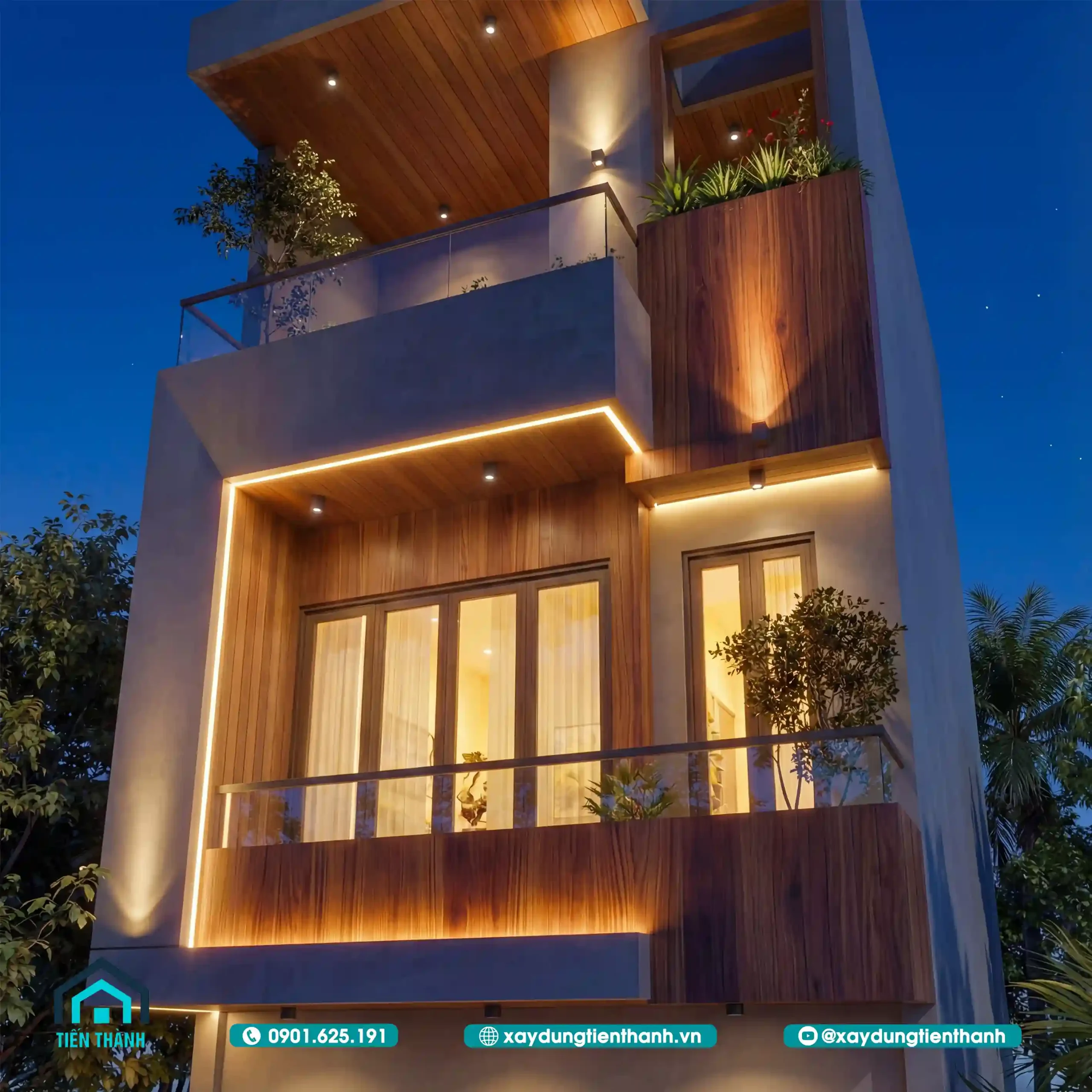 Hệ thống đèn LED thanh (linear lighting) được giấu khéo léo trong các đường gờ và khối đua ban công. Ánh sáng vàng ấm (3000K) giúp tôn vinh màu sắc tự nhiên của gỗ ốp, đồng thời tạo ra những mảng sáng tối có chiều sâu, khiến ngôi nhà trông giống như một tác phẩm nghệ thuật hơn là một công trình bê tông thô cứng.