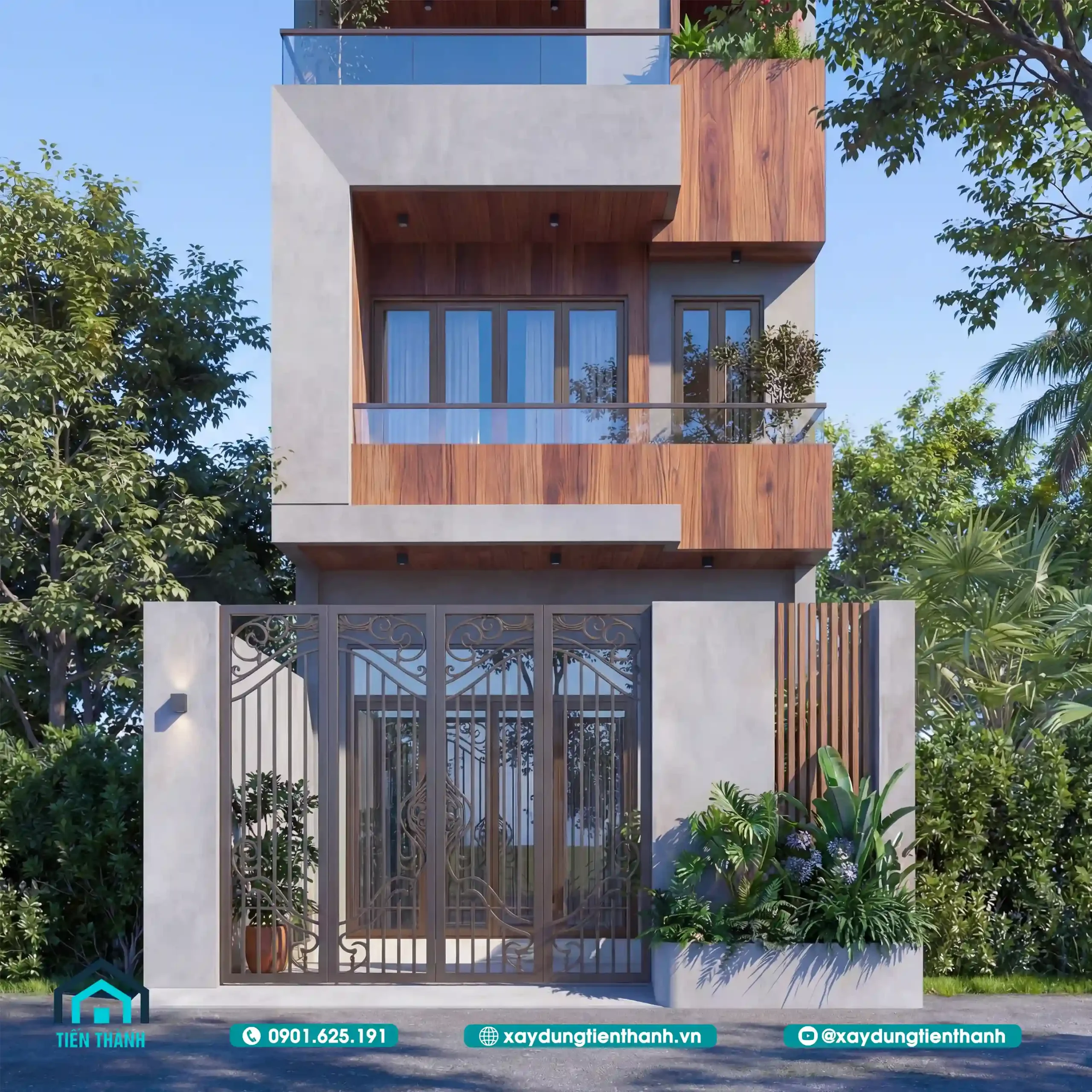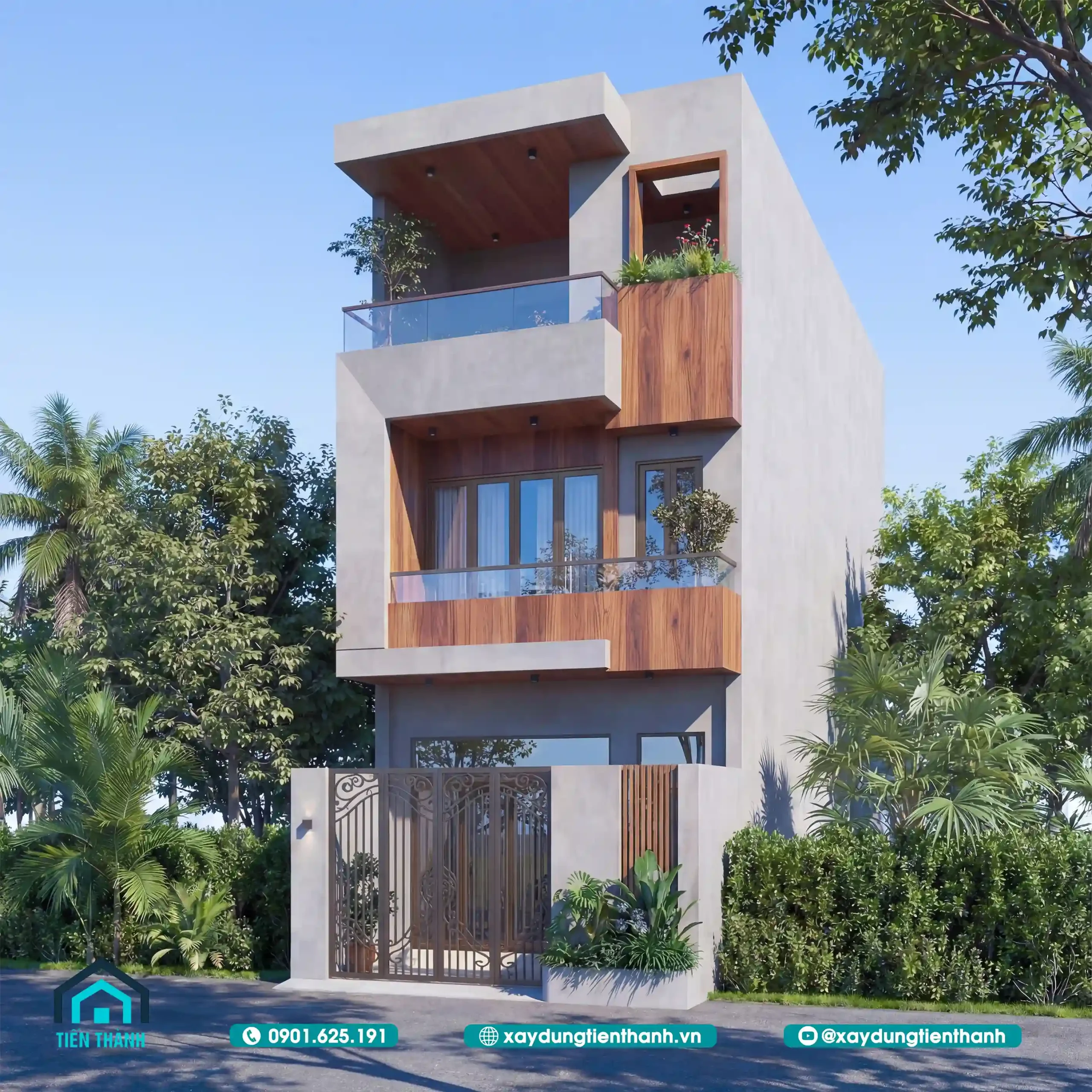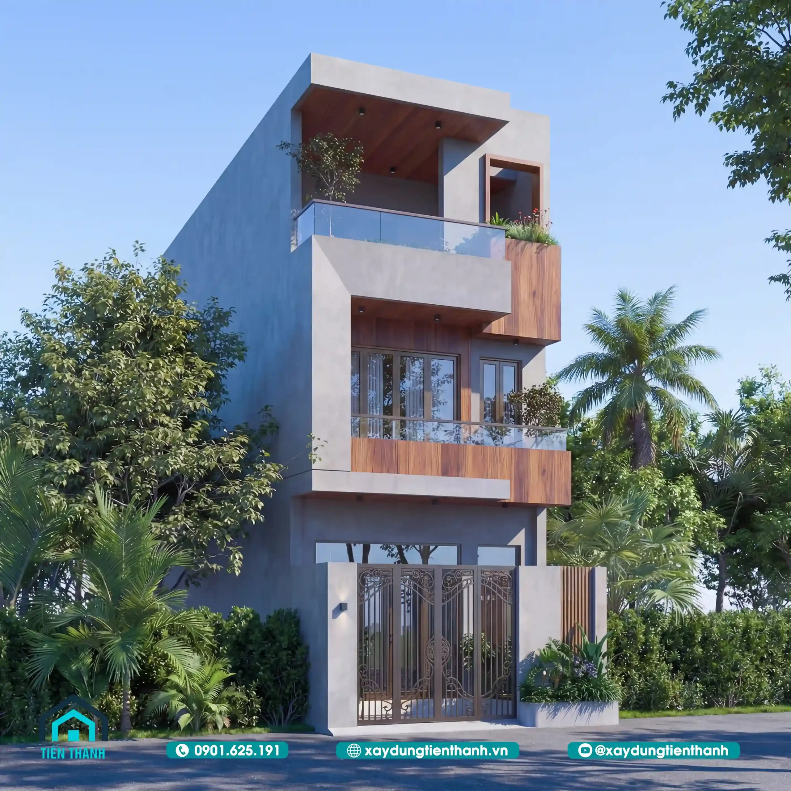 Nhà phố hiện đại ba tầng với mảng tường xám và ốp gỗ ấm áp ban ngày.