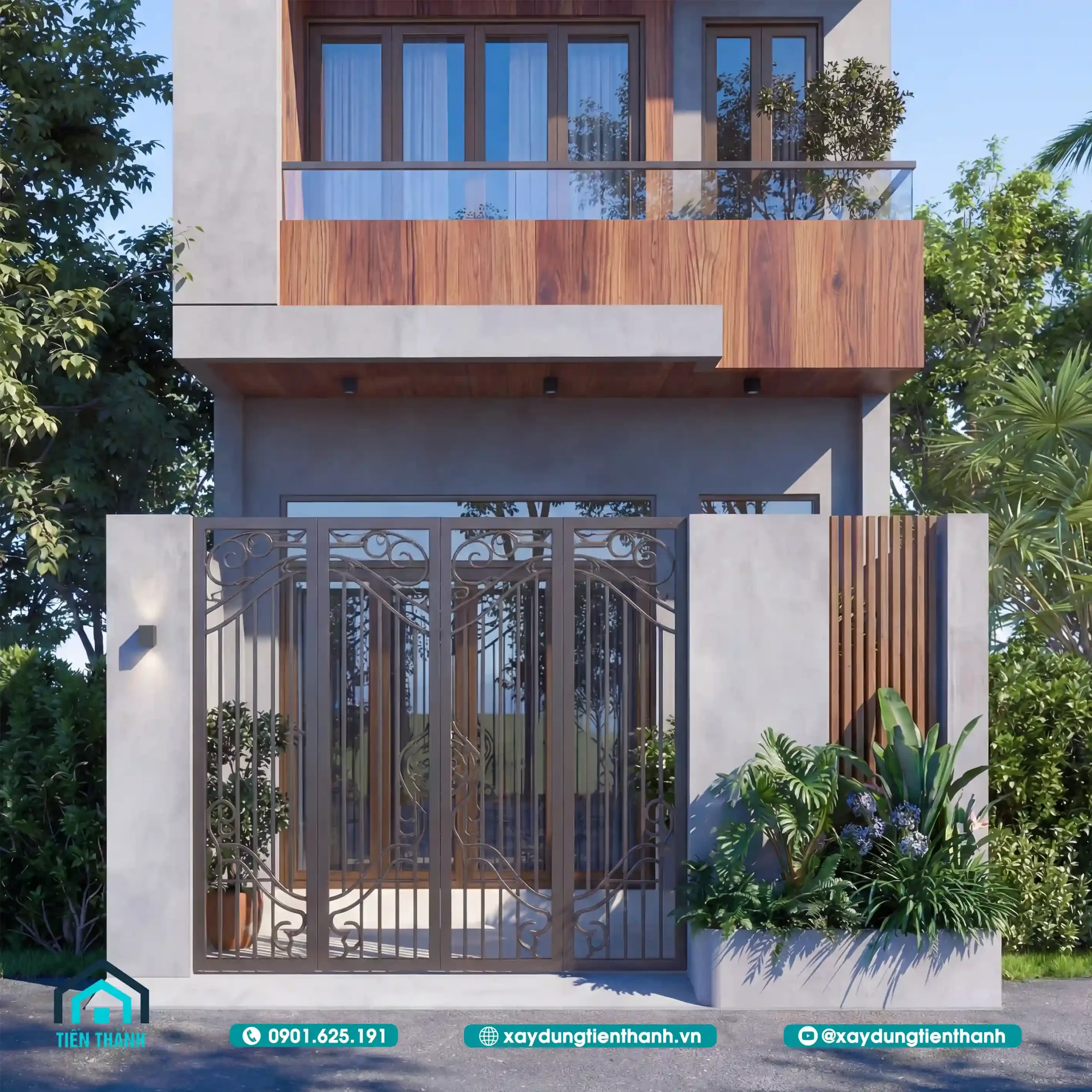 Cận cảnh tầng trệt với cổng sắt nghệ thuật và bồn cây cảnh trang trí đẹp.