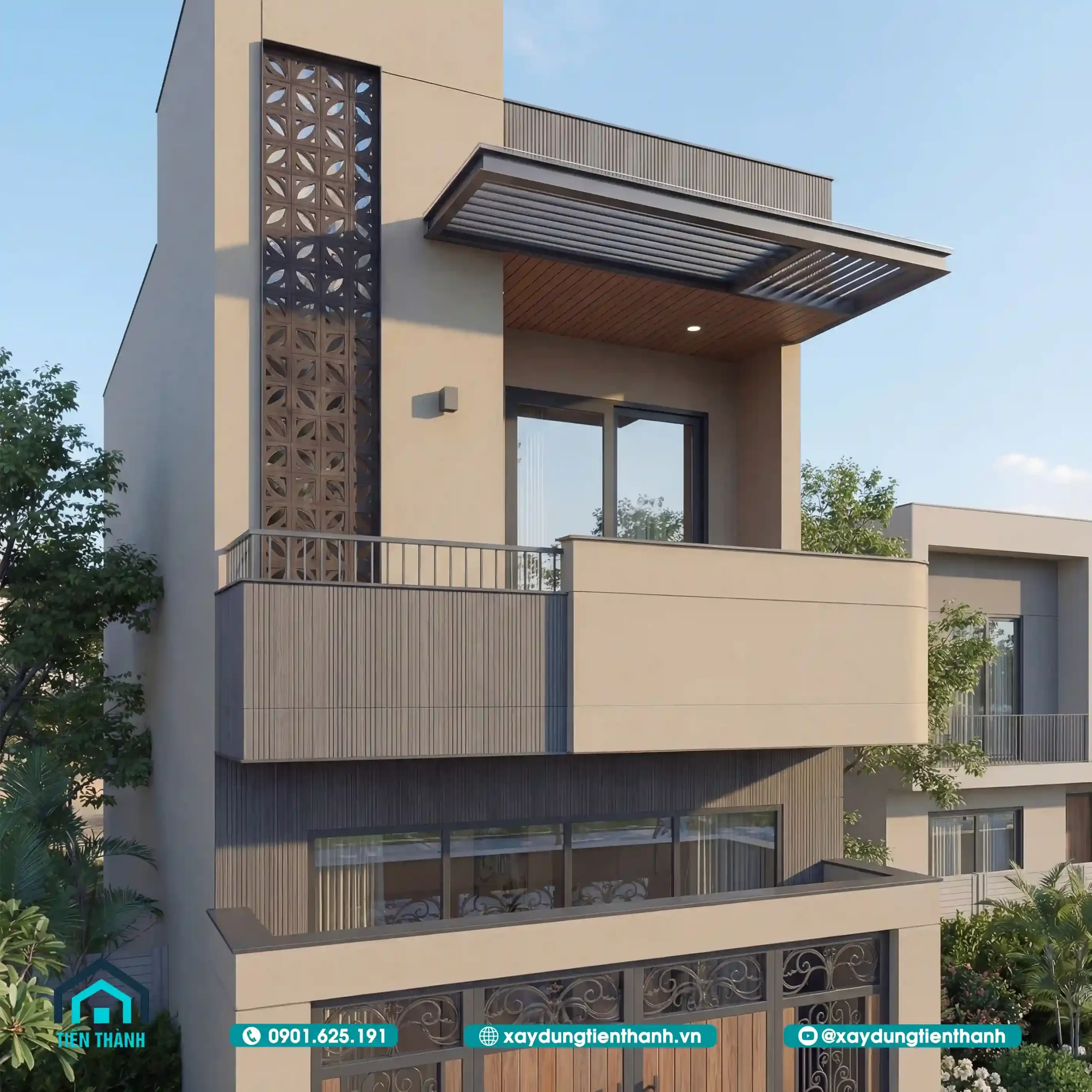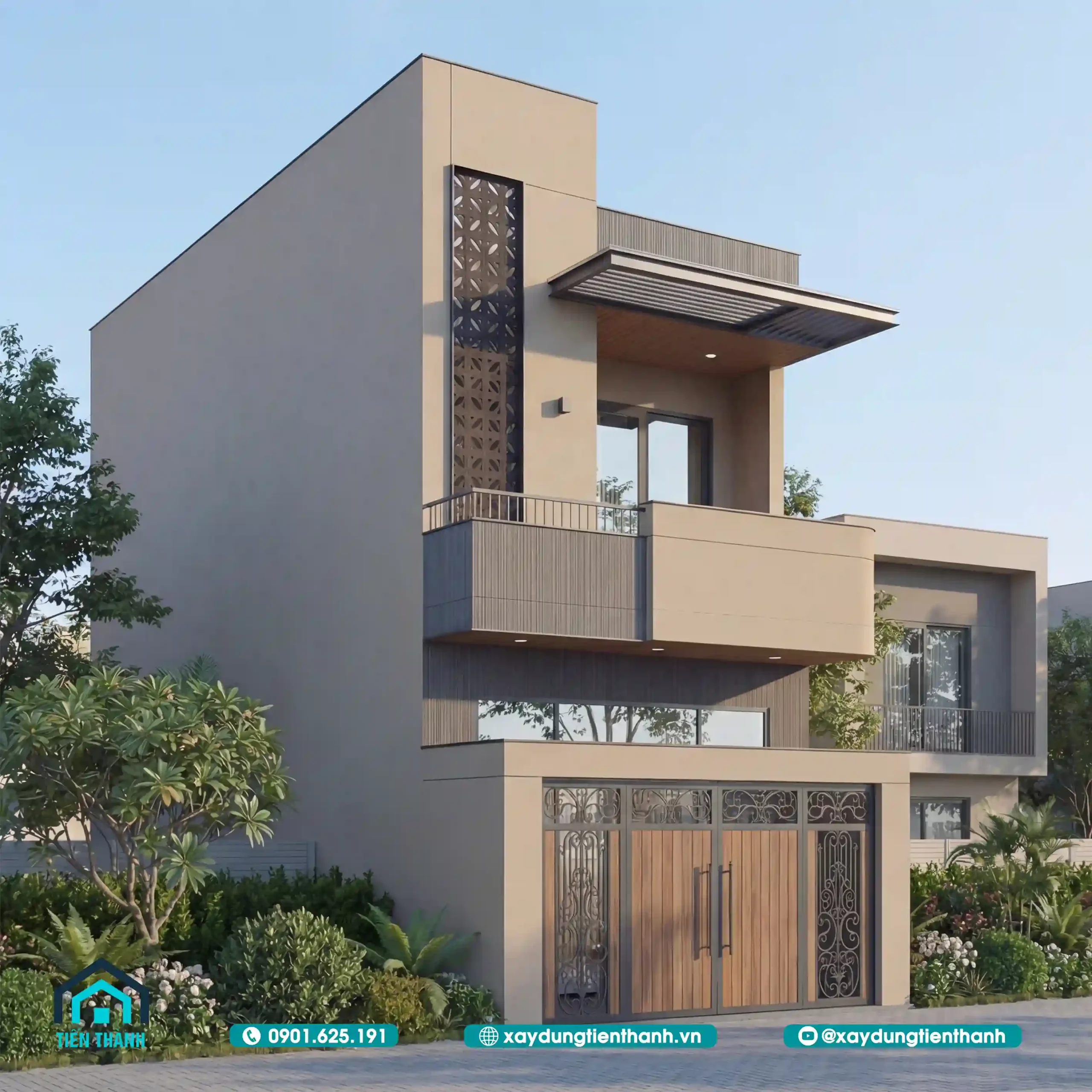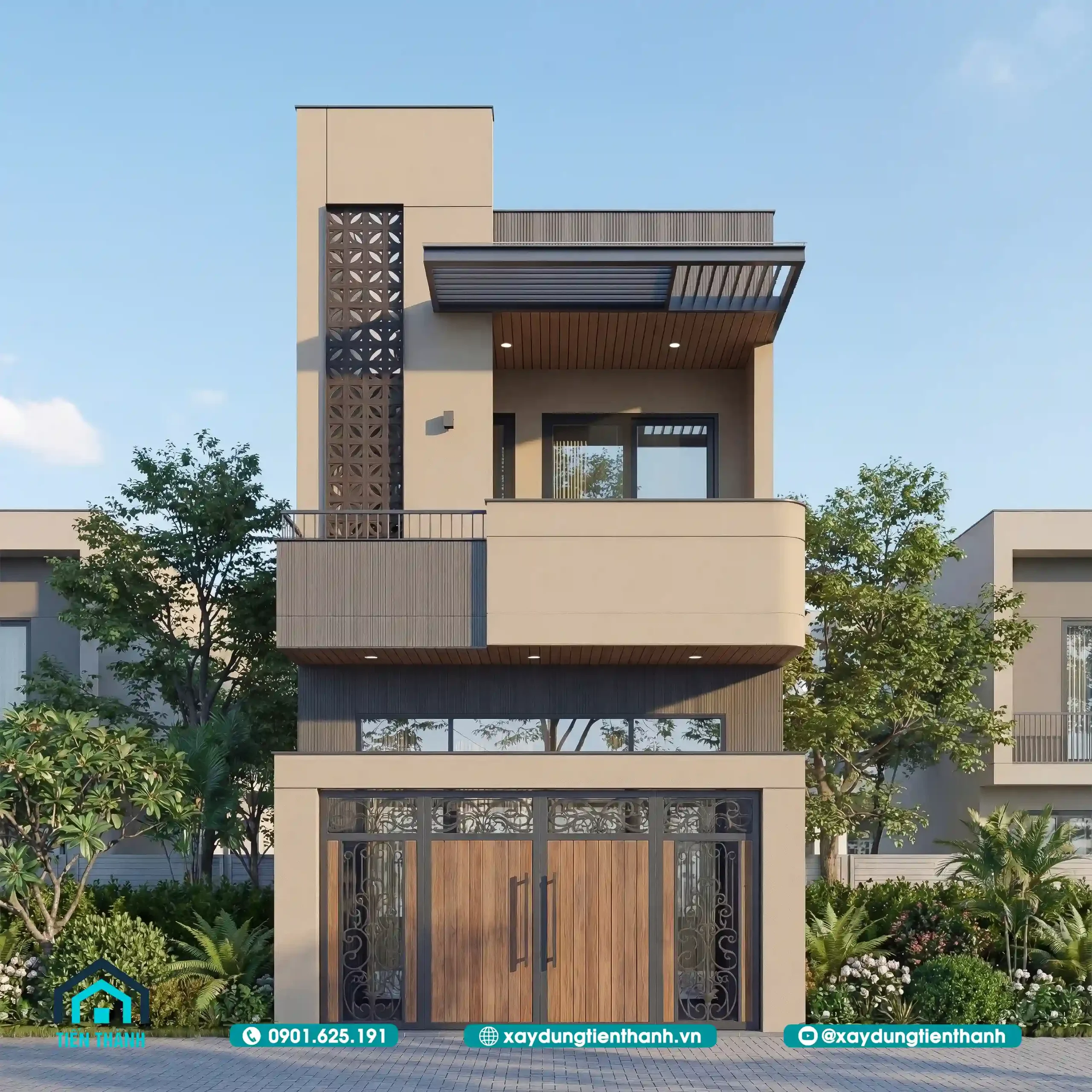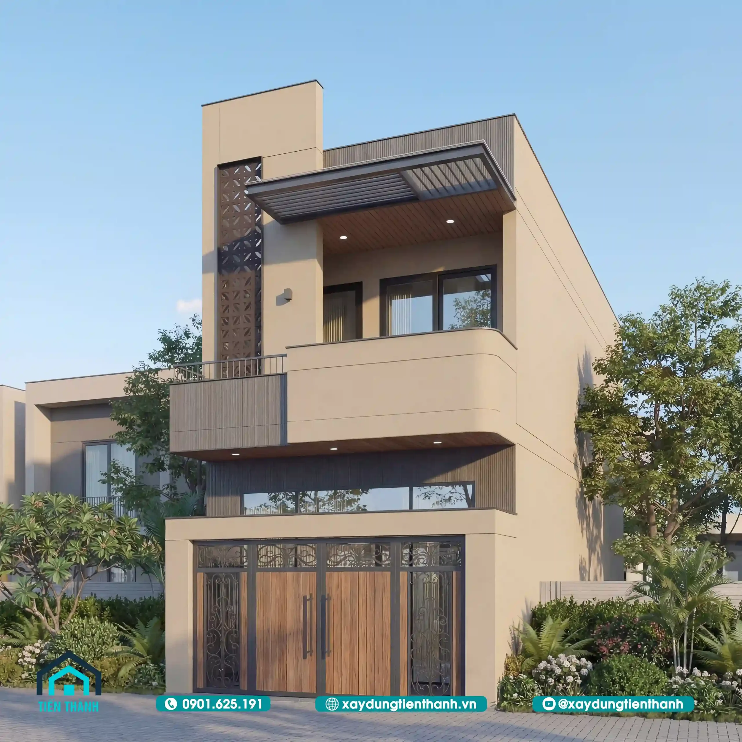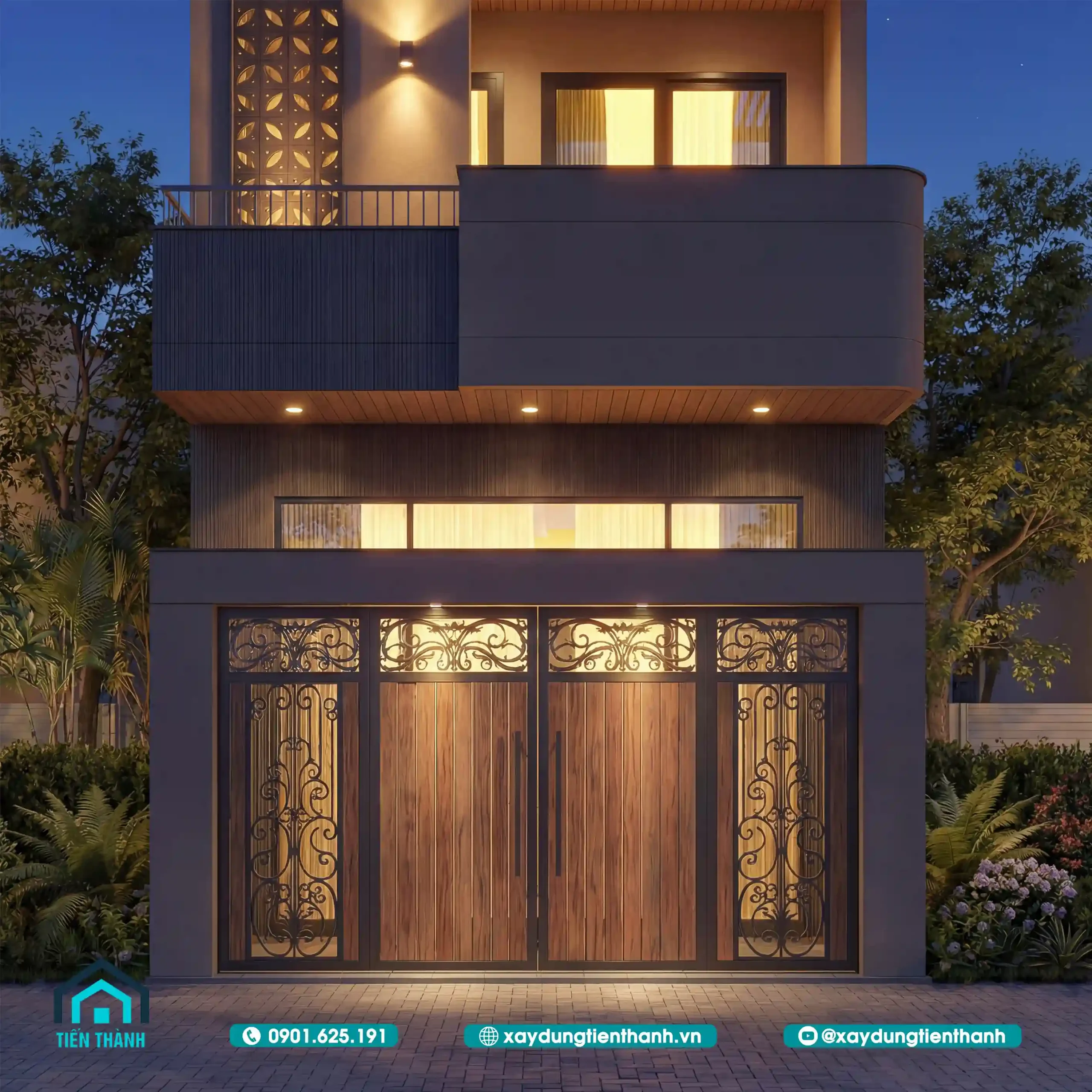 Mặt tiền chính là “gương mặt” của gia chủ. Với mẫu 5×20 nhà 2 tầng mặt tiền 5m đẹp này, sự kết hợp giữa vật liệu truyền thống và hiện đại đã tạo nên một tổng thể ấn tượng.