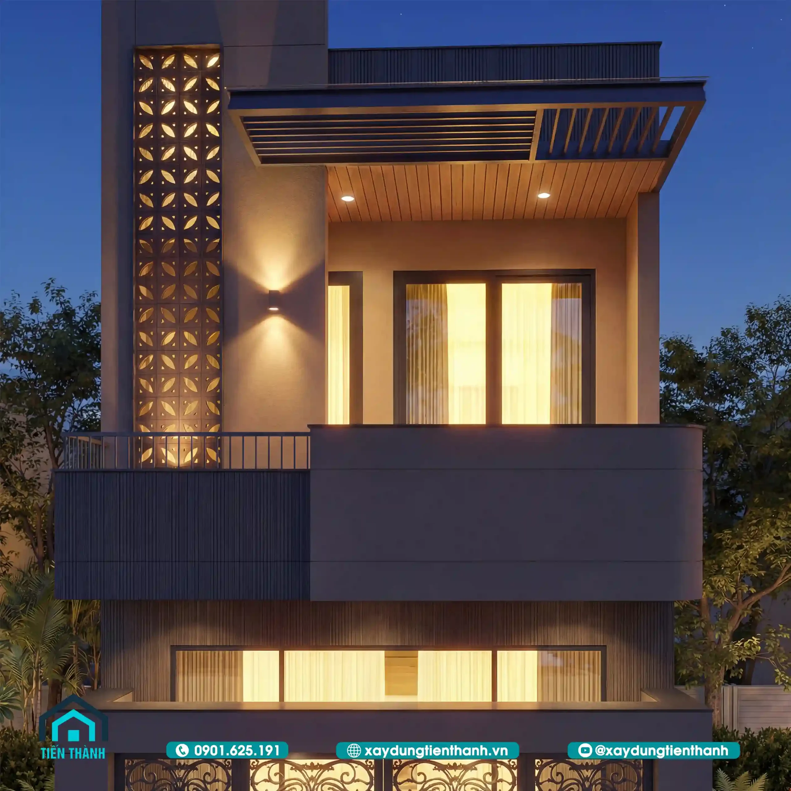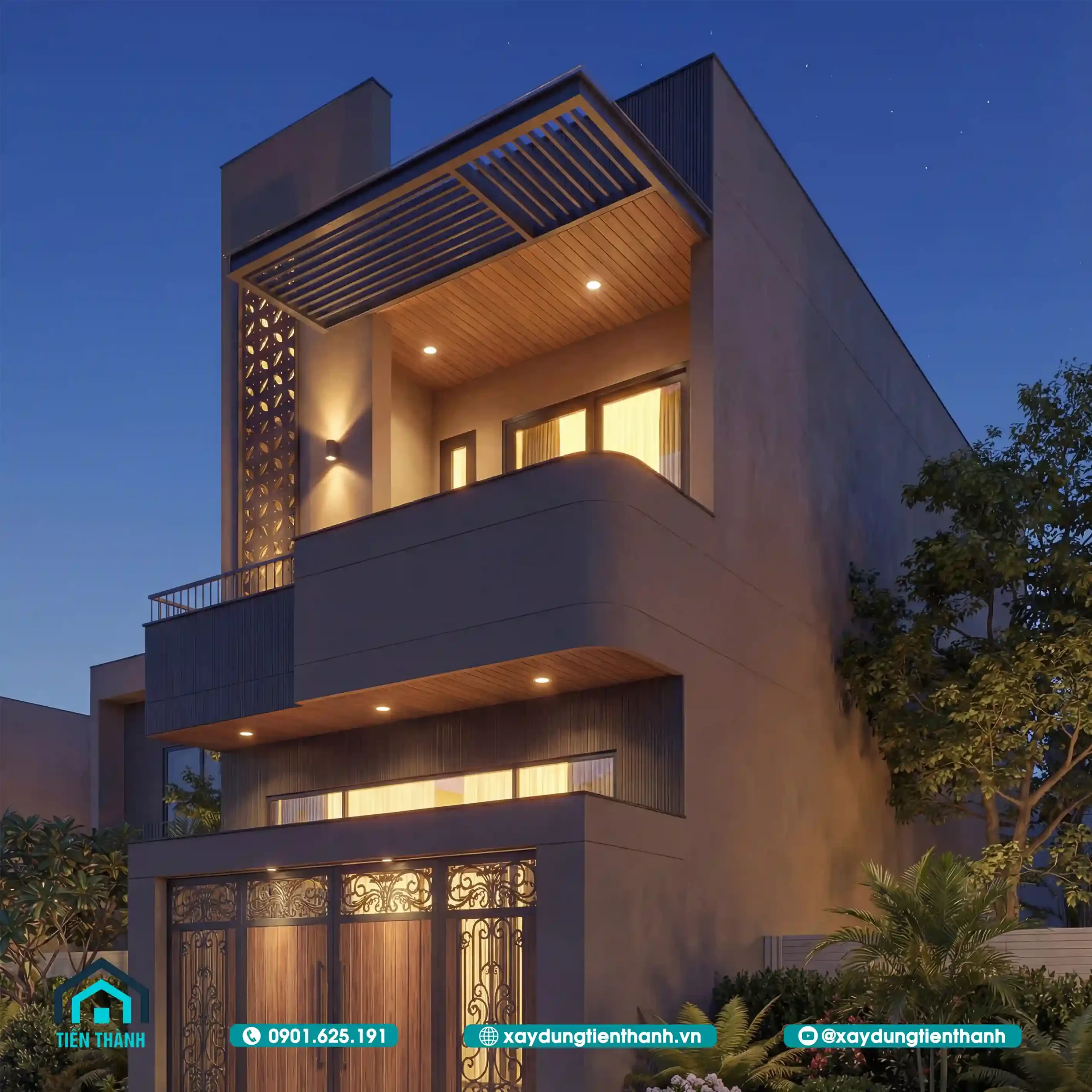 Mặt tiền nhà phố hiện đại lung linh dưới ánh đèn vàng ấm áp vào buổi tối.
