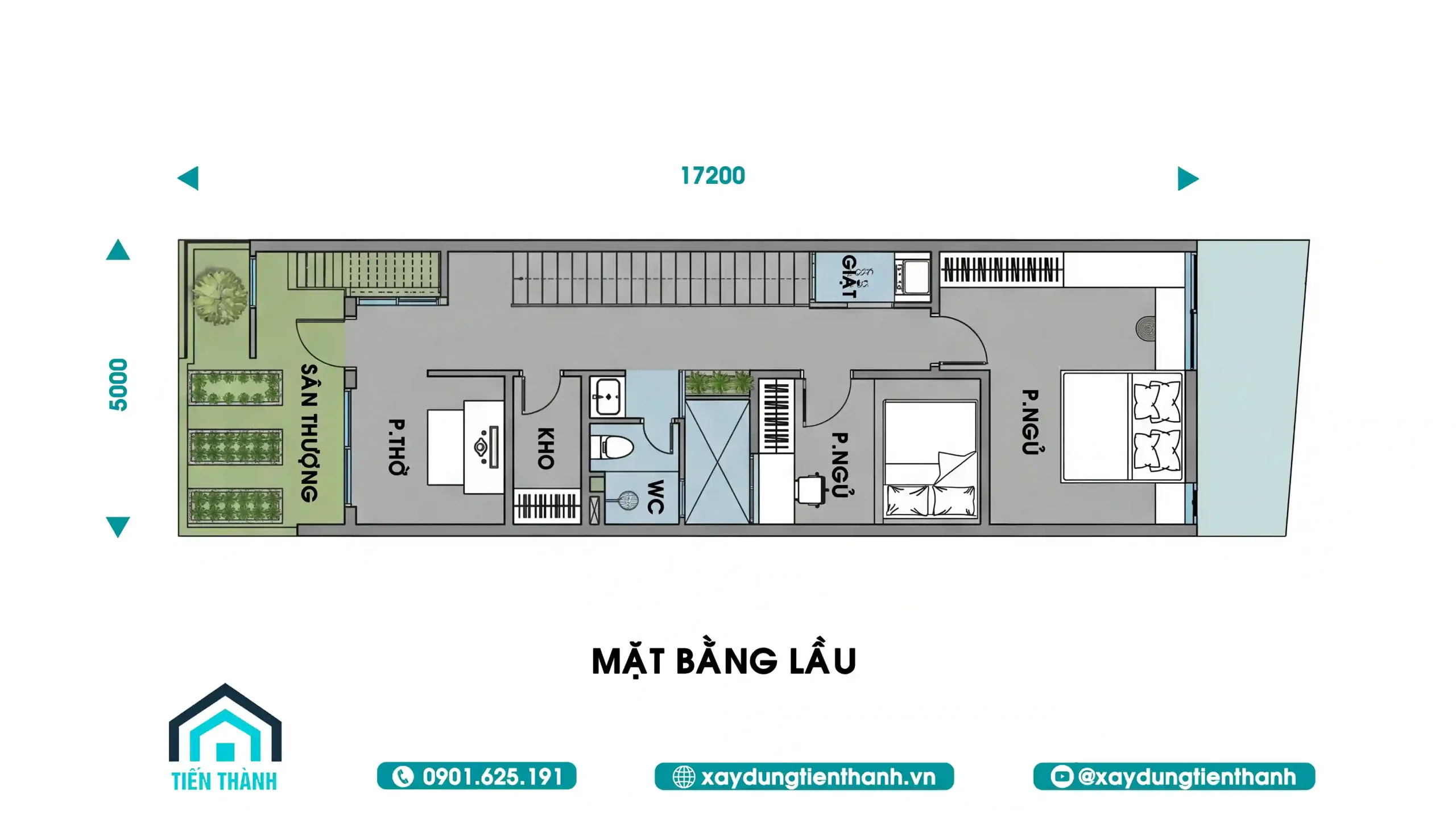 Nếu tầng trệt là nơi dành cho sự náo nhiệt và giao tiếp, thì tầng lầu trong mẫu 5×20 nhà 2 tầng mặt tiền 5m đẹp là “ốc đảo” riêng tư của các thành viên. Với chiều dài lên tới 20m, việc bố trí các phòng ngủ cần sự khéo léo để tránh cảm giác bị bí bách.