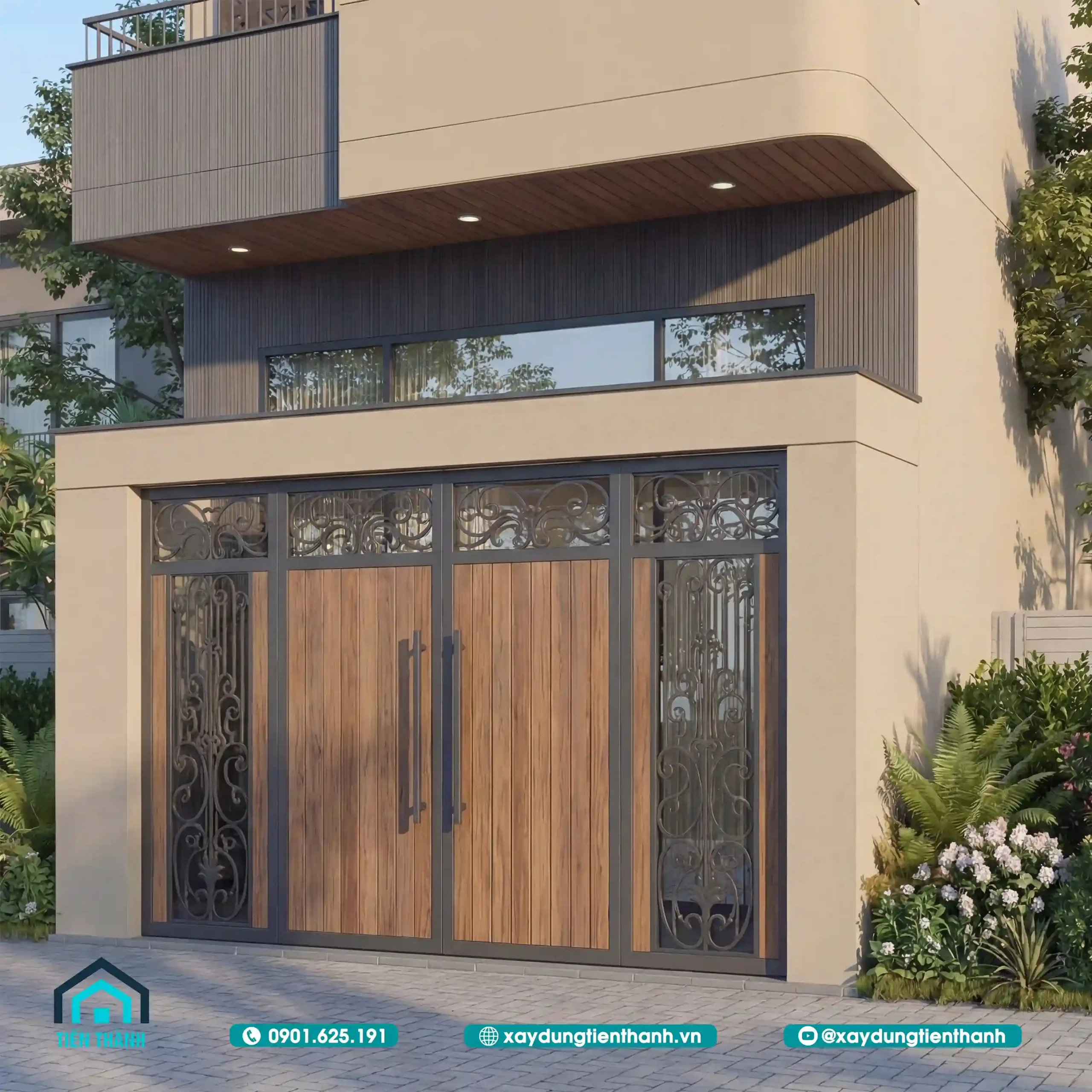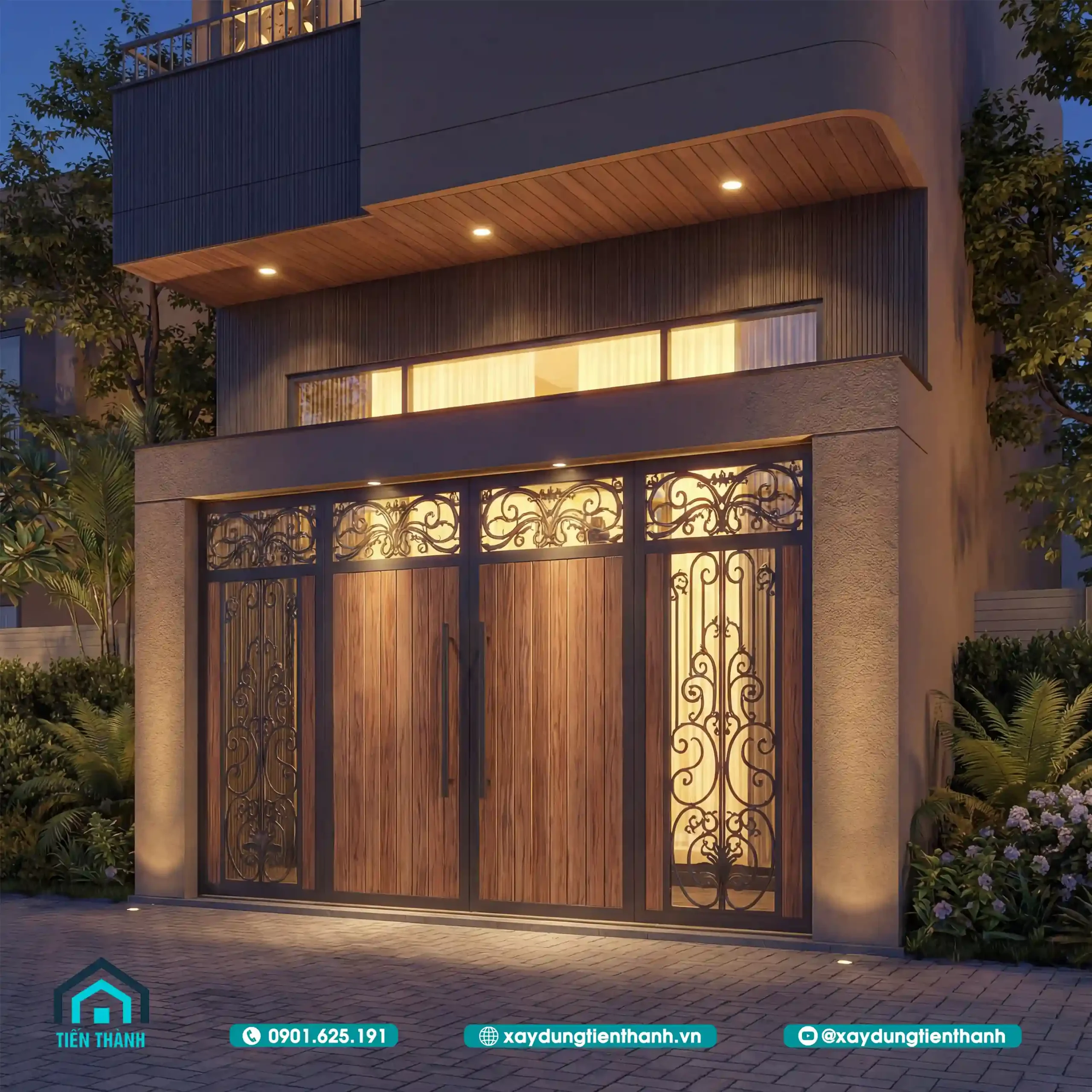 Điểm nhấn đầu tiên là hệ thống cổng. Thay vì những bức tường kín mít, kiến trúc sư sử dụng cổng sắt CNC hoa văn cổ điển kết hợp cùng các mảng gỗ tự nhiên. Điều này không chỉ bảo vệ an ninh mà còn tạo ra những khoảng hở cho luồng khí lưu thông.
