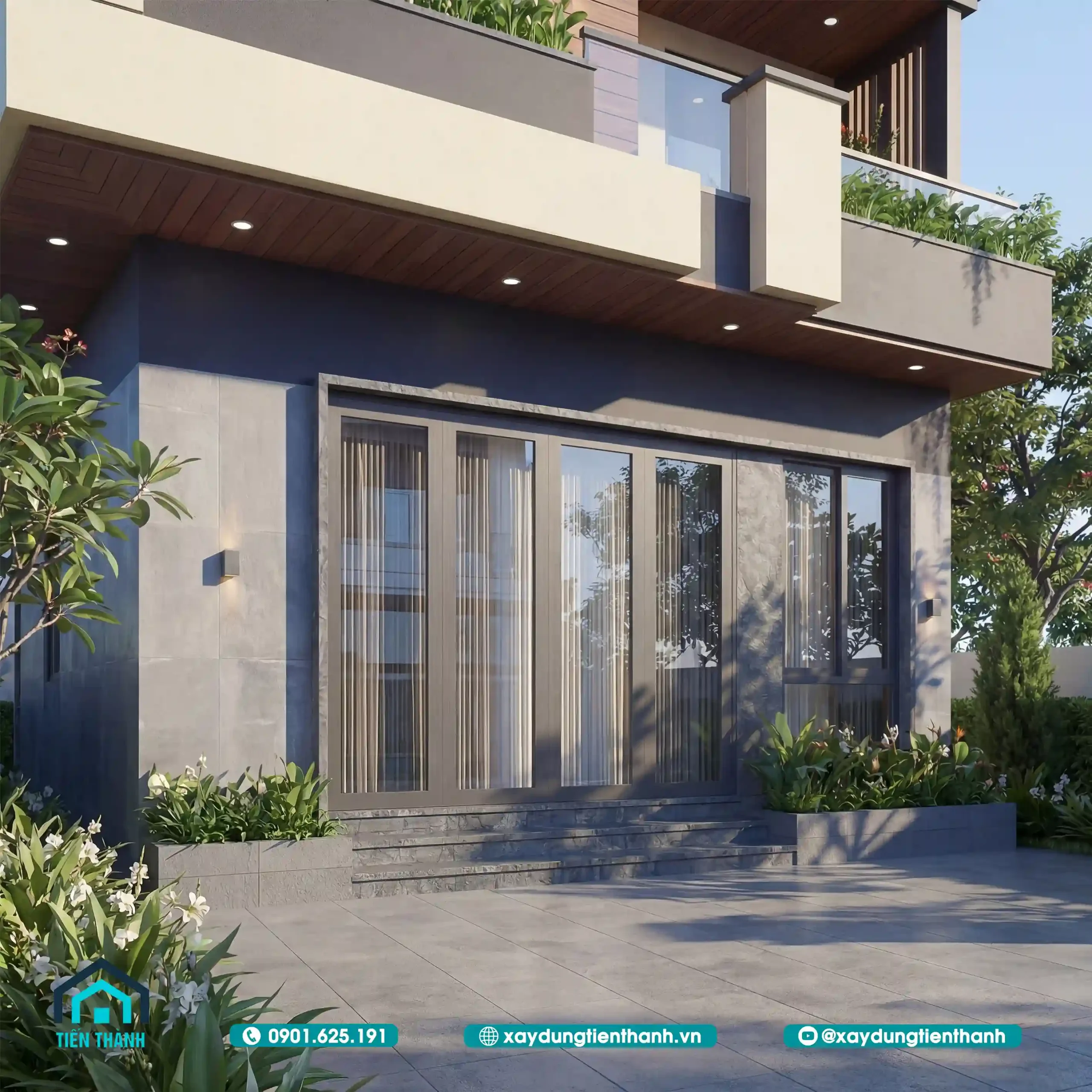 - 4 4.Phối cảnh ngoại thất ban ngày: Sự lên ngôi của vật liệu hiện đại