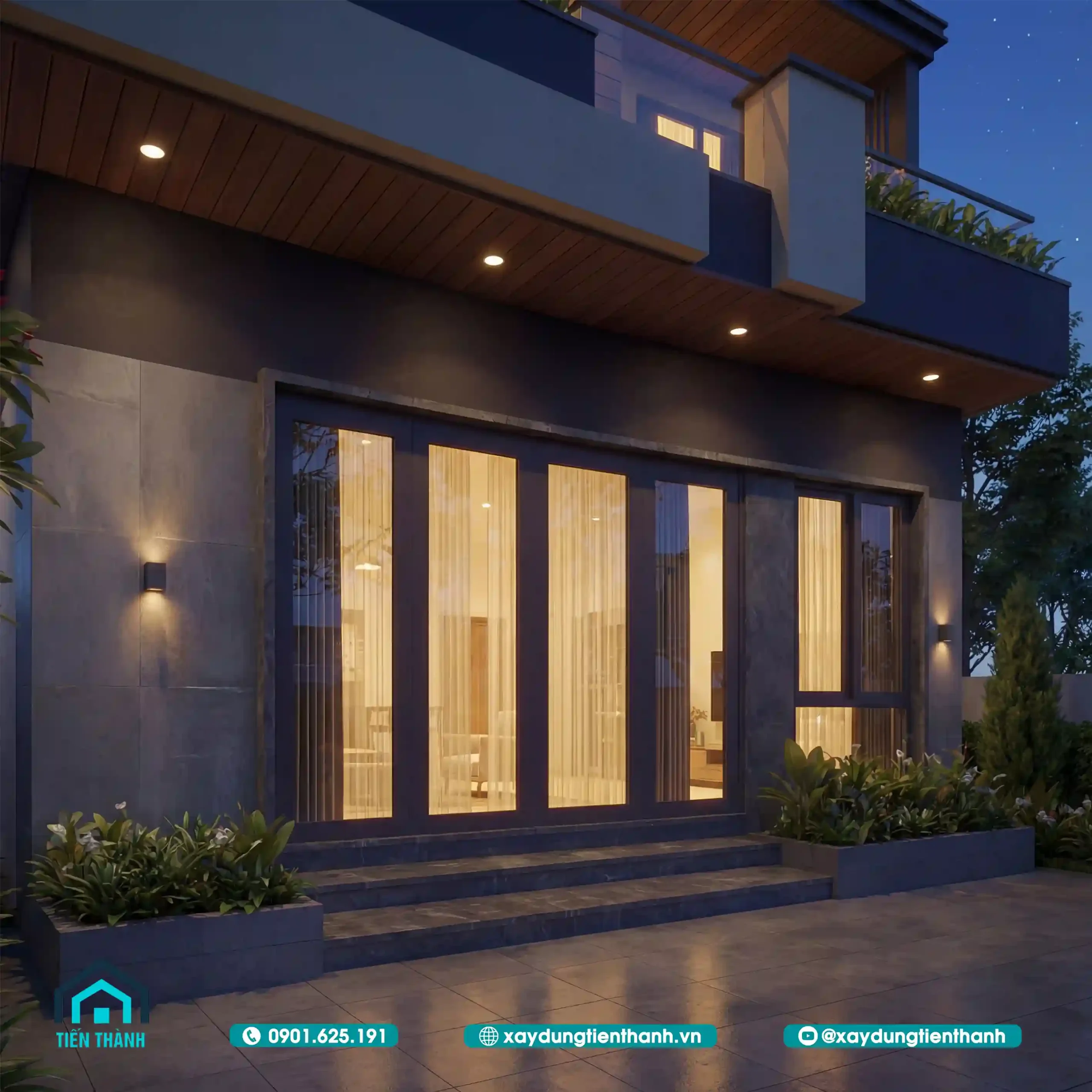 Khi màn đêm buông xuống, ngôi nhà trở nên rực rỡ nhờ cách bố trí đèn thông minh. Các dải đèn LED âm trần tại khu vực ban công và mái đua không chỉ cung cấp ánh sáng mà còn tạo ra những đường kẻ sắc nét, làm nổi bật phong cách tối giản (Minimalism) của công trình.