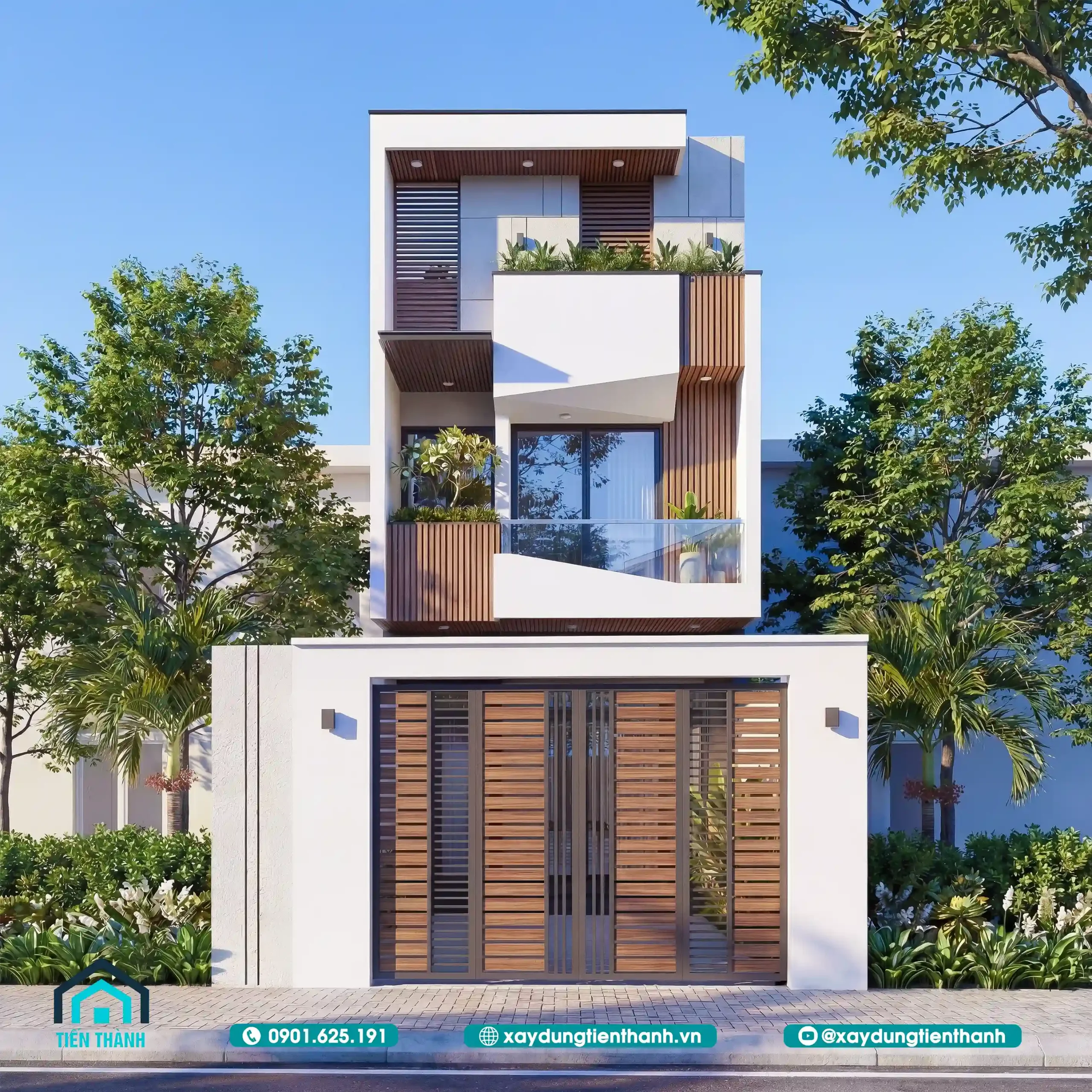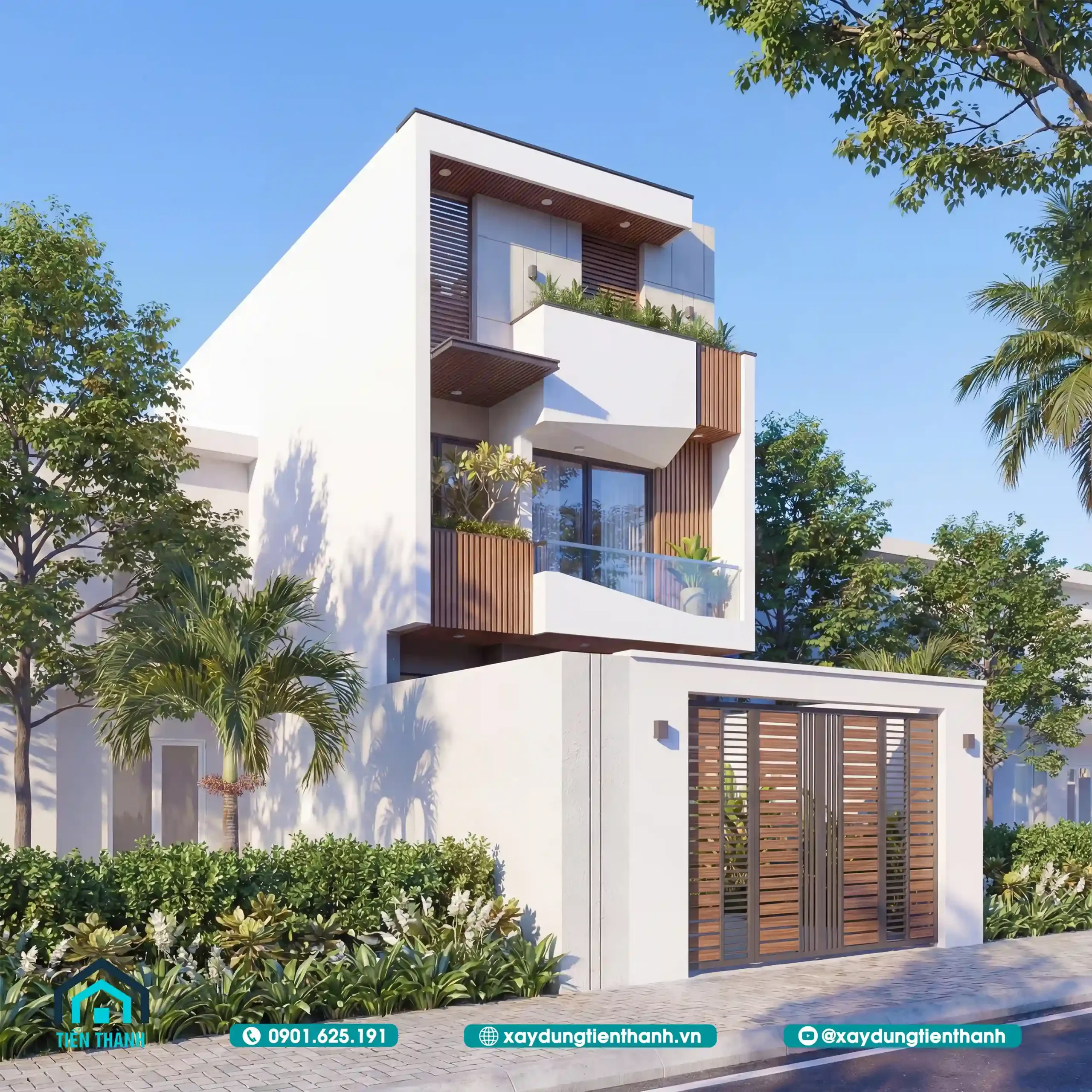 Mẫu thiết kế dưới đây thể hiện sự đột phá trong việc sử dụng hình khối và vật liệu. Ngôi nhà toát lên vẻ hiện đại, trẻ trung với tông màu trắng chủ đạo kết hợp cùng các mảng nhấn gỗ ấm áp.