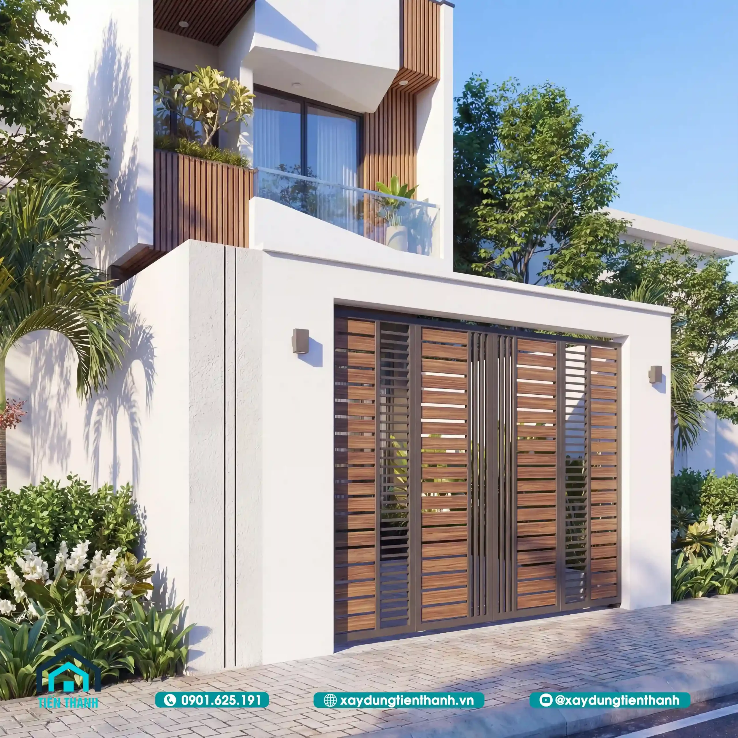Phối cảnh chính diện bản vẽ 3d nhà ống 2 tầng 5×20 với hệ cổng gỗ hiện đại sang trọng.