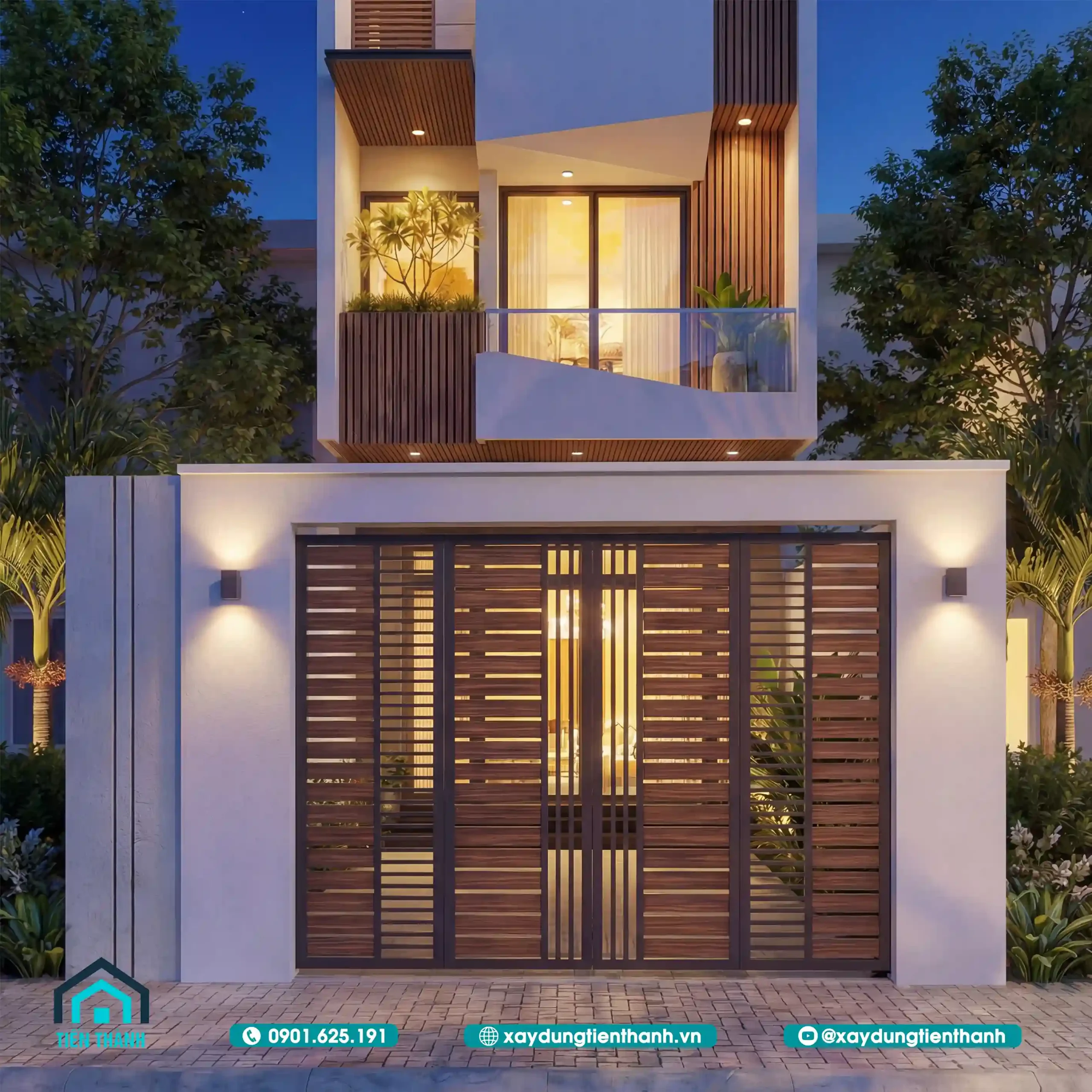 Ánh sáng là linh hồn của kiến trúc. Trong bản vẽ 3d nhà ống 2 tầng 5×20, phối cảnh ban đêm giúp gia chủ thấy rõ sự ấm cúng và đẳng cấp của ngôi nhà.