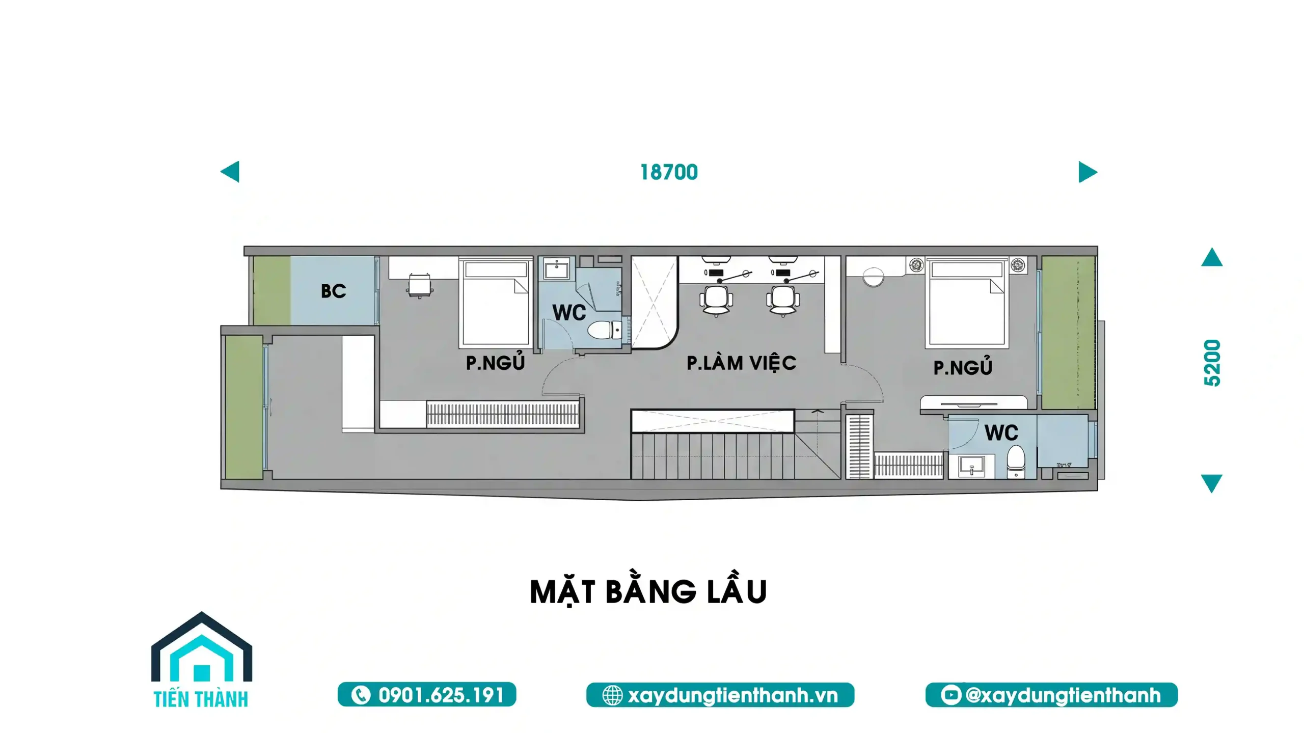 Tiếp nối sự tiện nghi của tầng trệt, bản vẽ 3d nhà ống 2 tầng 5×20 dành trọn vẹn không gian tầng lầu cho việc nghỉ ngơi và làm việc. Đây là khu vực riêng tư, cần sự yên tĩnh và thông thoáng tuyệt đối.