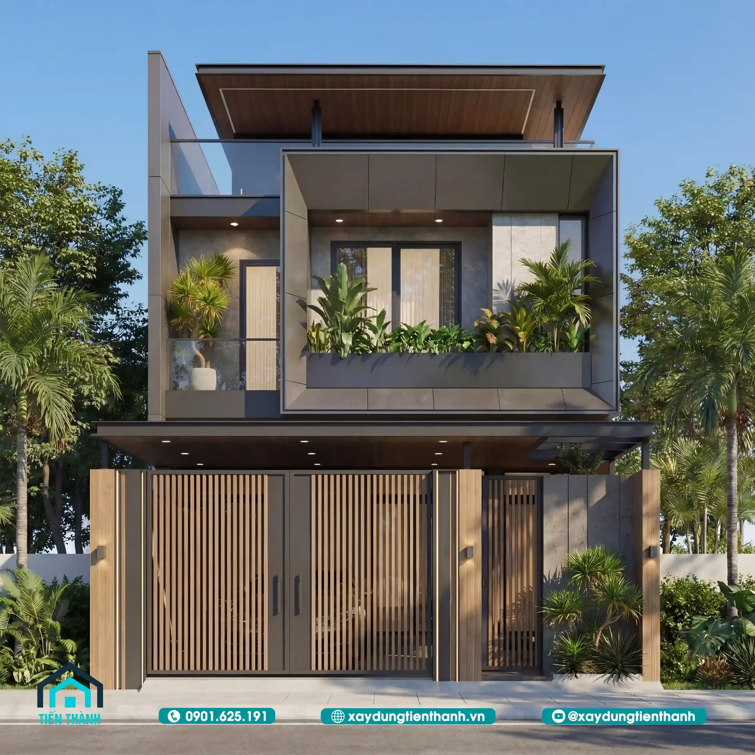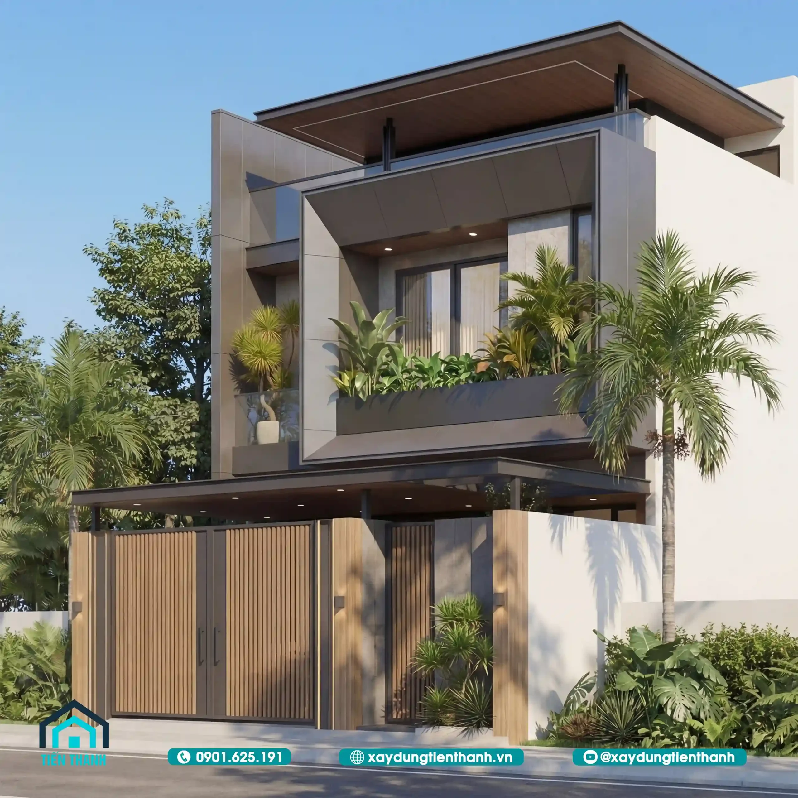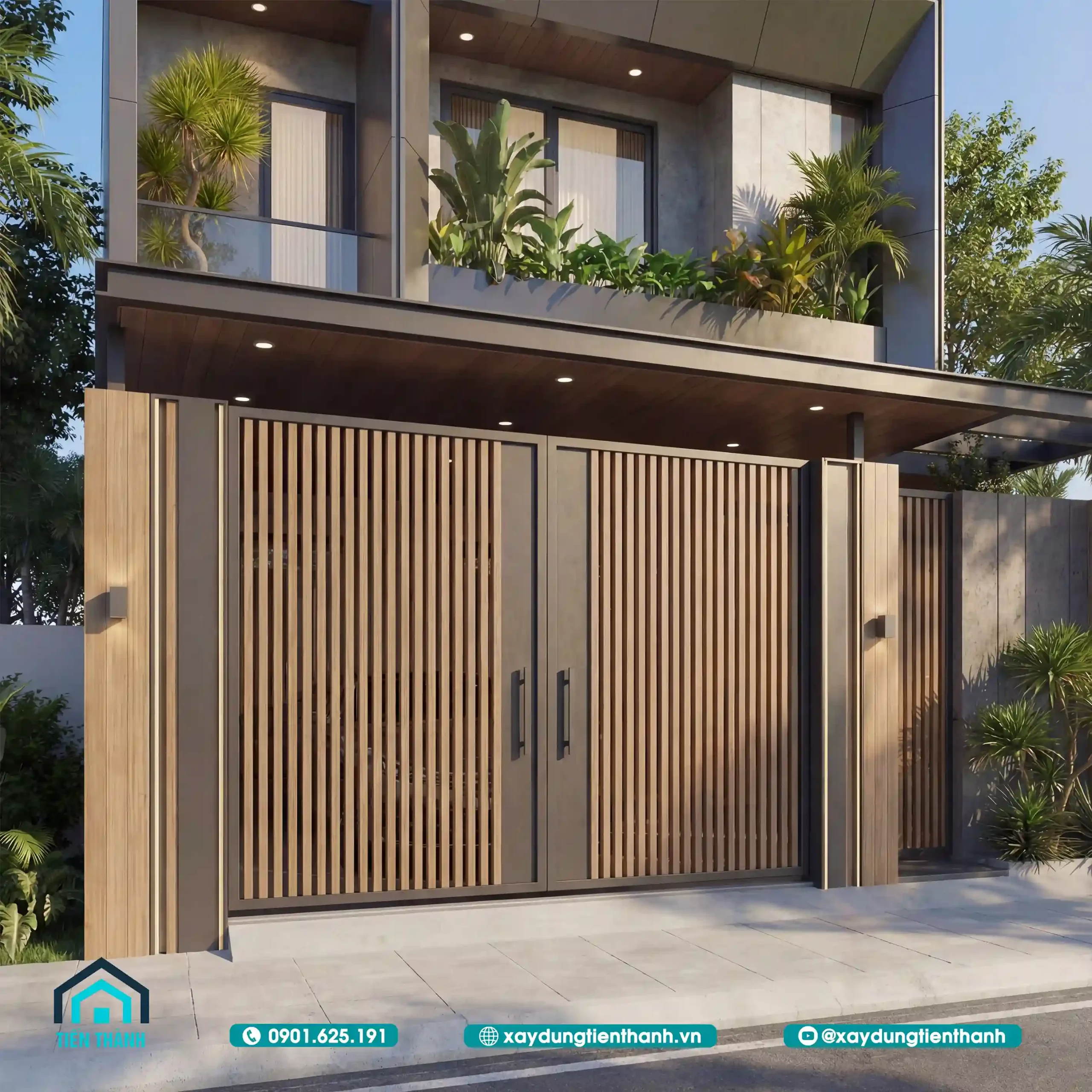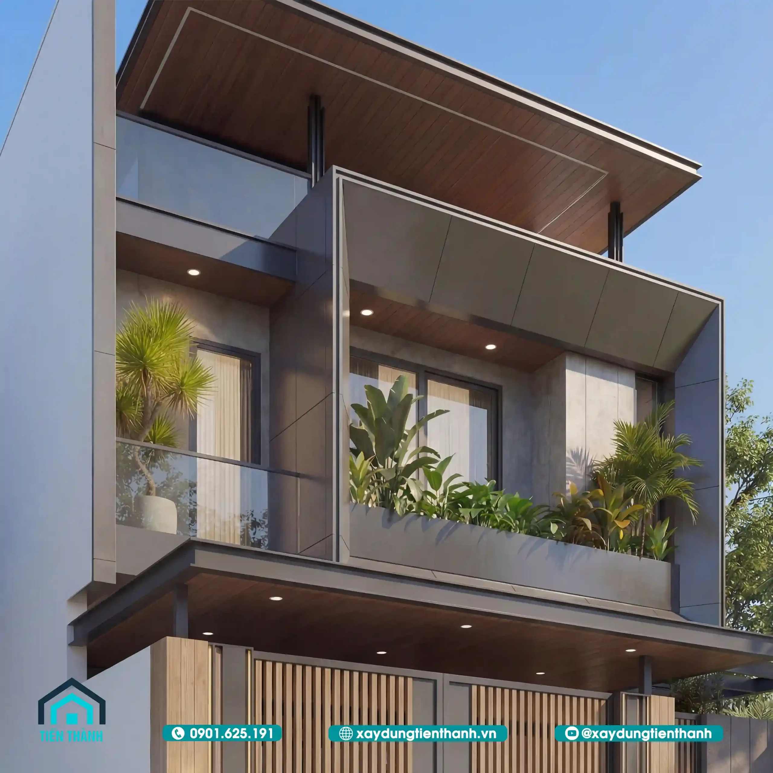 Ở góc nhìn nghiêng, ta có thể thấy rõ cấu trúc tầng mái và các khoảng giật cấp của ban công. Thiết kế này giúp ngôi nhà không bị khô cứng, tạo ra những khoảng đổ bóng tự nhiên giúp giảm nhiệt cho các phòng bên trong vào buổi chiều. Hệ thống trần hiên được ốp gỗ đồng điệu với cổng chính, tạo nên một chỉnh thể thống nhất từ dưới lên trên.