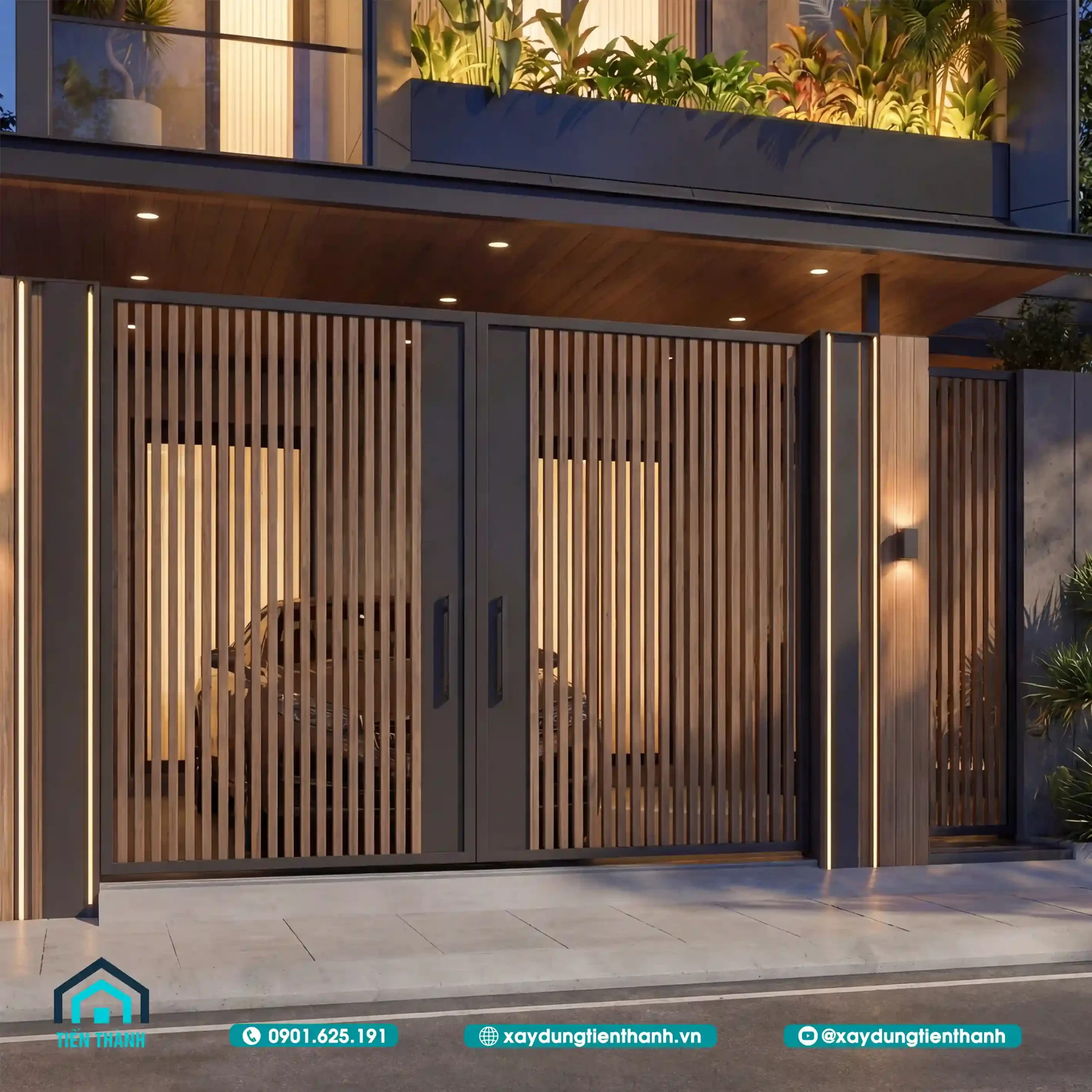 Cận cảnh hệ cổng gỗ và giải pháp chiếu sáng đèn Led chạy dọc hiện đại.
