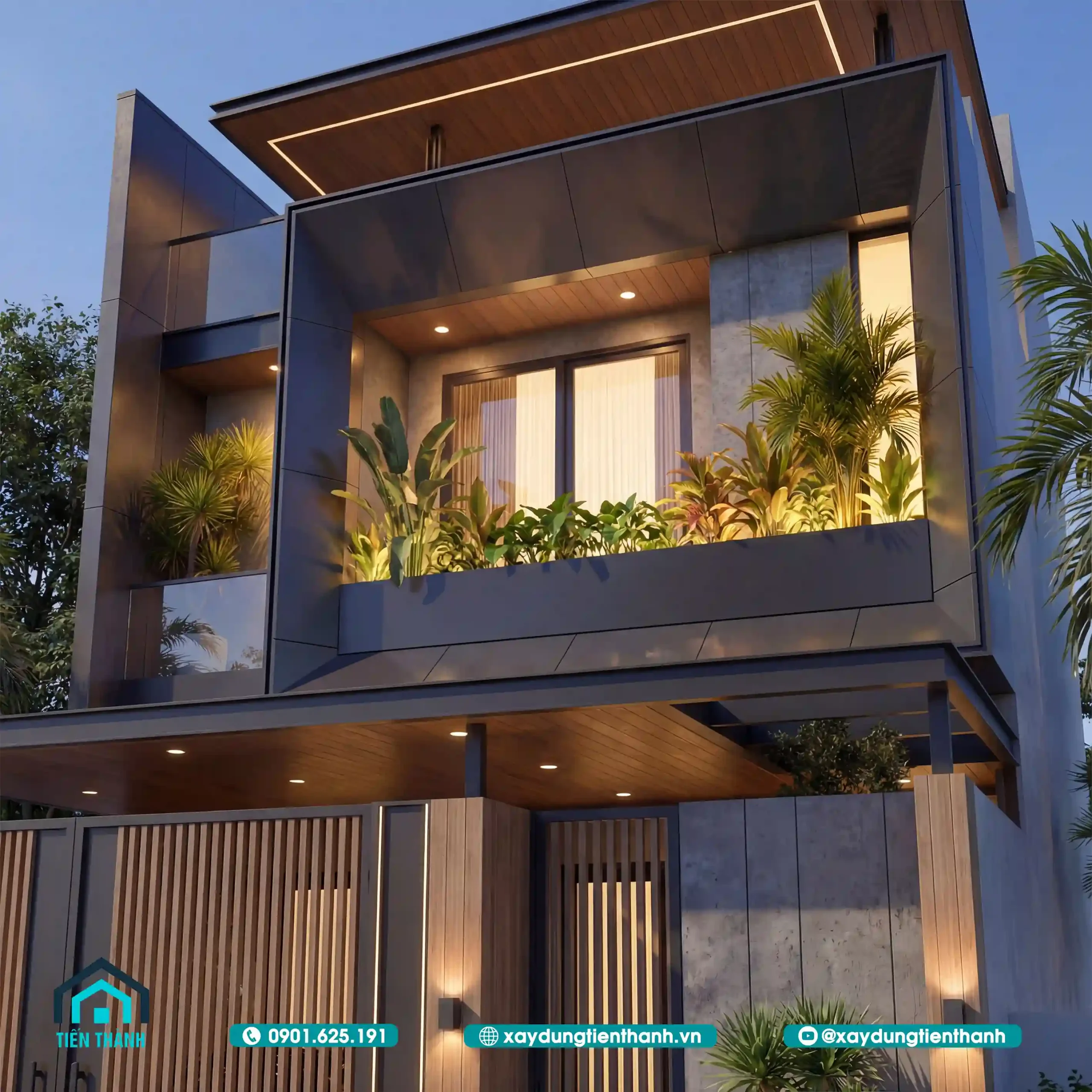 Phối cảnh mặt đứng ban đêm làm nổi bật các loại vật liệu hoàn thiện cao cấp.