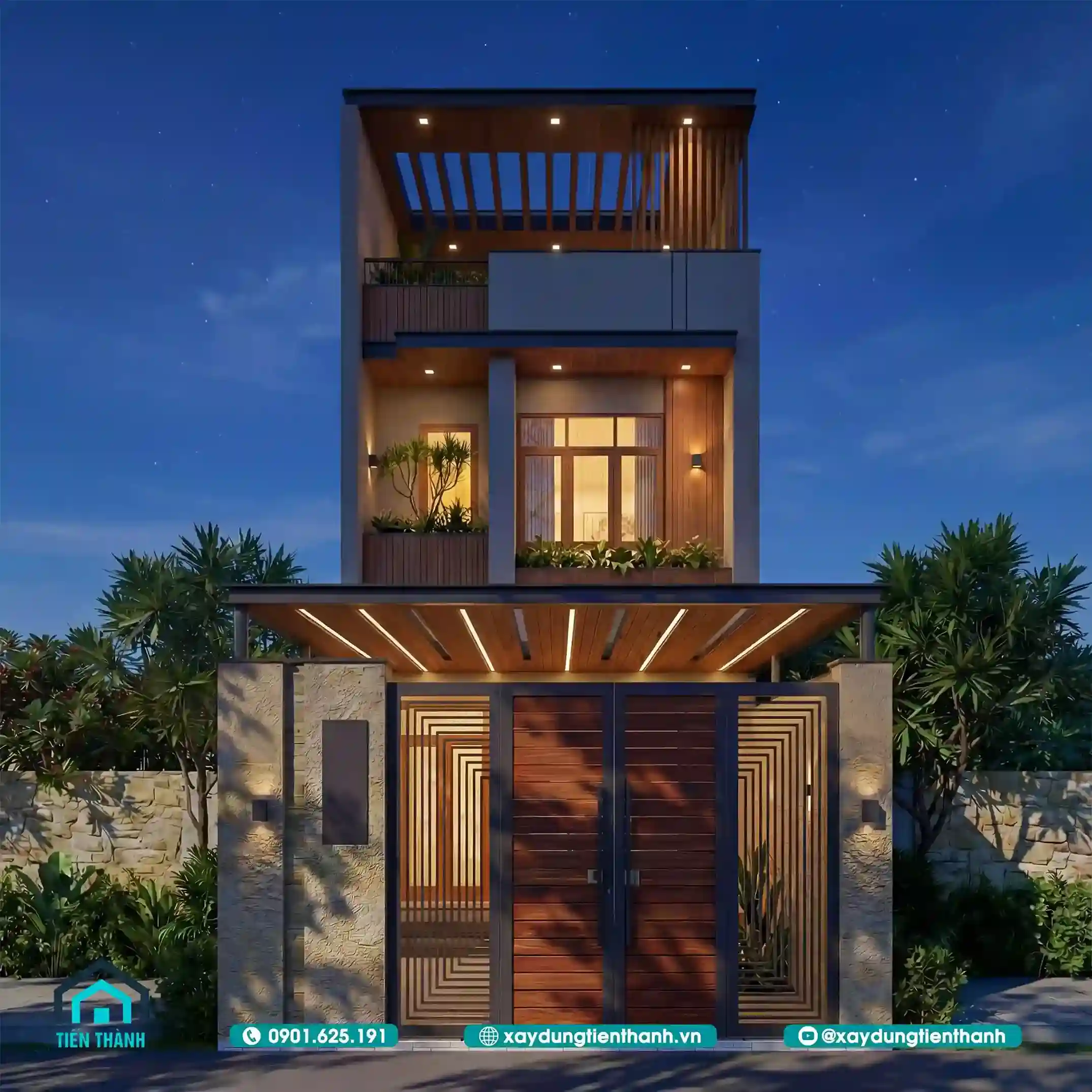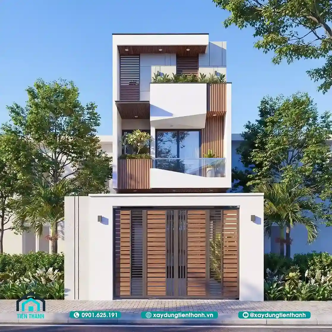 Mẫu nhà phố ba tầng hiện đại với ban công cây xanh và cửa gỗ ấm cúng.