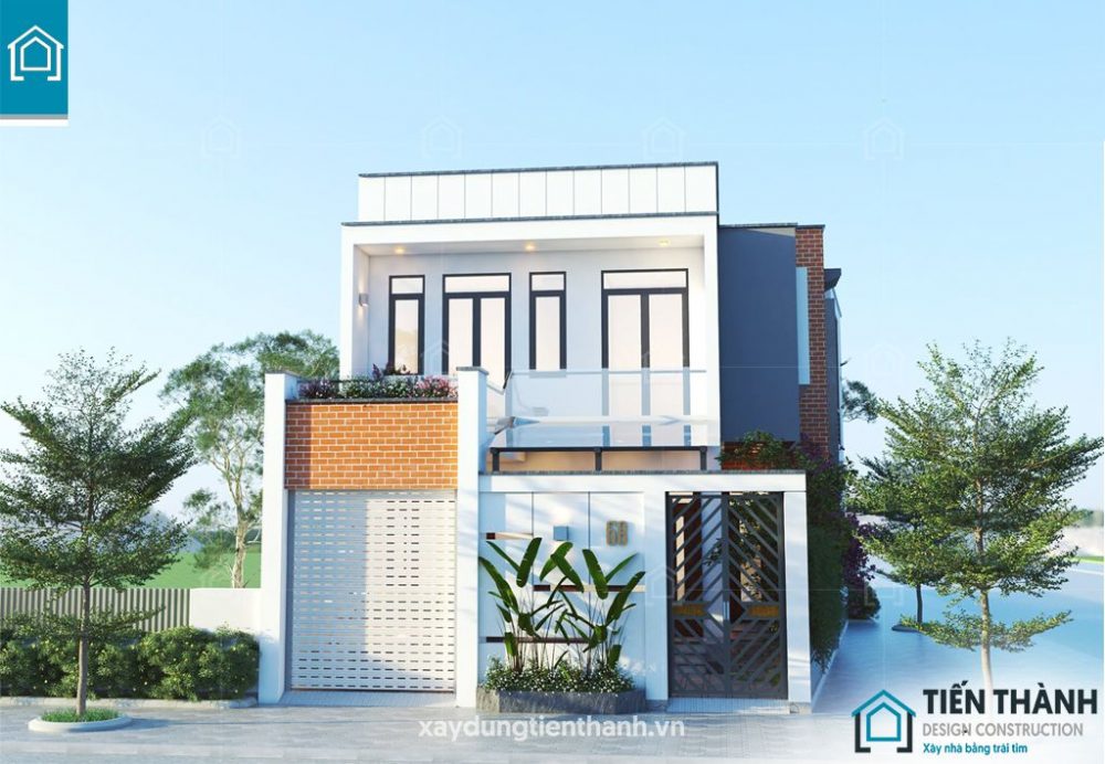 Phối cảnh mặt tiền mẫu nhà phố hai tầng phong cách hiện đại với thiết kế hình khối tối giản.