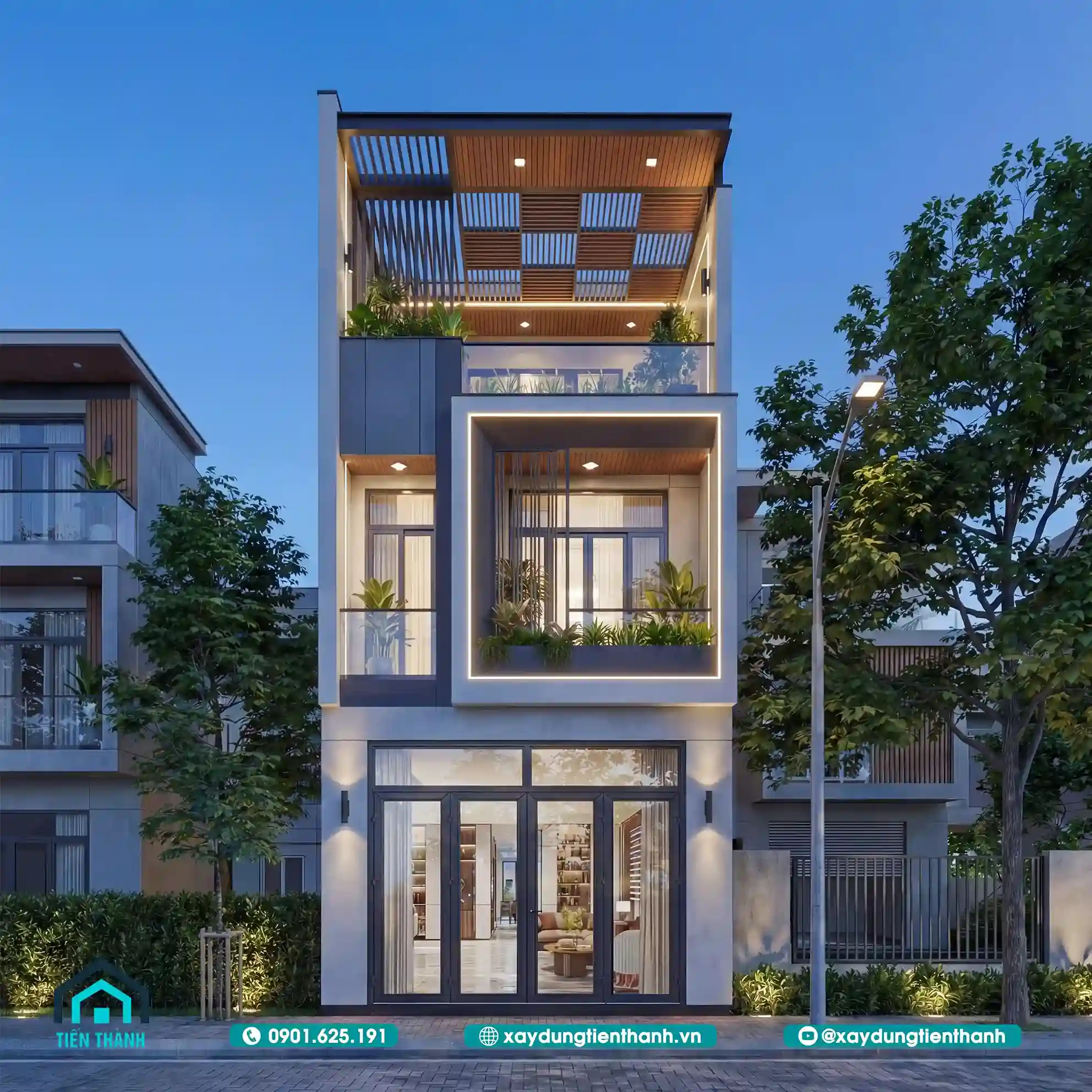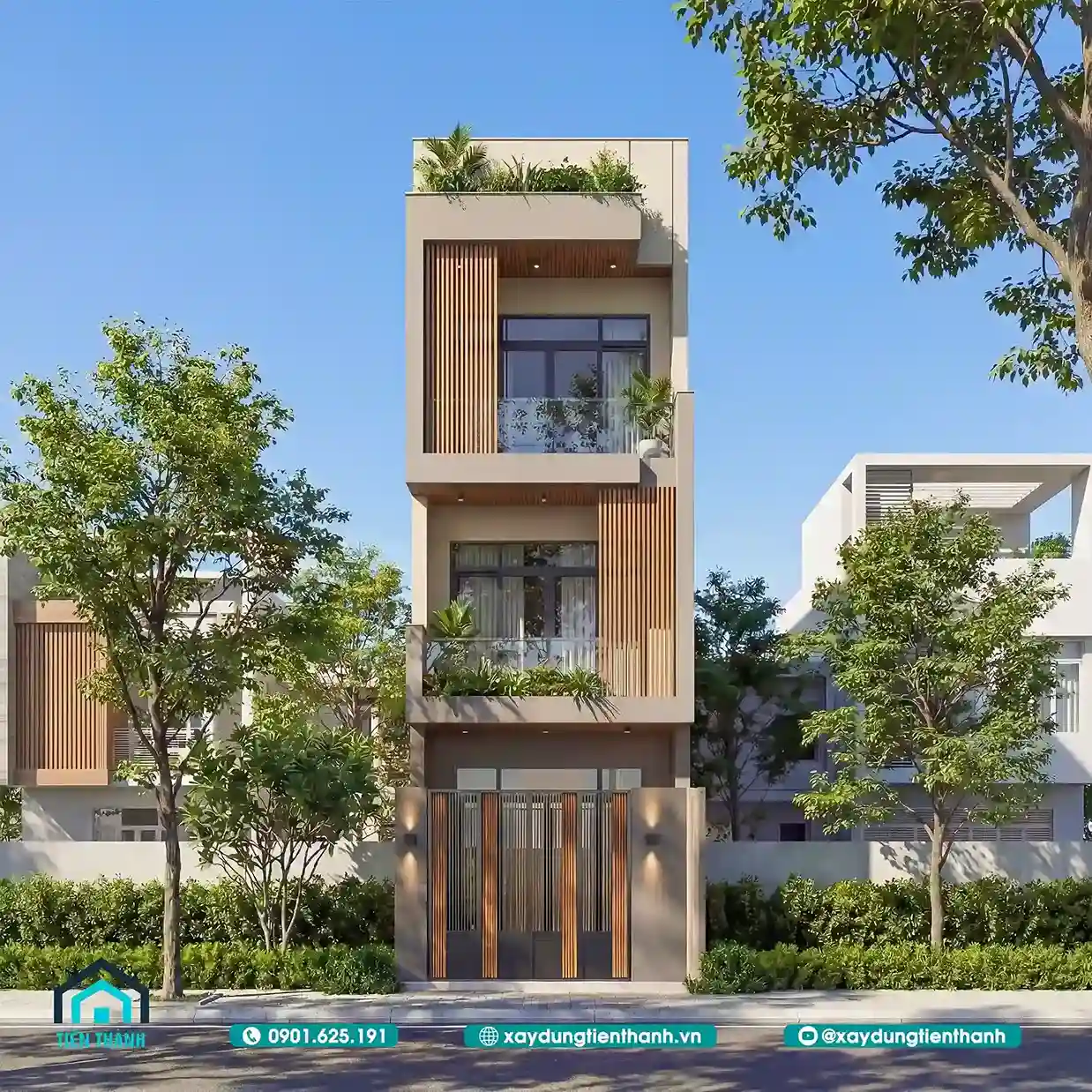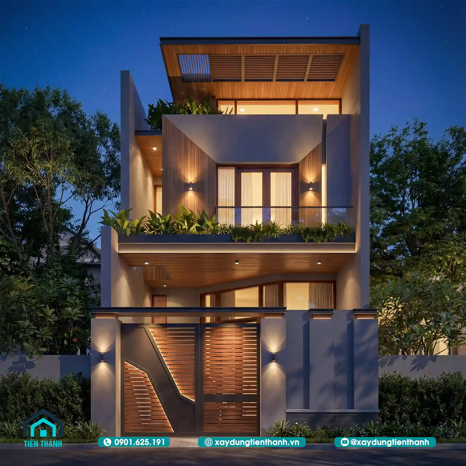 Mẫu nhà phố ba tầng mặt tiền hẹp tối ưu không gian ánh sáng bằng hệ lam gỗ.