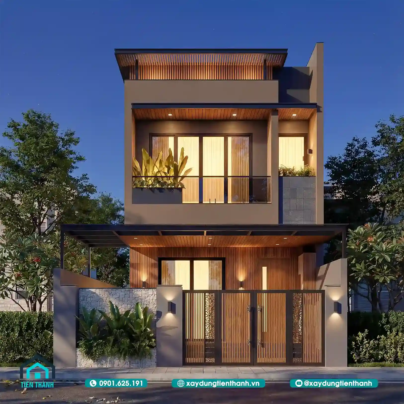 Kiến trúc nhà ống hai tầng có ban công xanh mát và cổng gỗ tinh tế hiện đại.