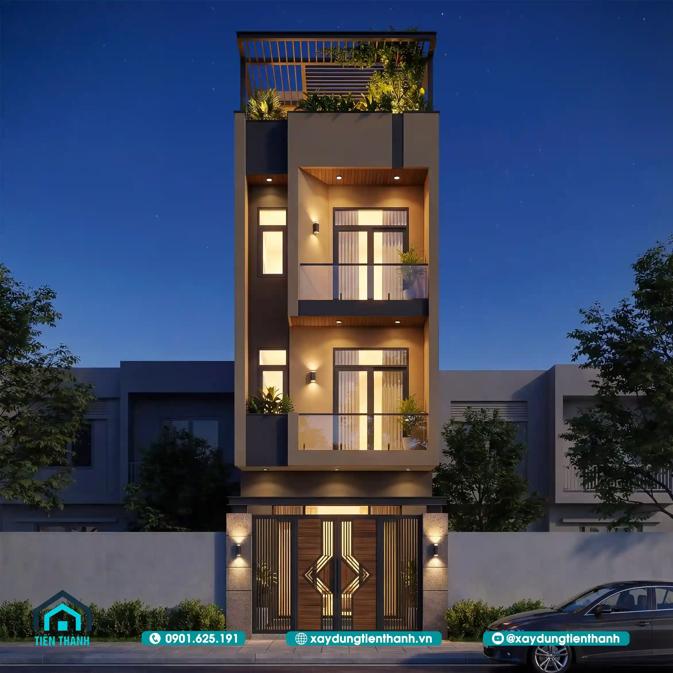 Mẫu thiết kế nhà phố hiện đại với hệ thống đèn chiếu sáng sang trọng và đẳng cấp.