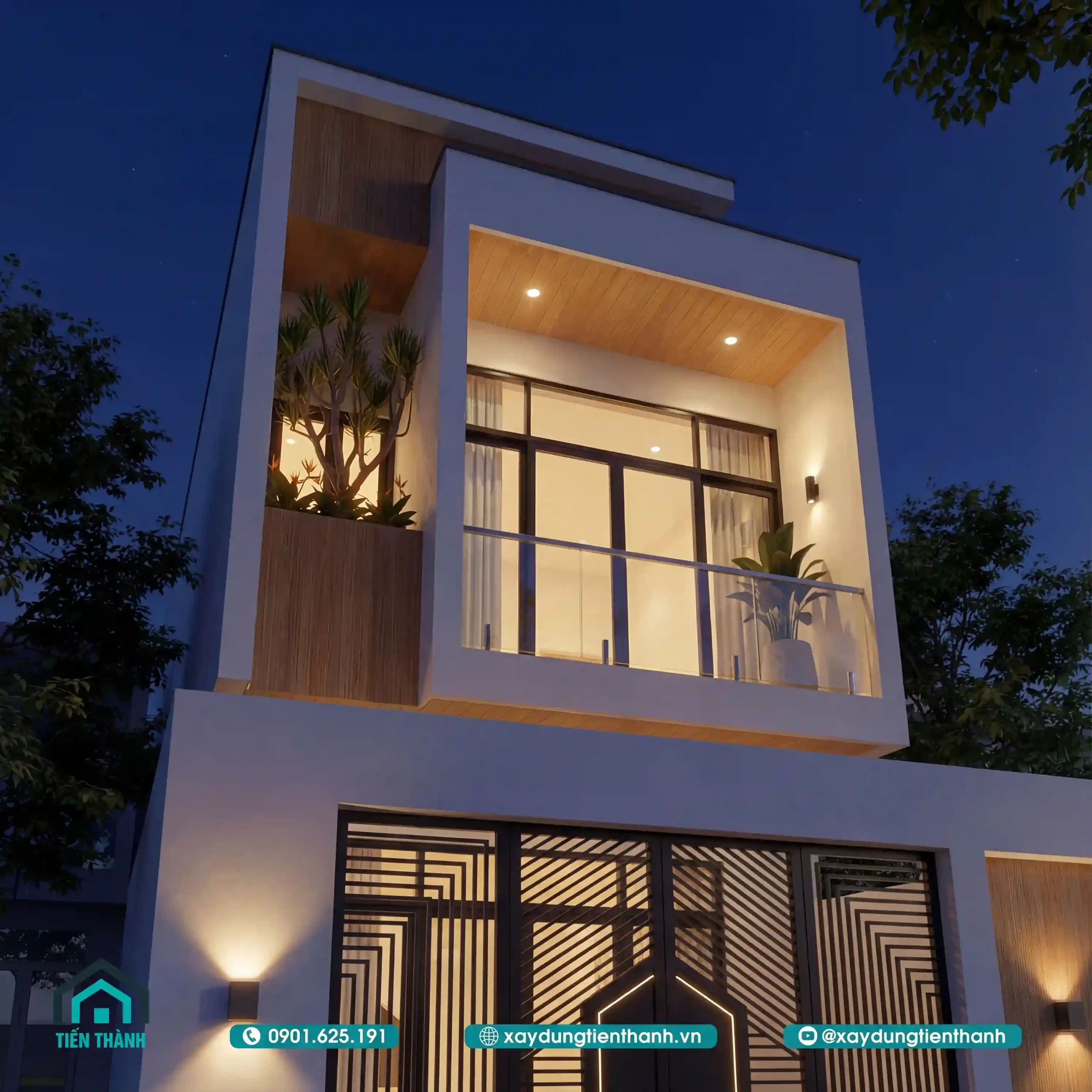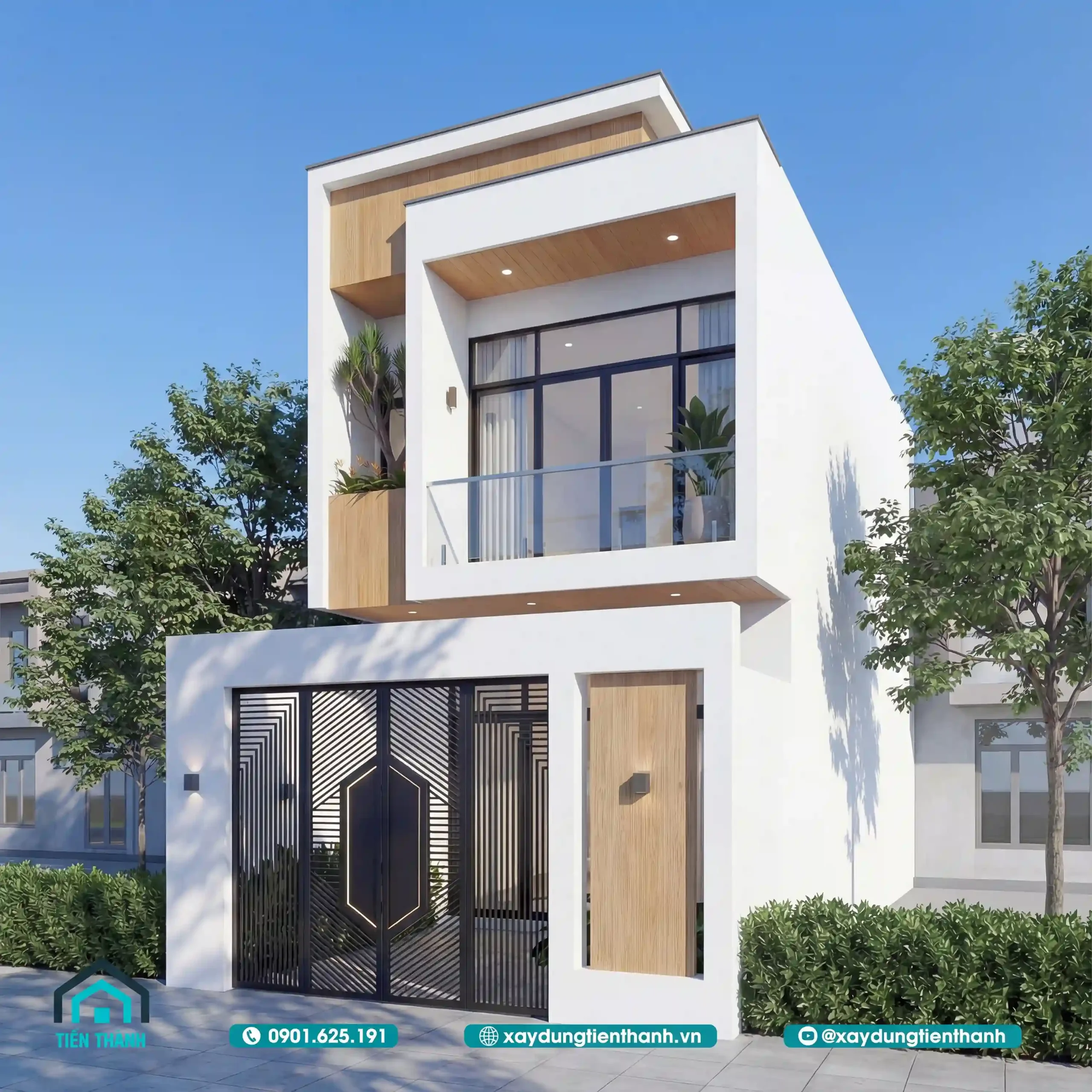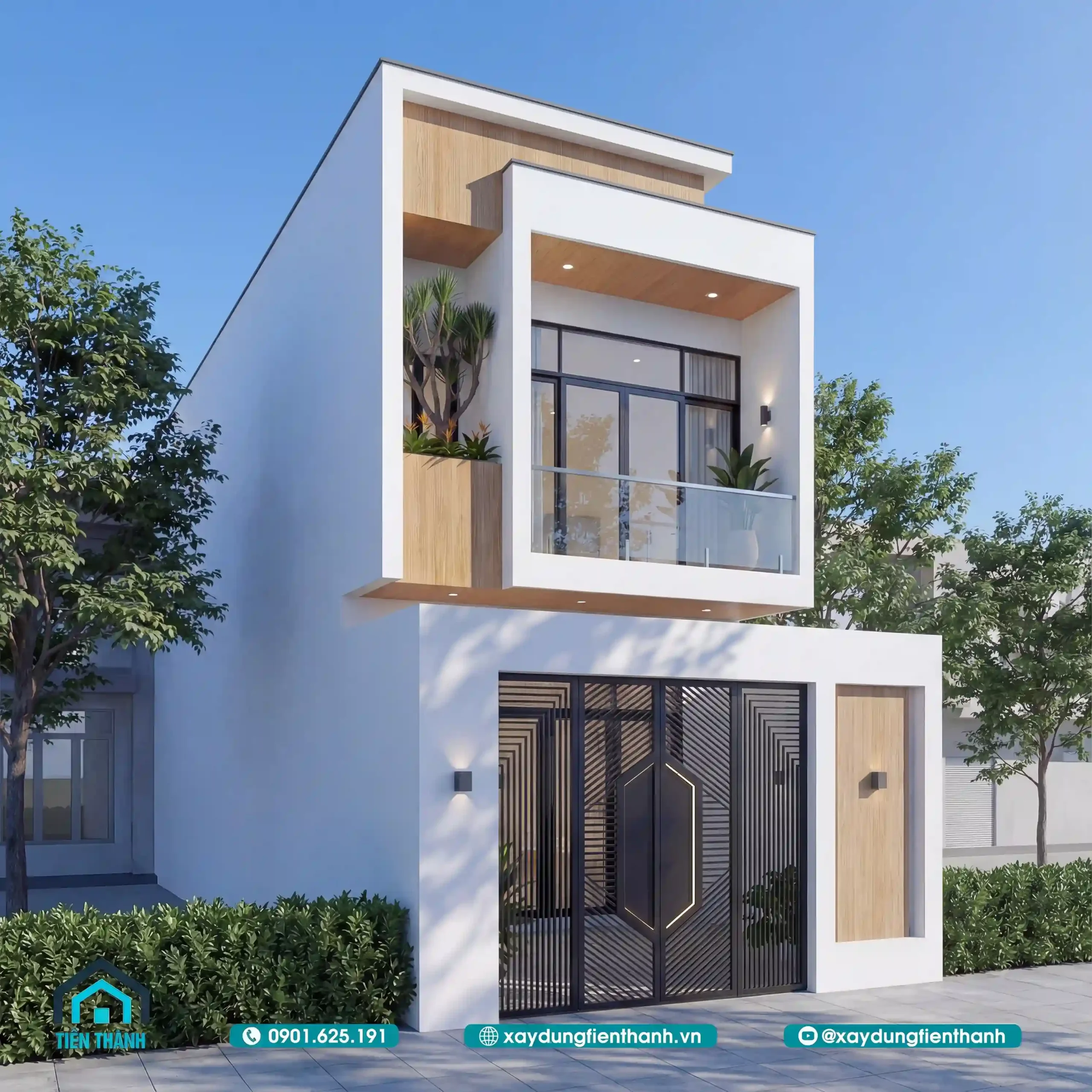 Kiến trúc nhà ống tối giản có điểm nhấn gỗ ốp trần ban công và bồn cây xanh.