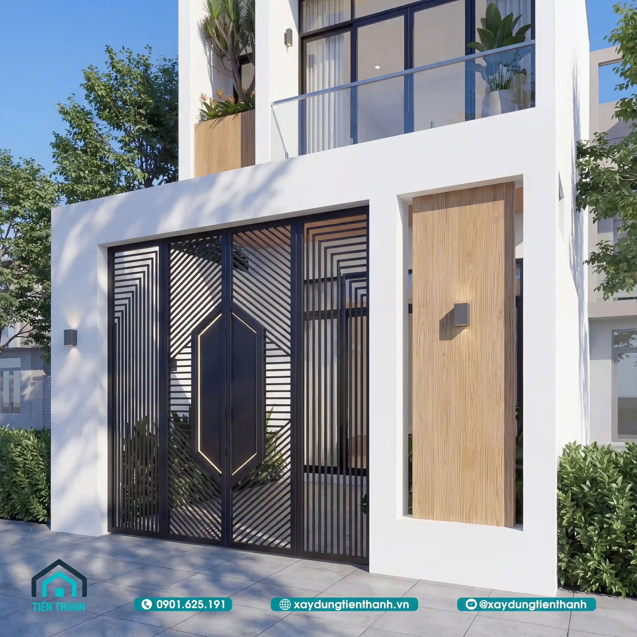 Mặt tiền được chia làm hai phần rõ rệt: tầng trệt với hệ cổng sắt nghệ thuật cắt CNC tinh xảo, và tầng lầu với ban công kính rộng mở. Sự đối lập giữa sắc trắng chủ đạo và tông màu trầm của gỗ mang lại cảm giác ấm cúng nhưng không kém phần sang trọng.