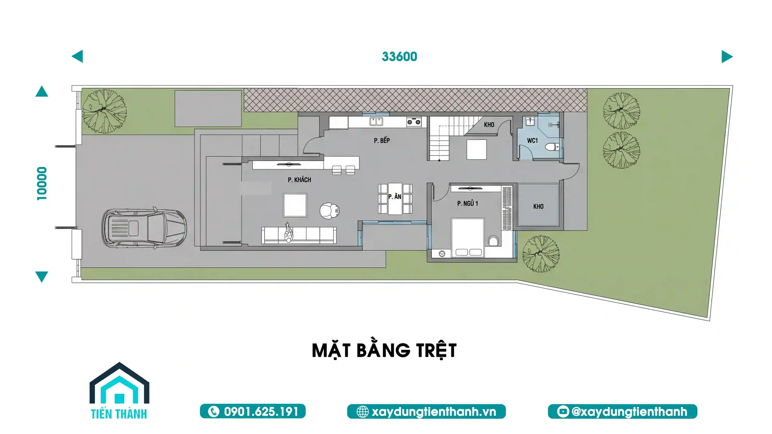 Mặt bằng trệt bố trí khoa học với phòng khách, bếp và một phòng ngủ tiện nghi
