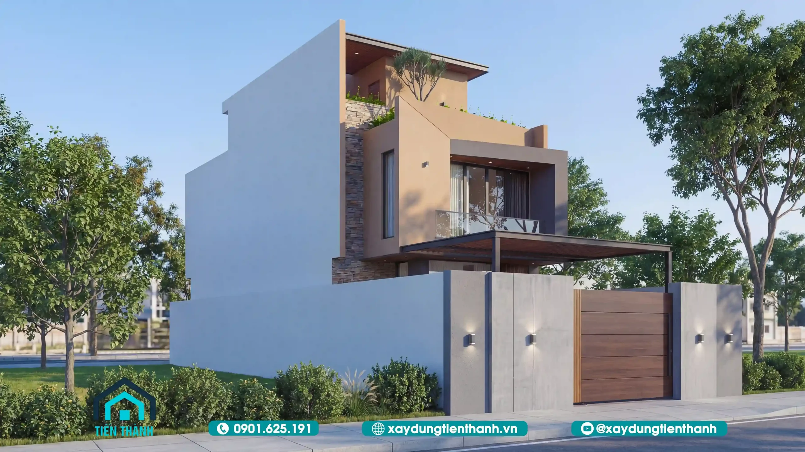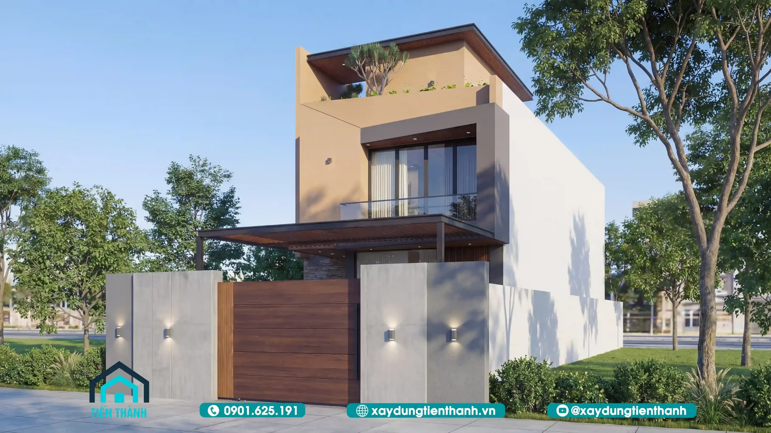 Nhà phố hiện đại hai tầng với tông màu cam đất, cổng gỗ và sân thượng xanh mát.