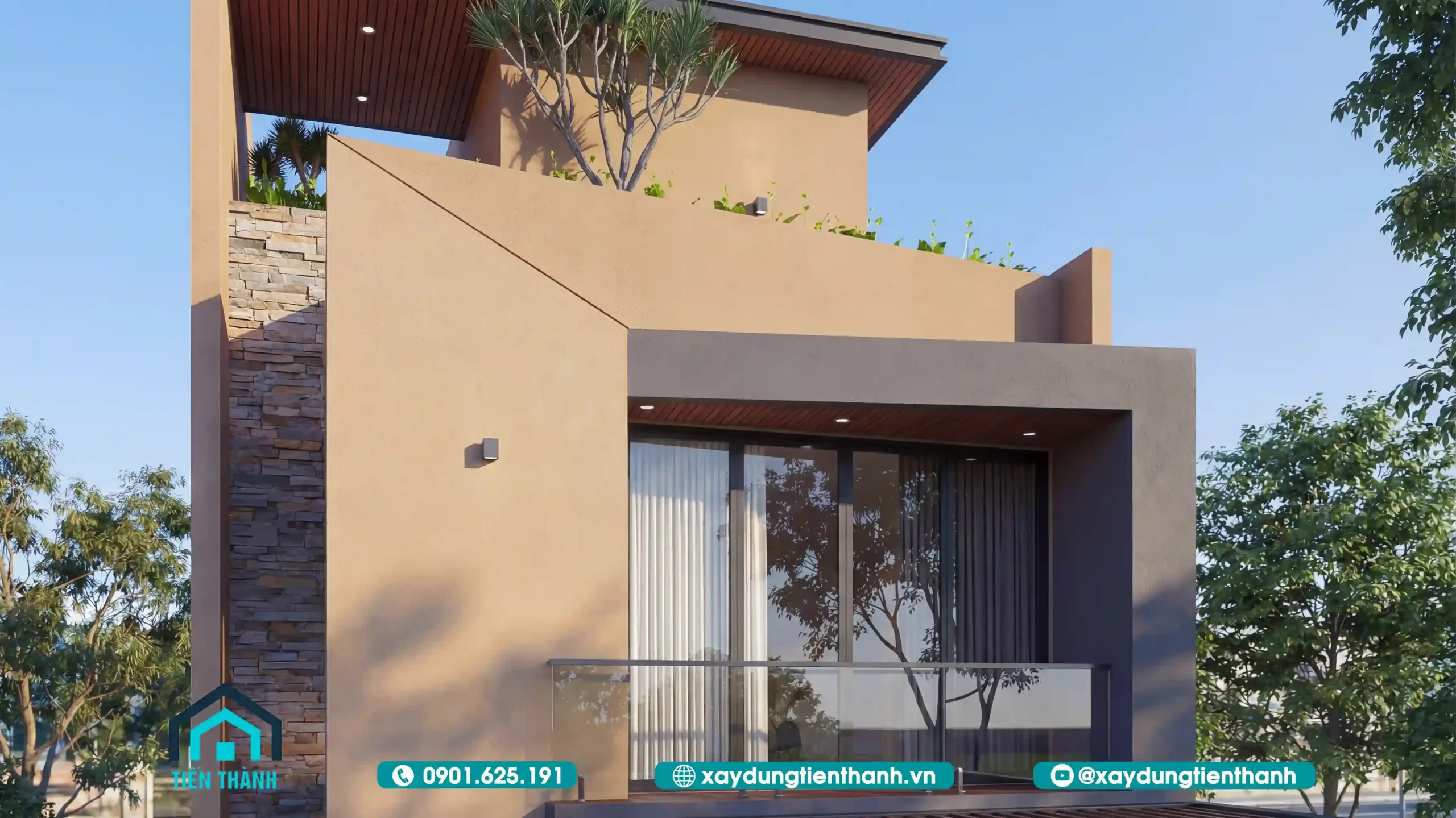 Việc sử dụng kính cường lực cho lan can và cửa sổ không chỉ giúp ngôi nhà trông rộng rãi hơn mà còn tạo ra điểm nhấn sang trọng. Bên cạnh đó, các loại đá trang trí, gạch thẻ hay gỗ nhựa ngoài trời cũng được vận dụng khéo léo để tăng tính thẩm mỹ.