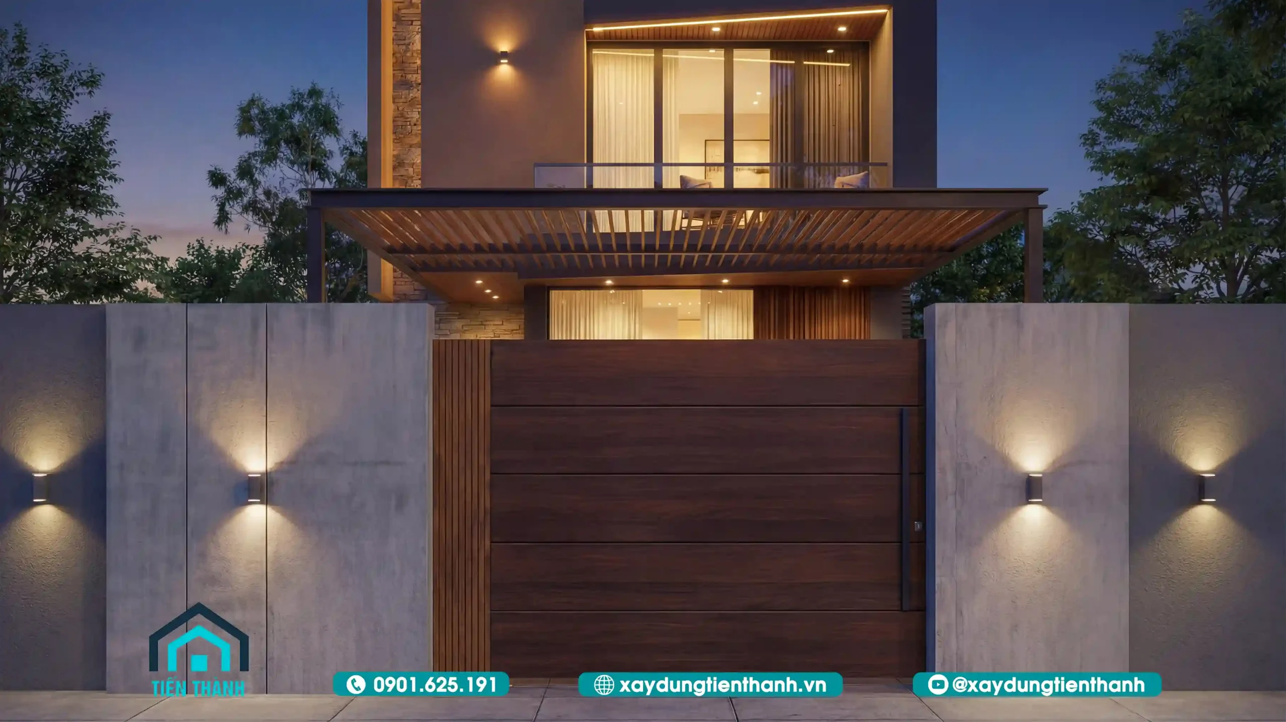Thay vì những bộ cổng sắt hoa văn uốn lượn cầu kỳ, các kiến trúc sư ưu tiên sử dụng các thanh gỗ nhựa (WPC) kết hợp với khung thép sơn tĩnh điện. Màu nâu ấm của gỗ đối lập với sự lạnh lùng của các mảng tường bê tông xám tạo nên sức hút thị giác cực lớn.