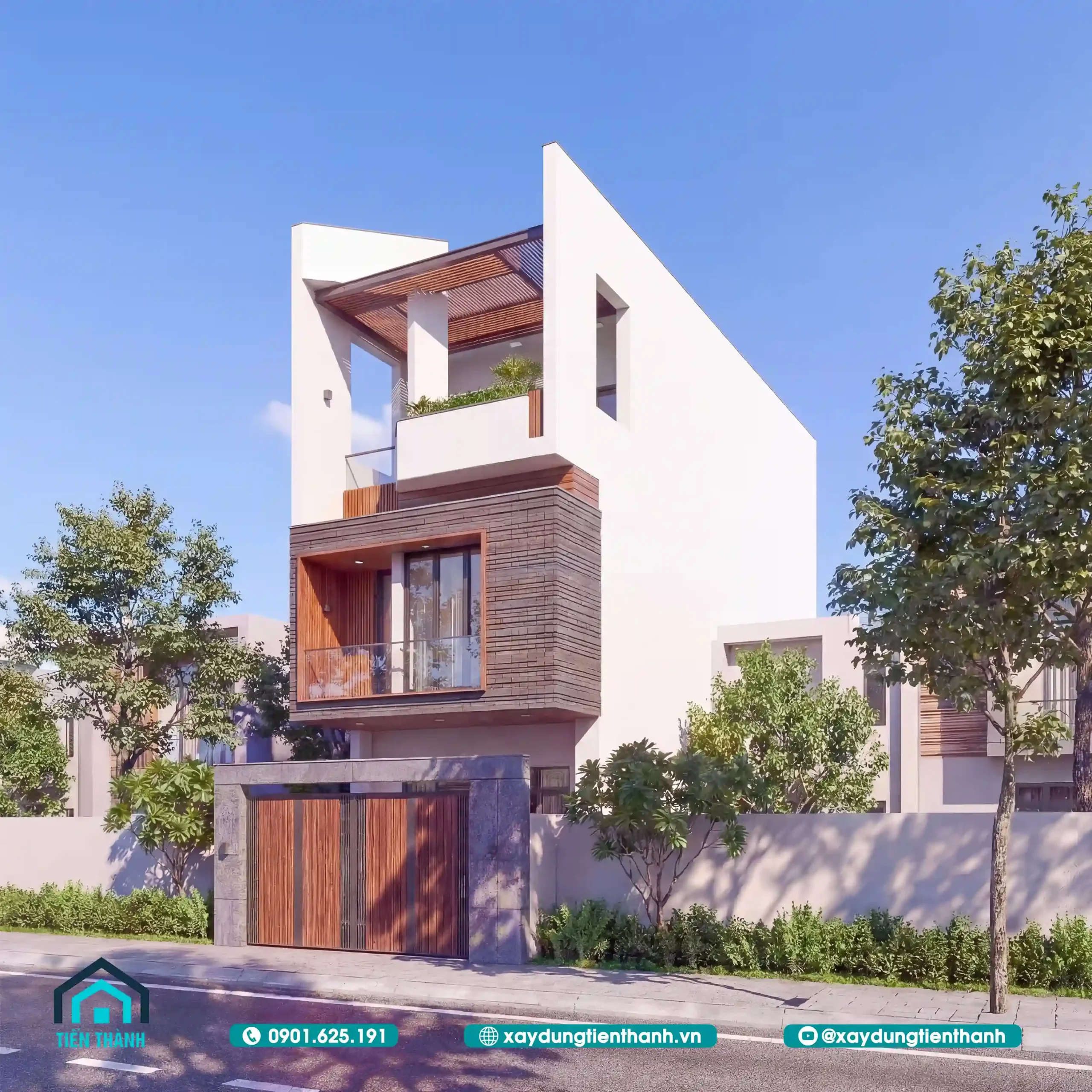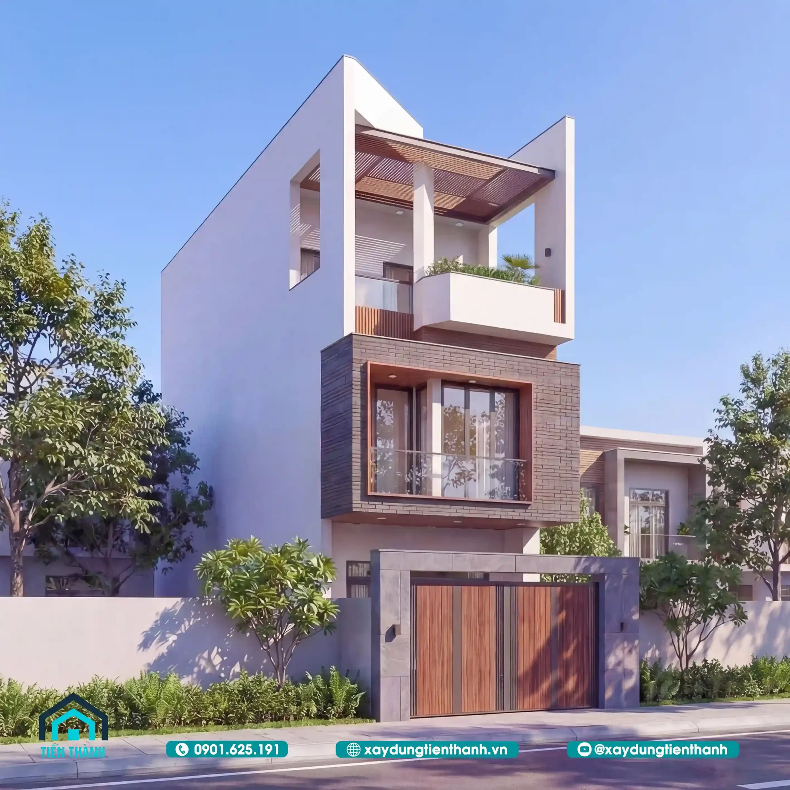 Phối cảnh mặt tiền ban ngày với thiết kế hiện đại, sử dụng vật liệu gỗ sang trọng ấn tượng.