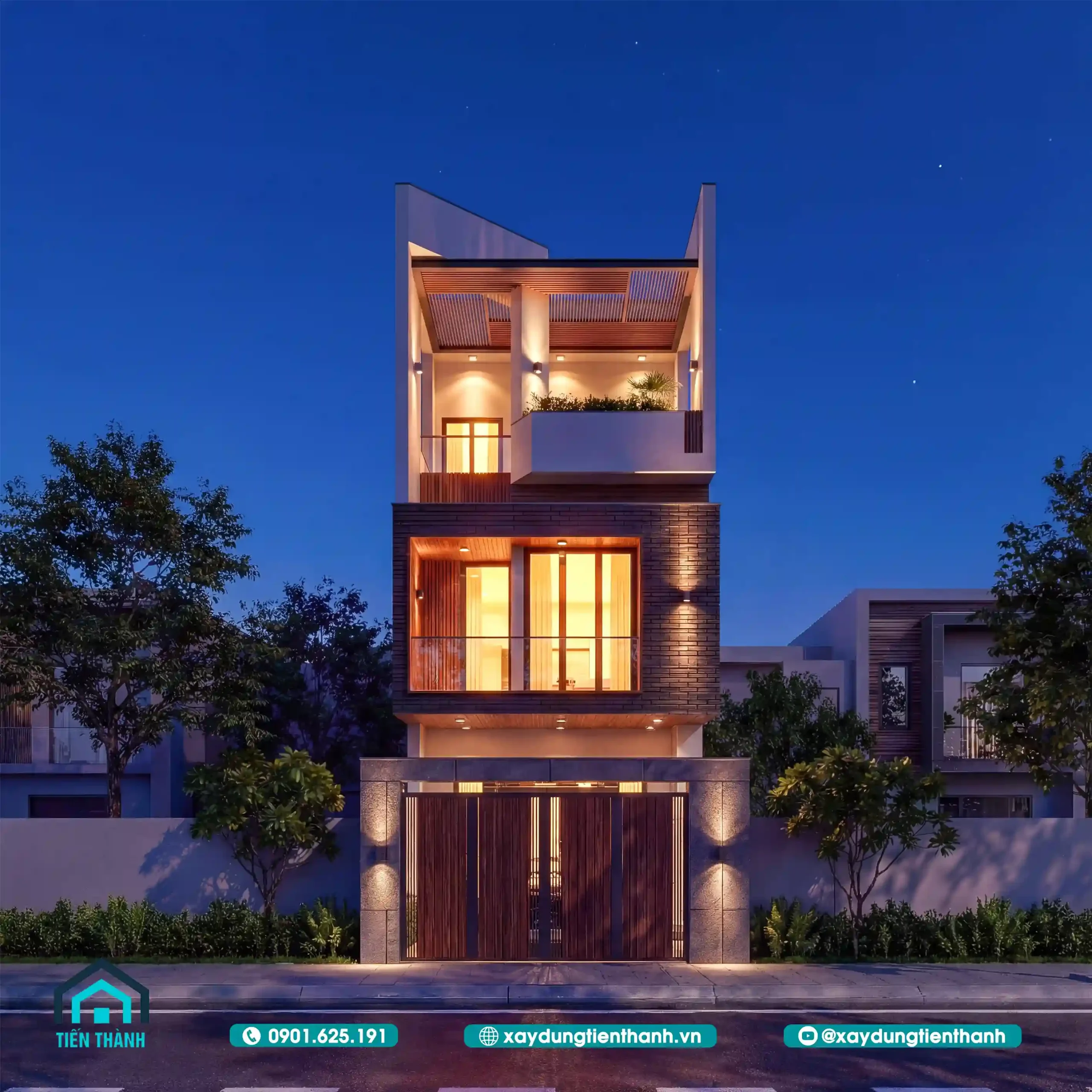 Phối cảnh tổng thể căn nhà phố lung linh dưới ánh đèn khi màn đêm buông xuống.