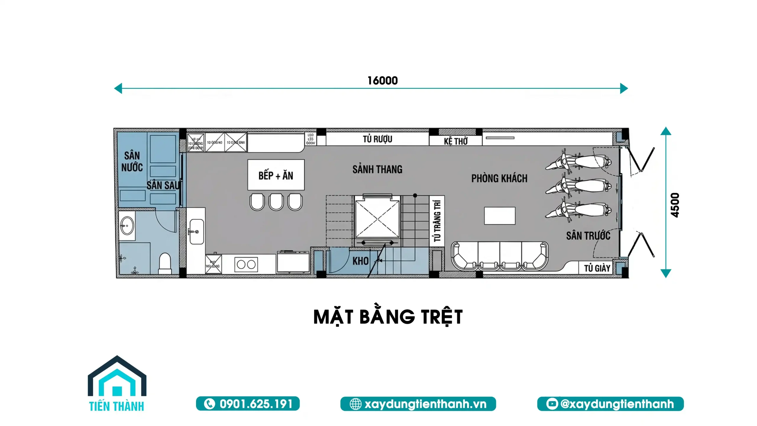 Một mẫu mặt tiền nhà 4 tầng đẹp cần đi đôi với một sơ đồ công năng hợp lý. Dưới đây là cách bố trí không gian tầng trệt trên diện tích 4.5x16m.
