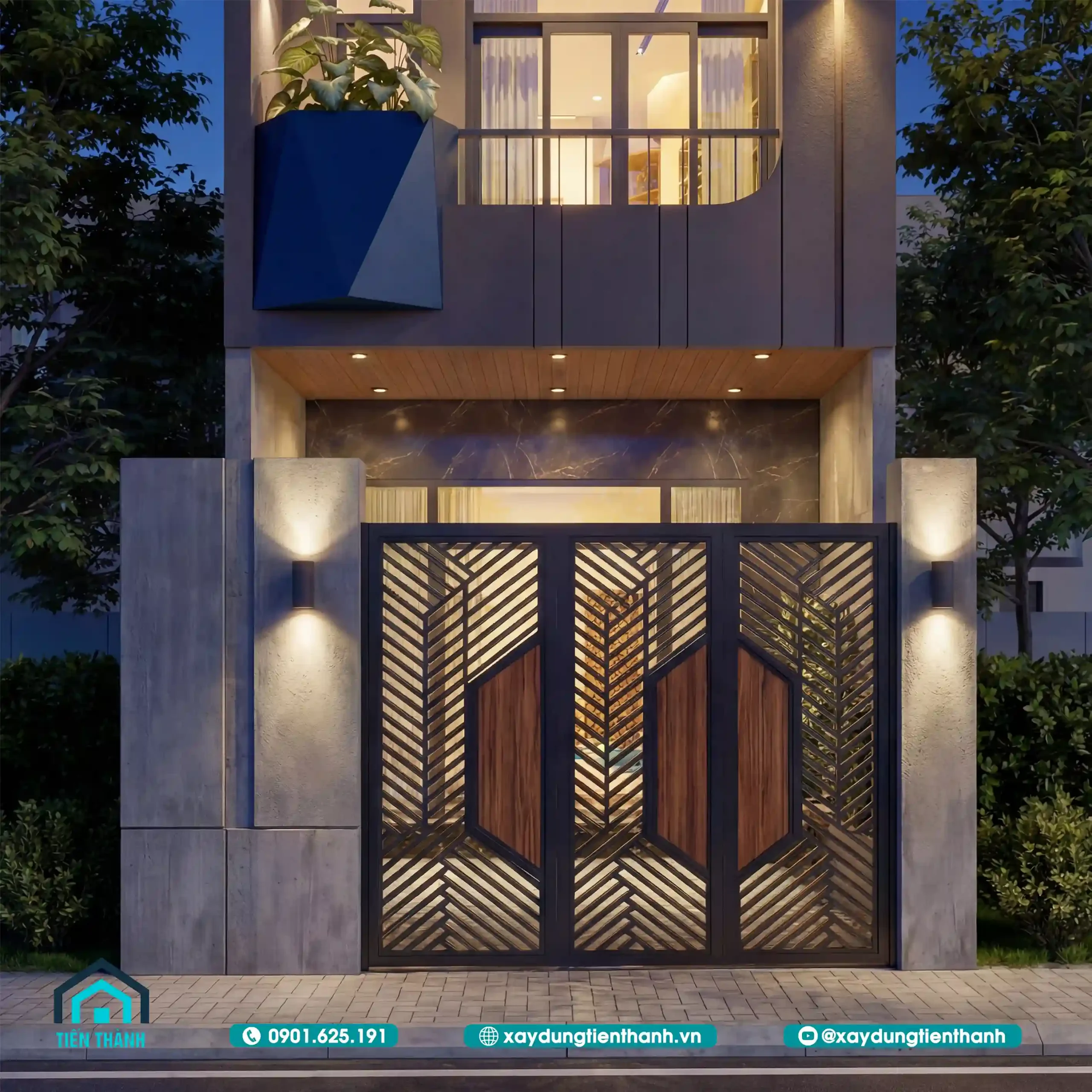 Mặt tiền nhà ống 3 tầng hiện đại với hệ cổng sắt nghệ thuật và ốp đá sang trọng