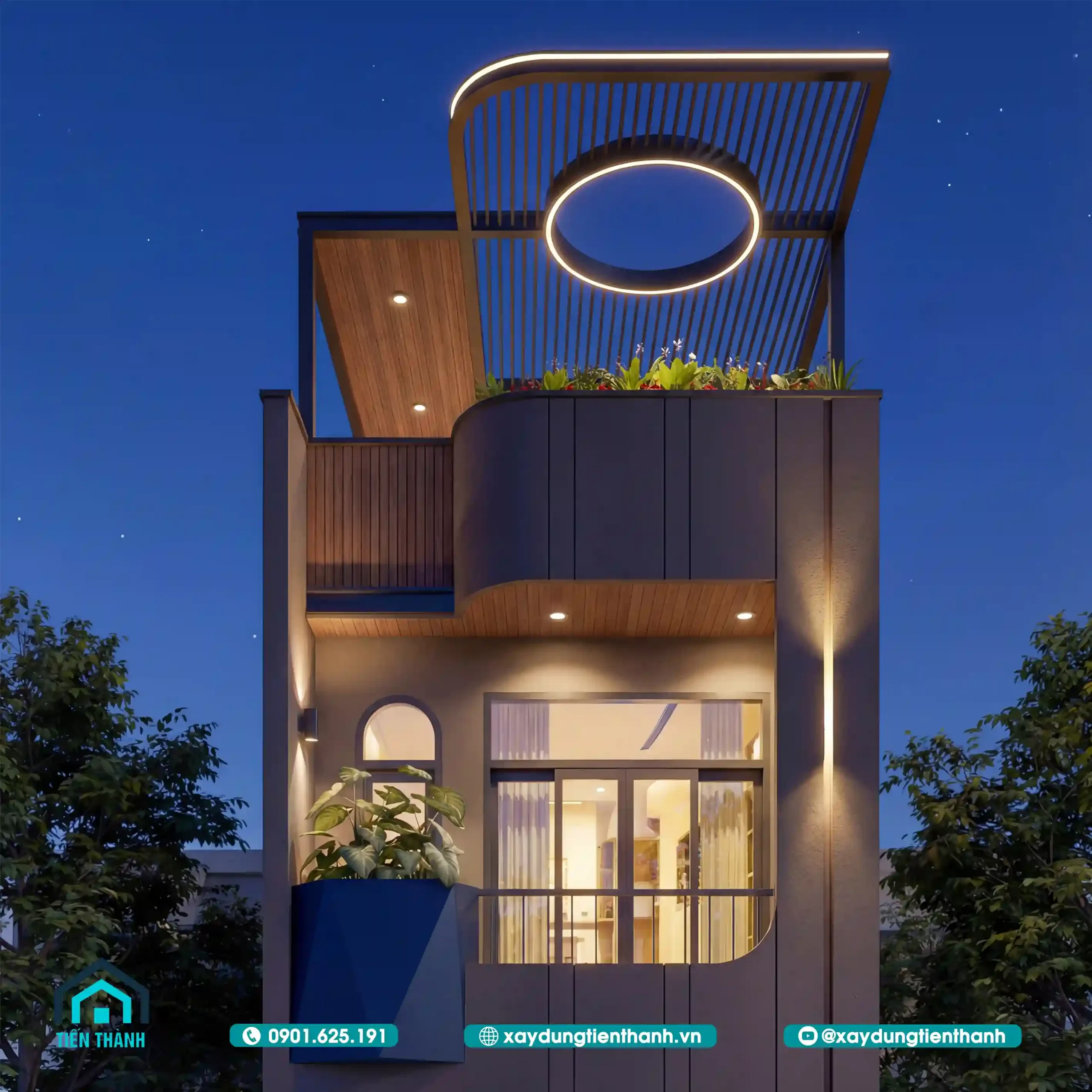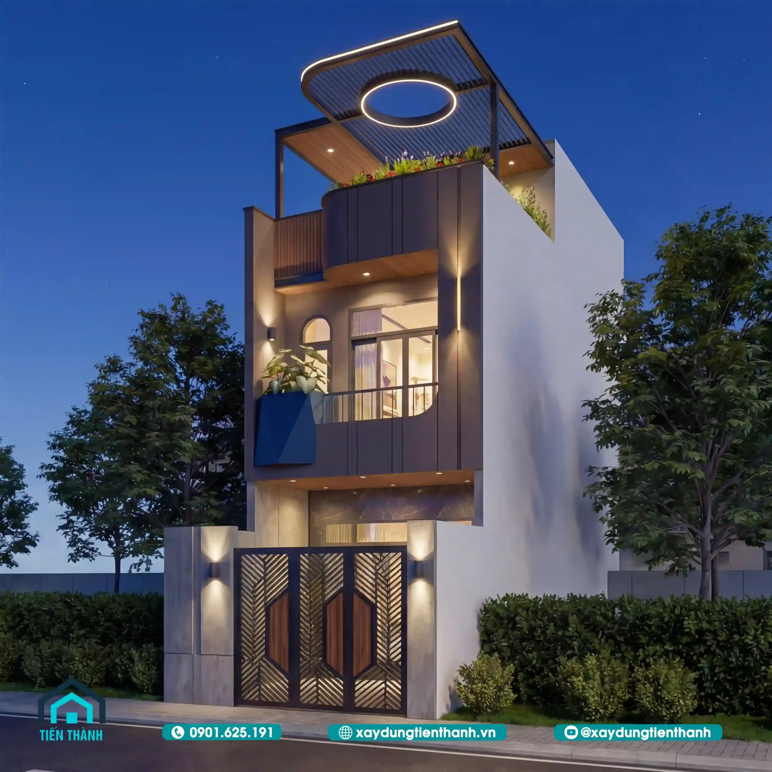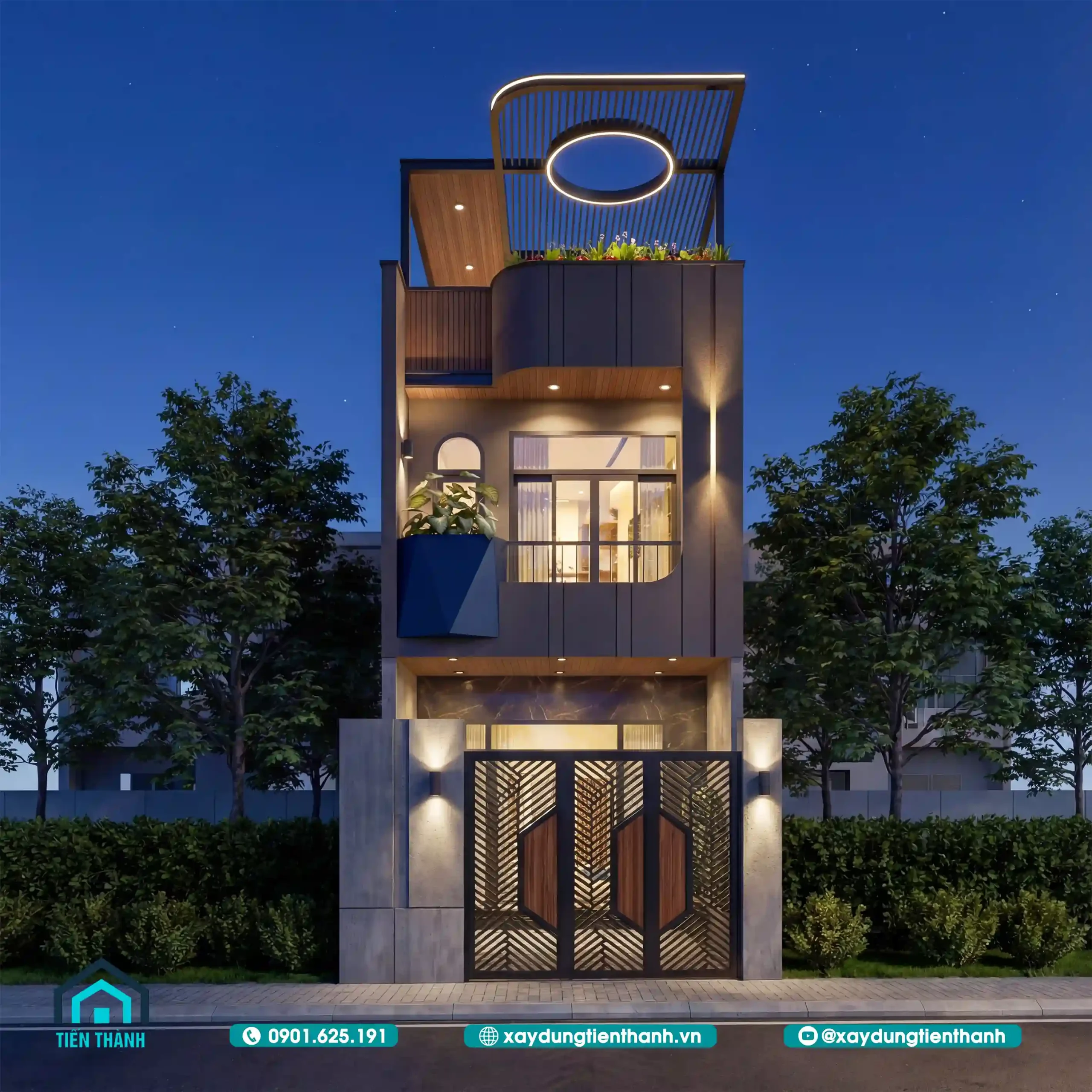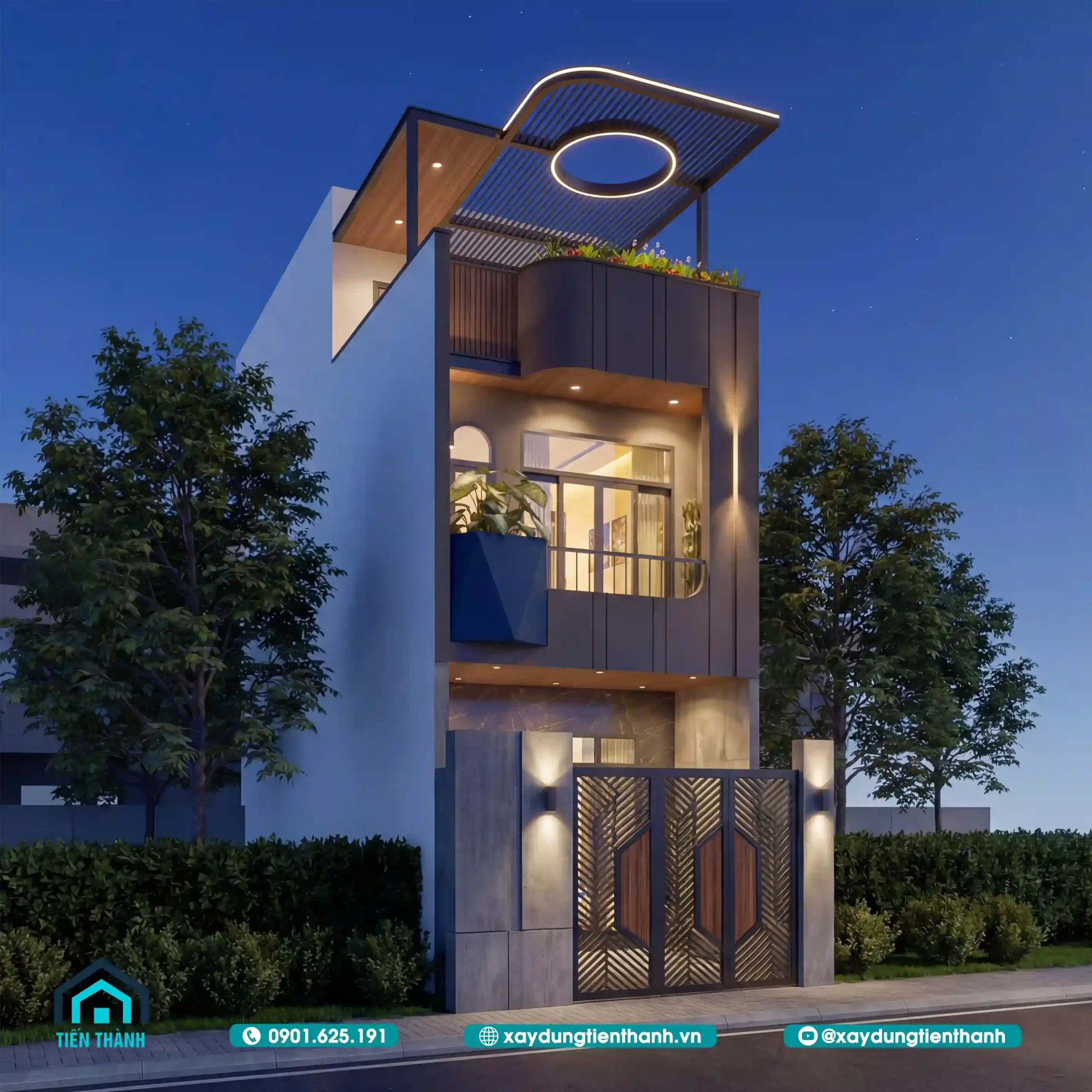 Để mặt tiền nhà ống 3 tầng đẹp hiện đại không trở nên nhàm chán vào buổi tối, việc sử dụng ánh sáng đóng vai trò cực kỳ quan trọng. Hệ thống đèn LED âm trần, đèn hắt tường và ánh sáng từ dải đèn quanh vòng tròn mái che được tính toán để tôn vinh từng chi tiết kiến trúc.