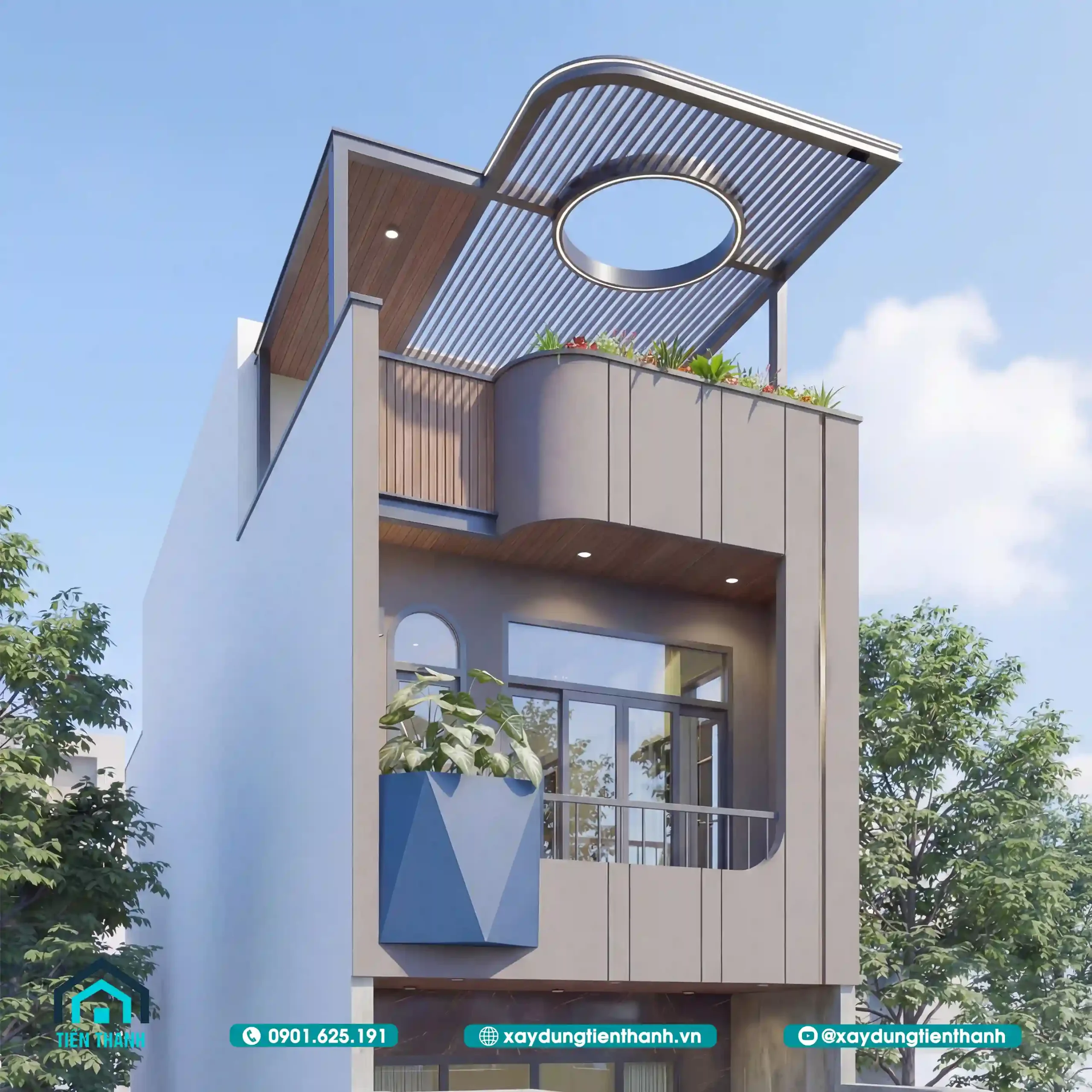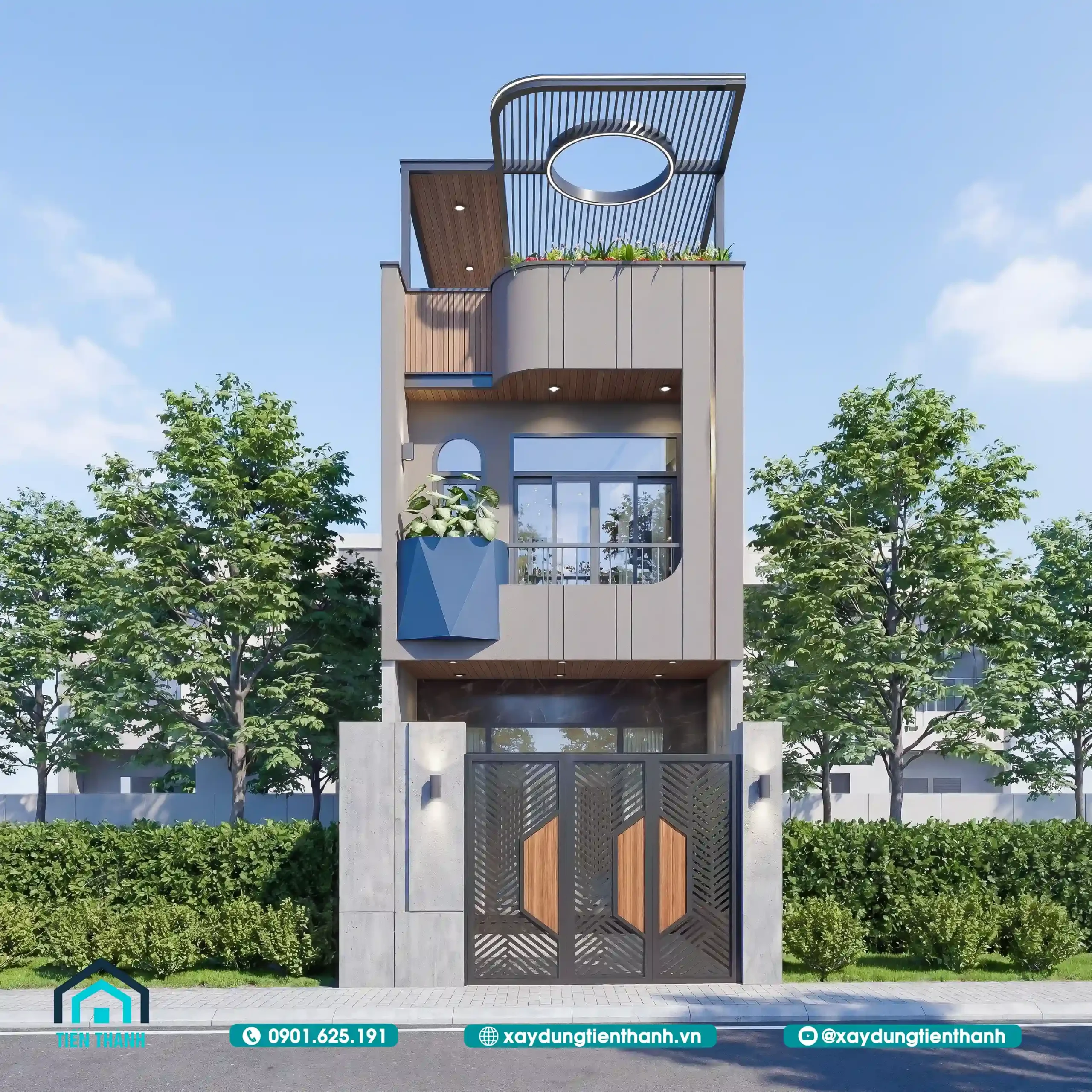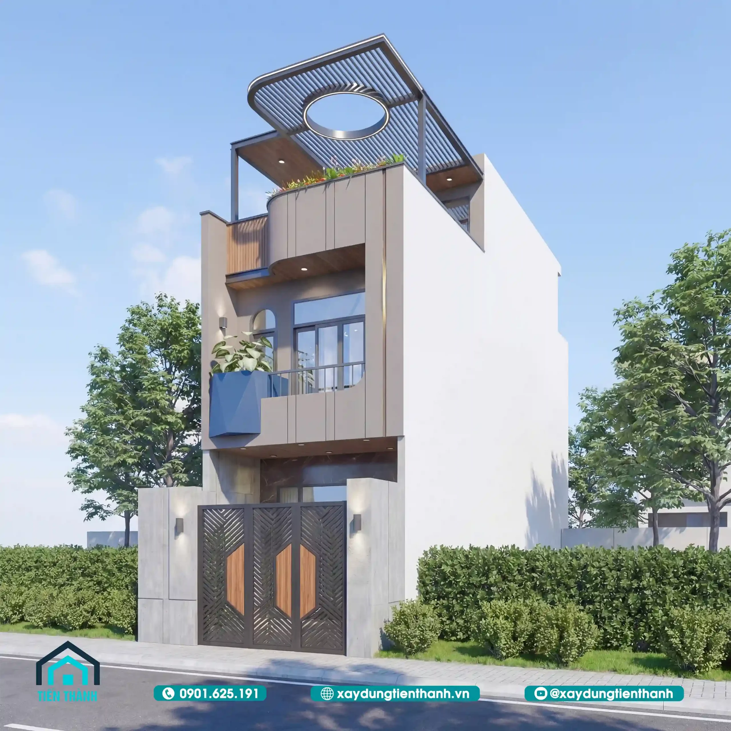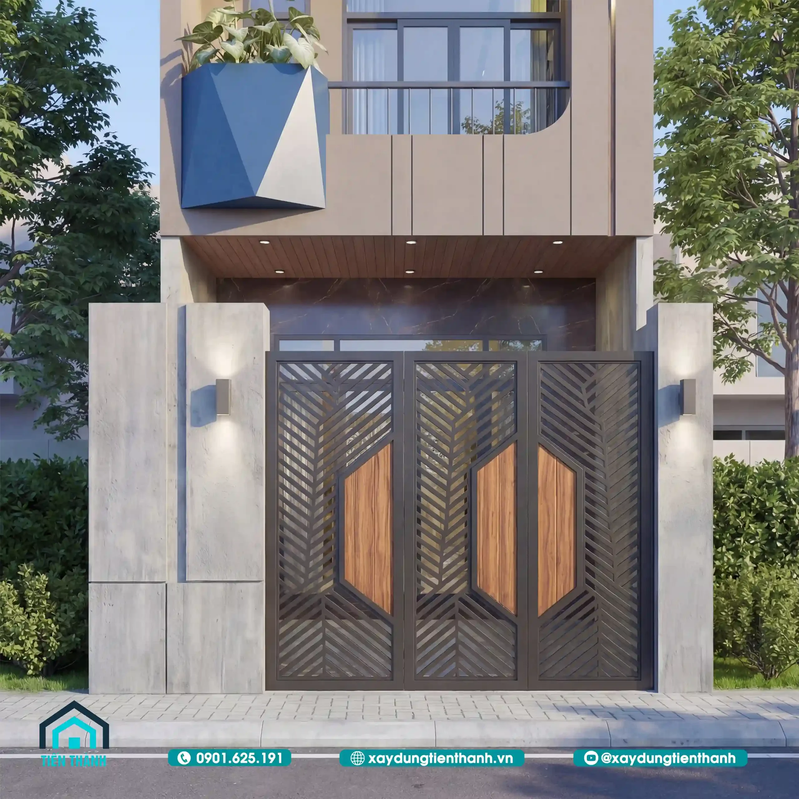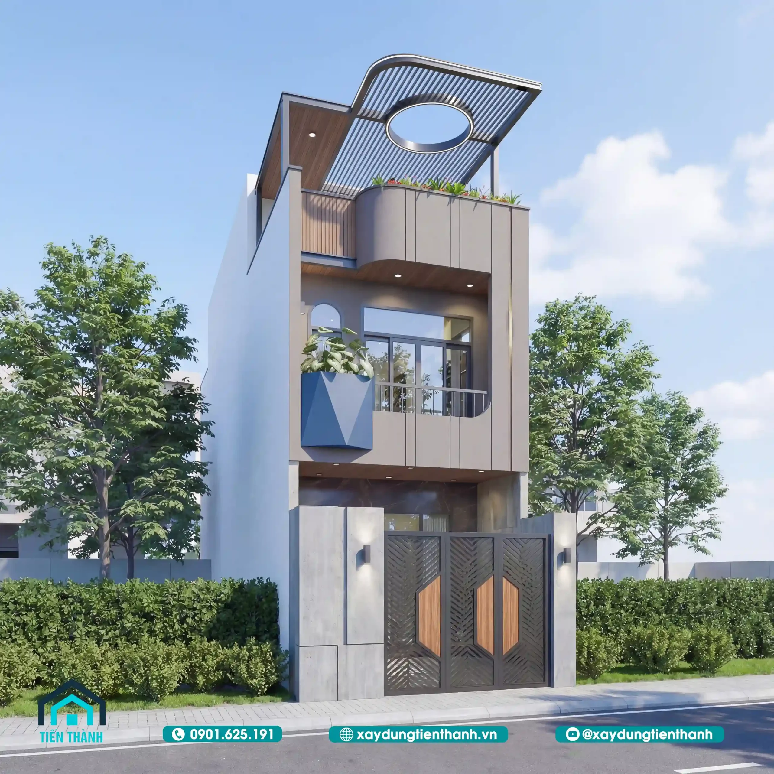 Mặt tiền nhà phố hiện đại, tinh tế với hệ mái lam và cây xanh ban ngày.
