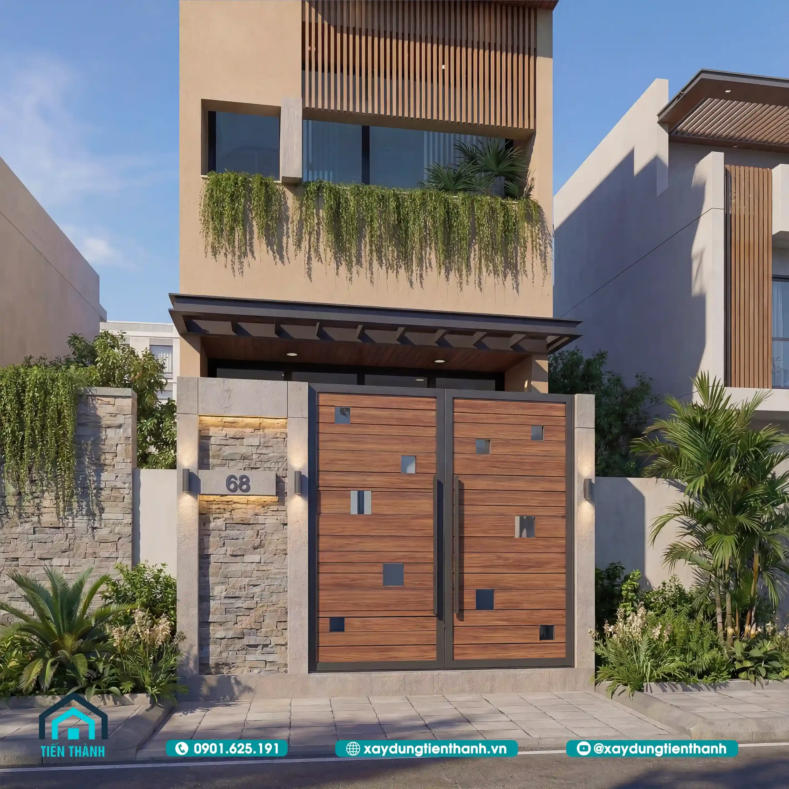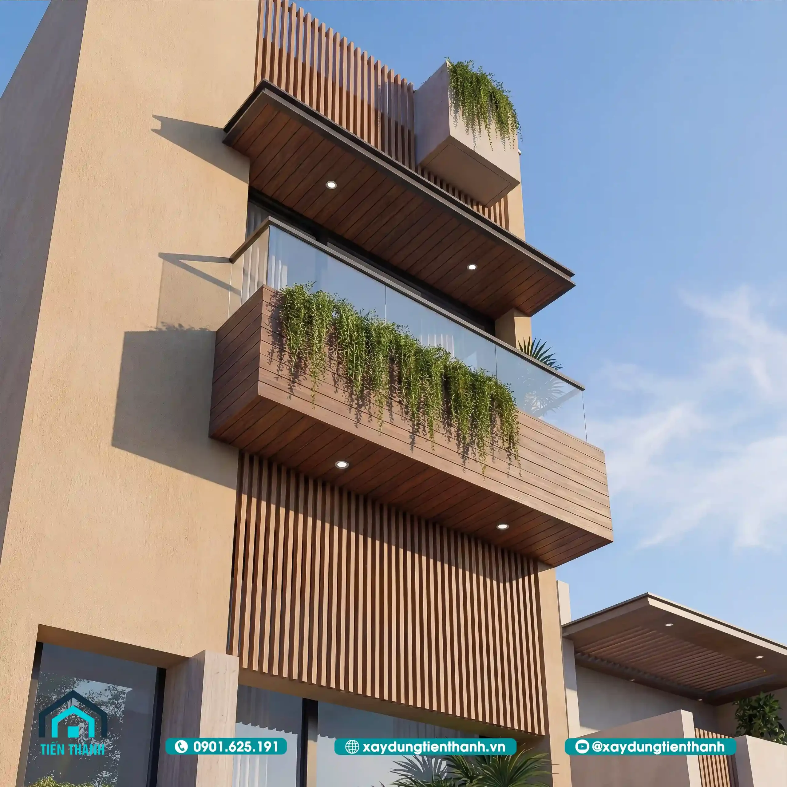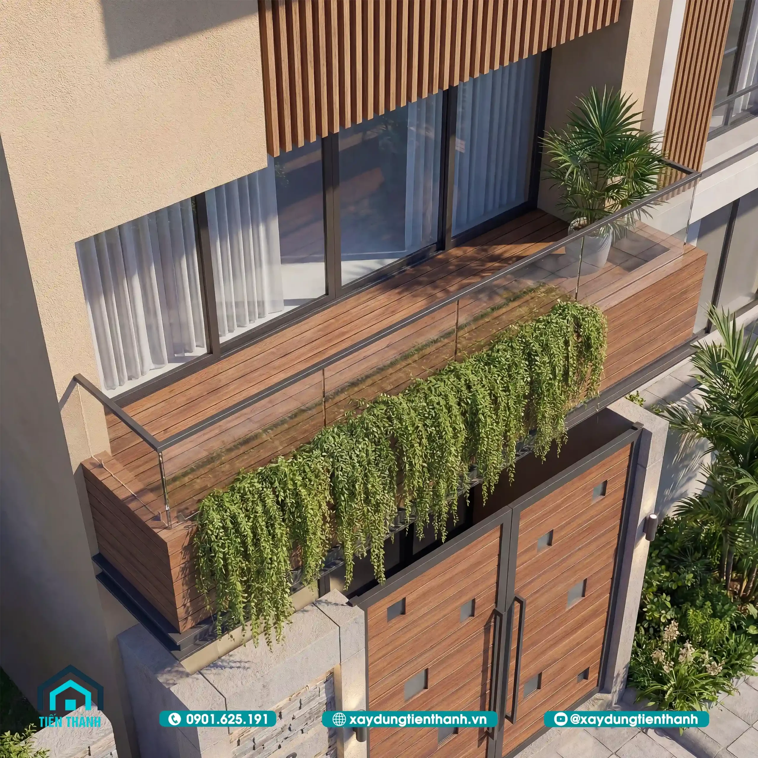 Ở góc nhìn này, chúng ta thấy rõ hệ ban công được ốp gỗ nhựa (WPC) cao cấp. Đây là loại vật liệu chịu được thời tiết khắc nghiệt, không cong vênh. Mang lại vẻ đẹp ấm cúng như gỗ tự nhiên nhưng bền bỉ hơn rất nhiều. Hệ thống cây xanh rủ xuống từ bồn hoa phía trước giúp làm dịu đi cái nóng của ánh nắng hướng Tây. Và tạo ra một không gian sống xanh ngay giữa phố thị cho nhà 2 tầng hiện đại này.