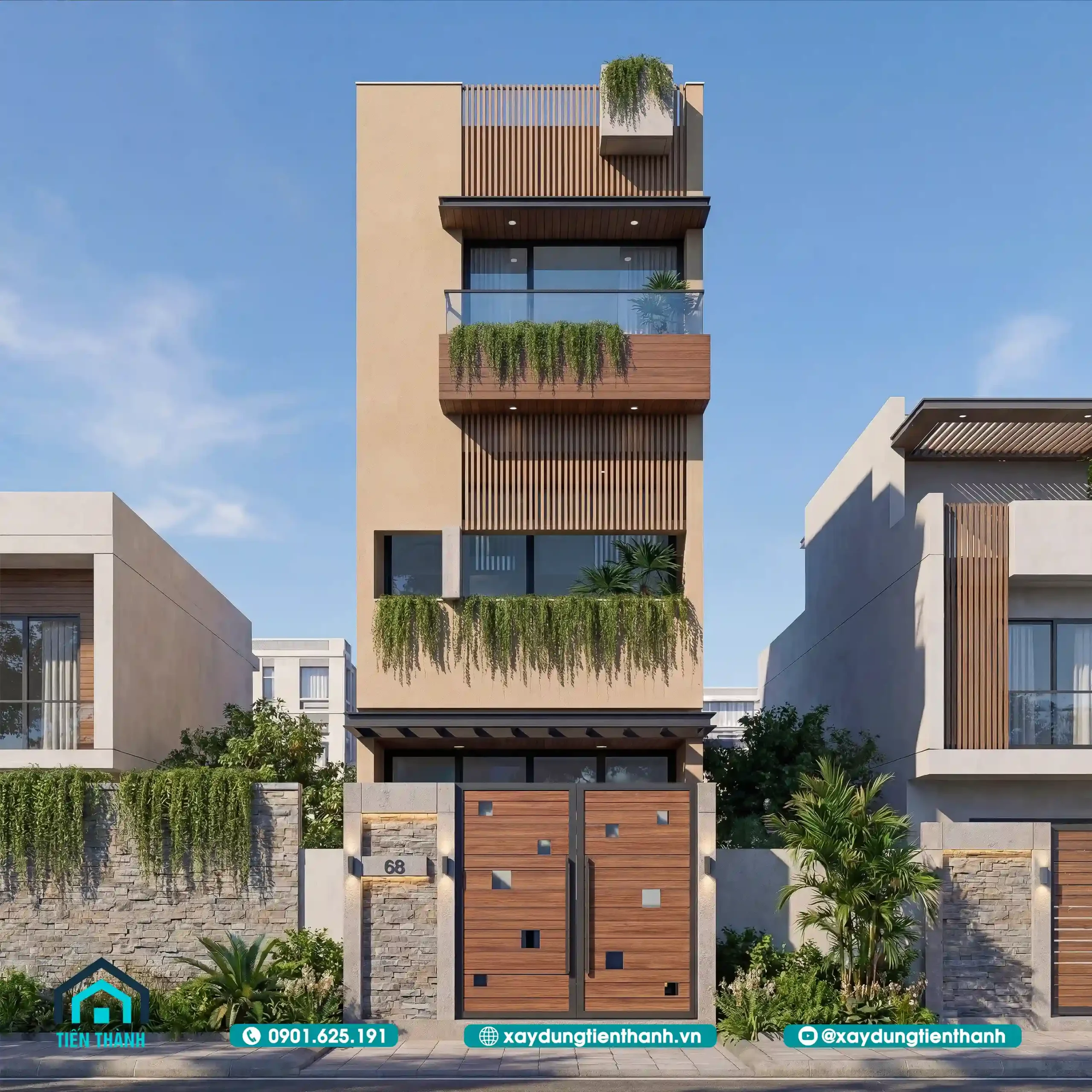 Phối cảnh trực diện mặt tiền nhà ống 3 tầng hiện đại với hệ lam gỗ sang trọng.