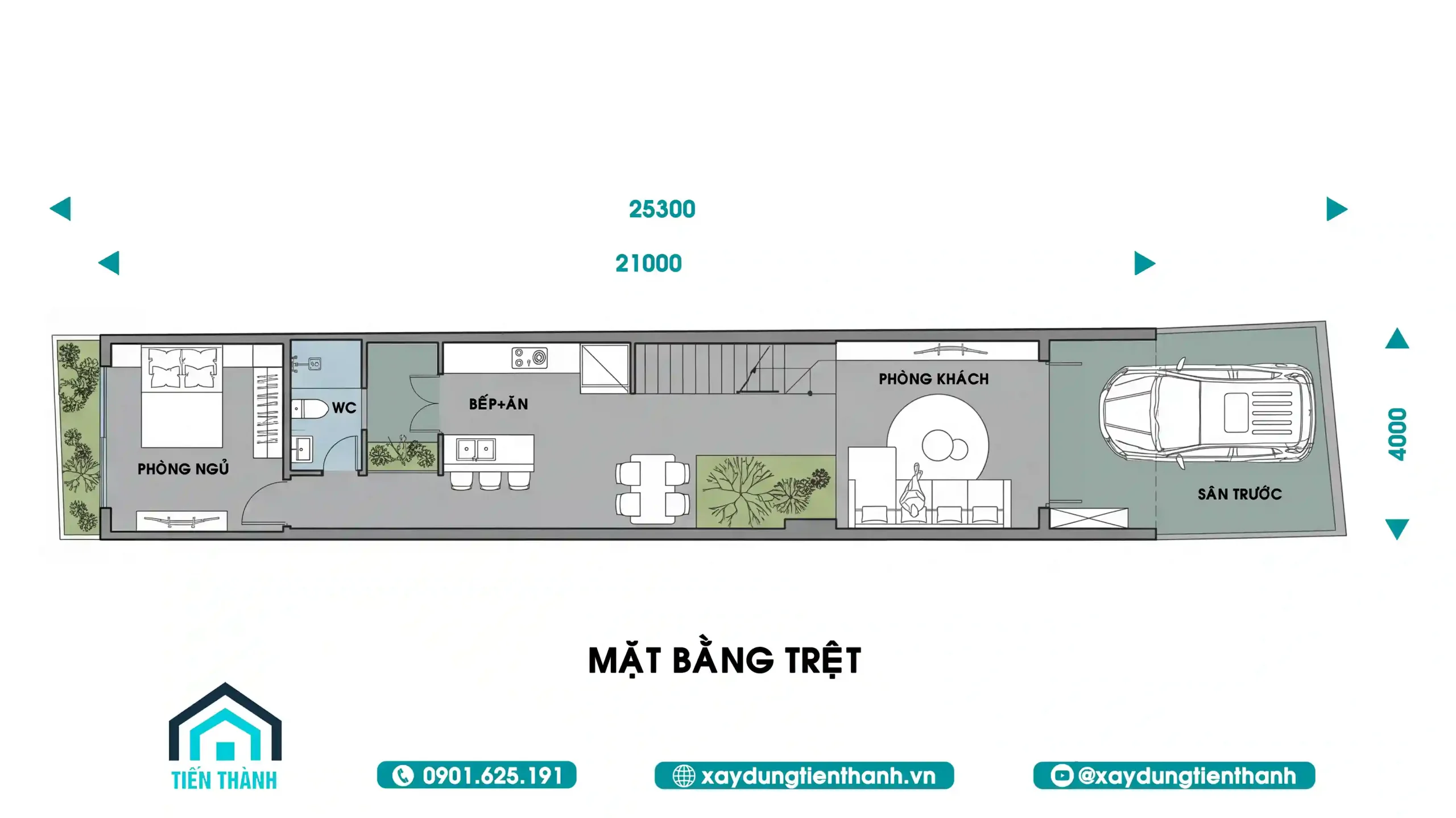 Sân trước rộng rãi được dành riêng làm khu vực để xe hơi an toàn. Bước vào bên trong là không gian phòng khách hiện đại và vô cùng thoáng đãng. Khu vực bếp và bàn ăn được kết nối liên hoàn để tối ưu không gian. Một phòng ngủ nhỏ được bố trí kín đáo ở phía cuối căn nhà phố. Hệ thống giếng trời nhỏ giúp lưu thông không khí cho mặt tiền nhà ống 4m hot.