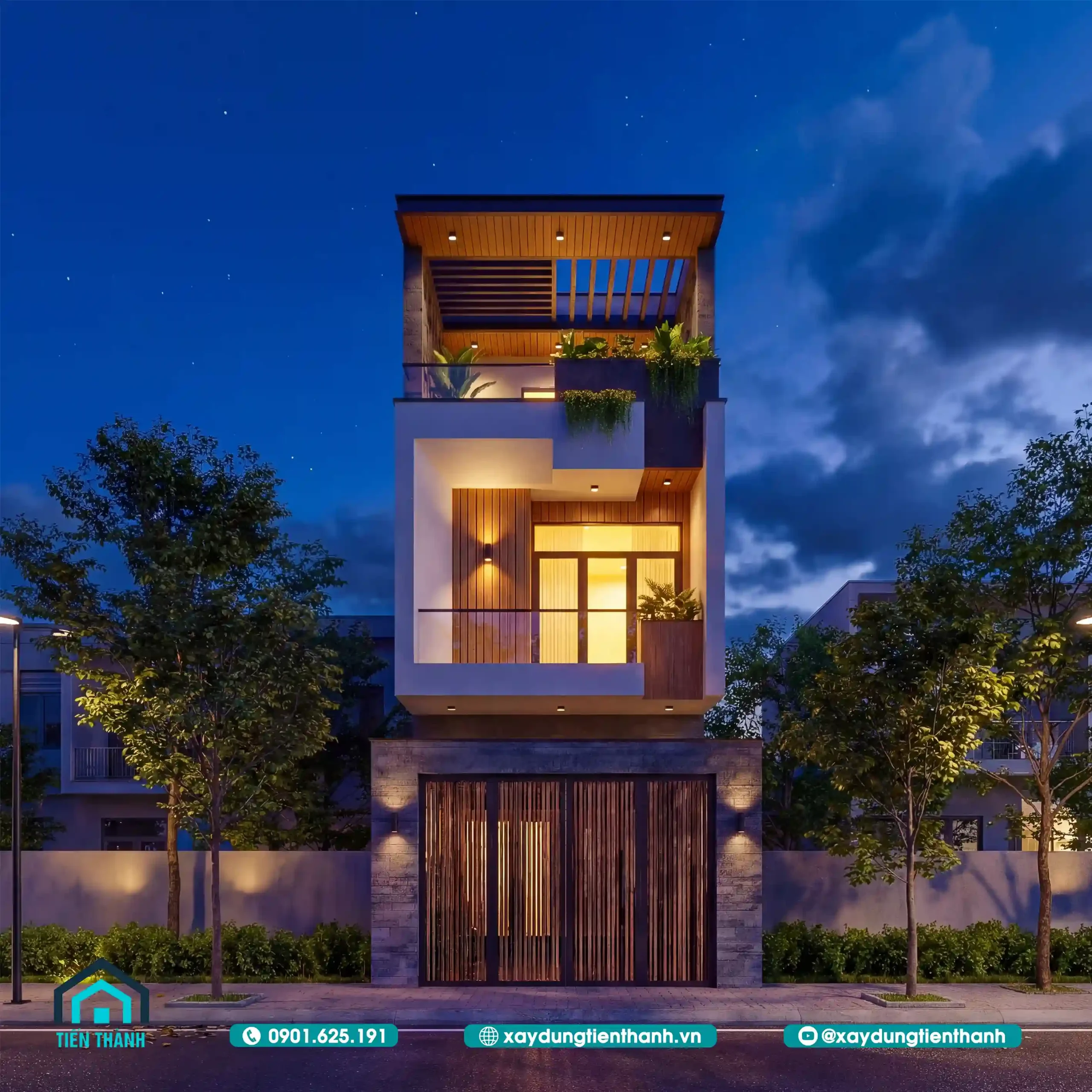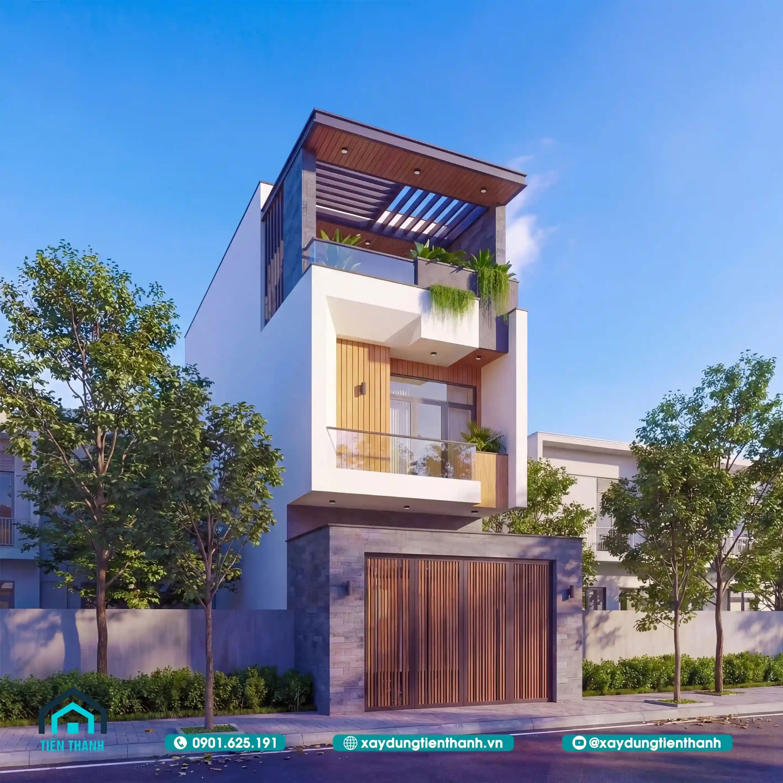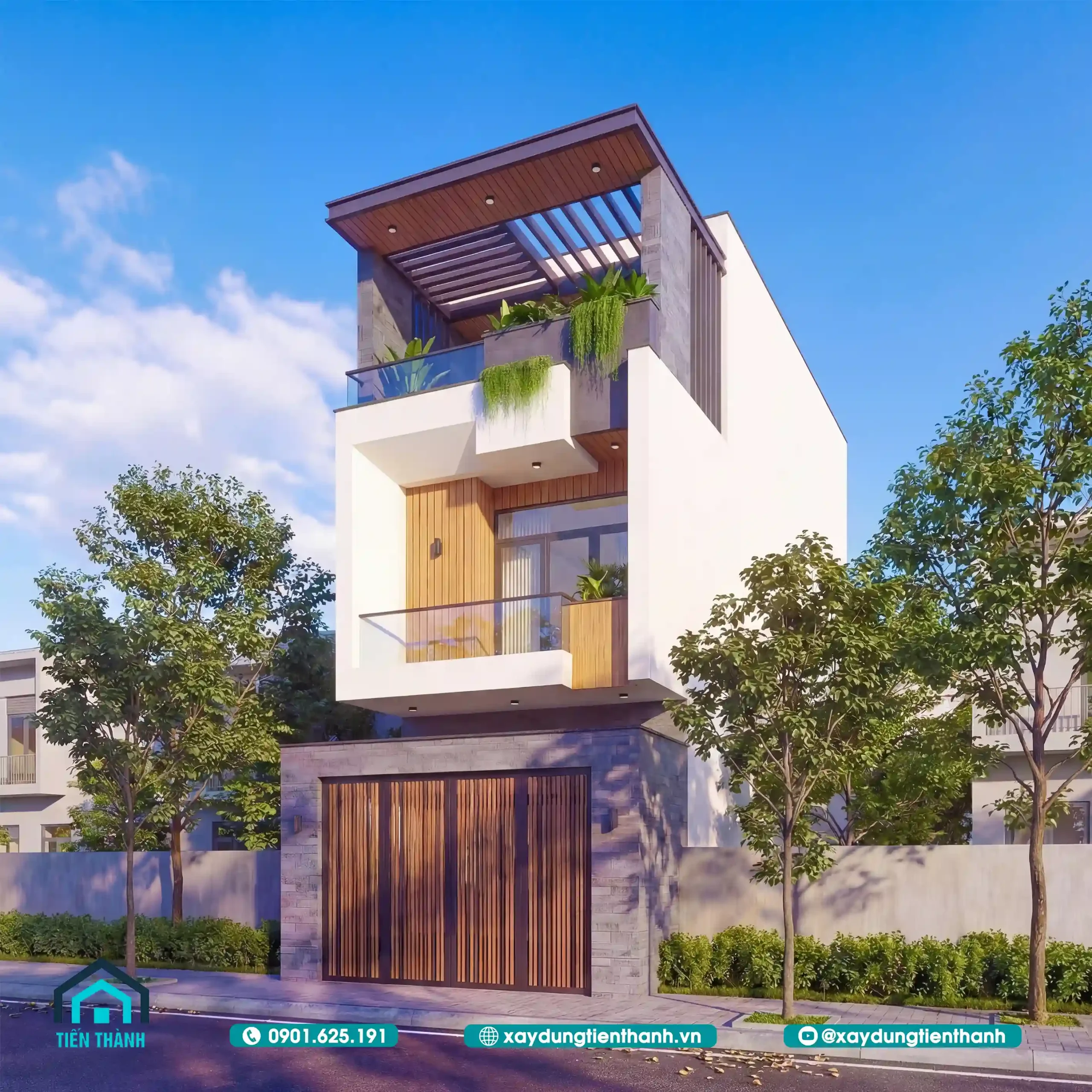 Thiết kế nhà phố hiện đại ba tầng với kiến trúc hình khối và vật liệu gỗ sang trọng.