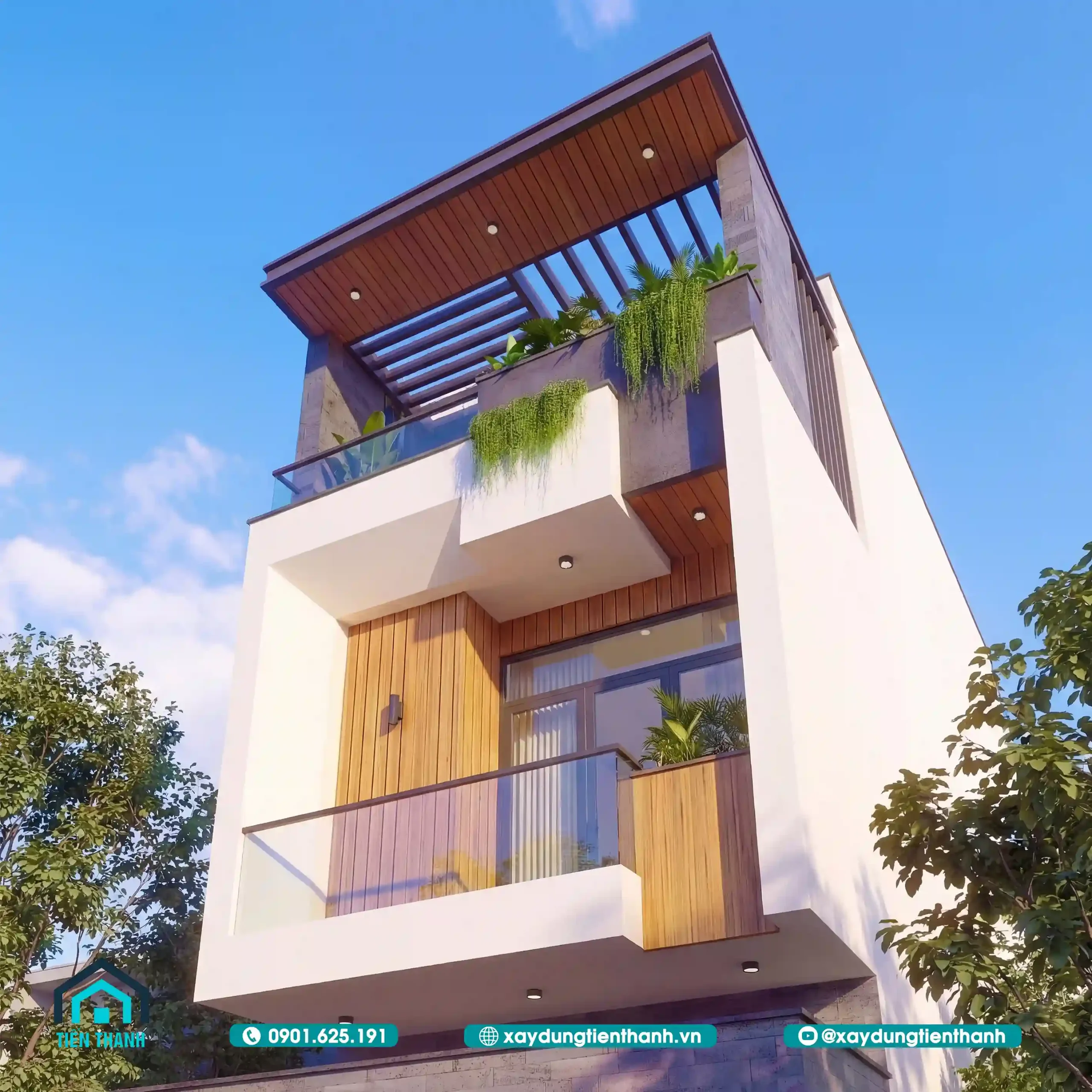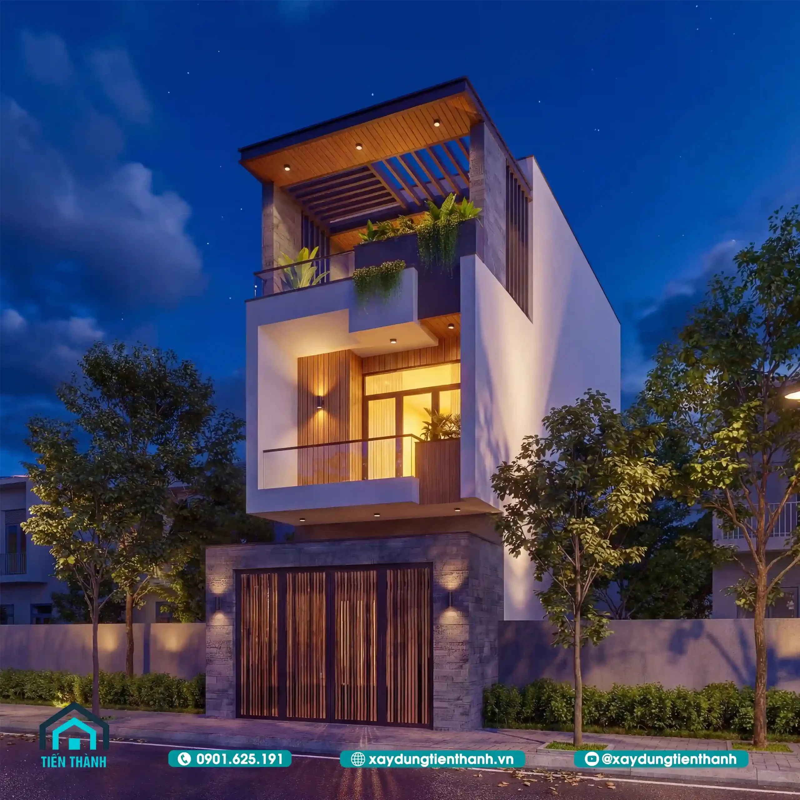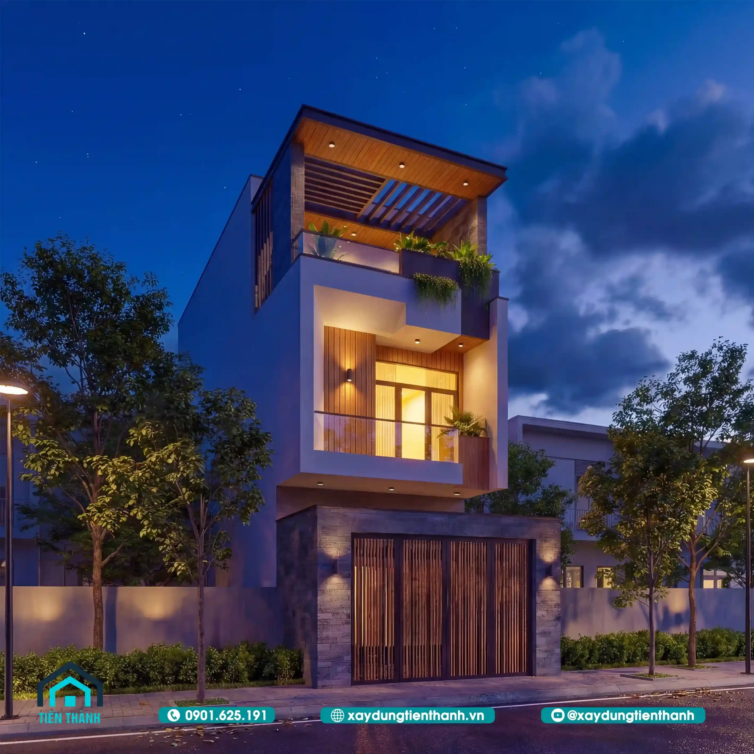Thiết kế nhà phố hiện đại ba tầng với kiến trúc hình khối và vật liệu gỗ sang trọng.