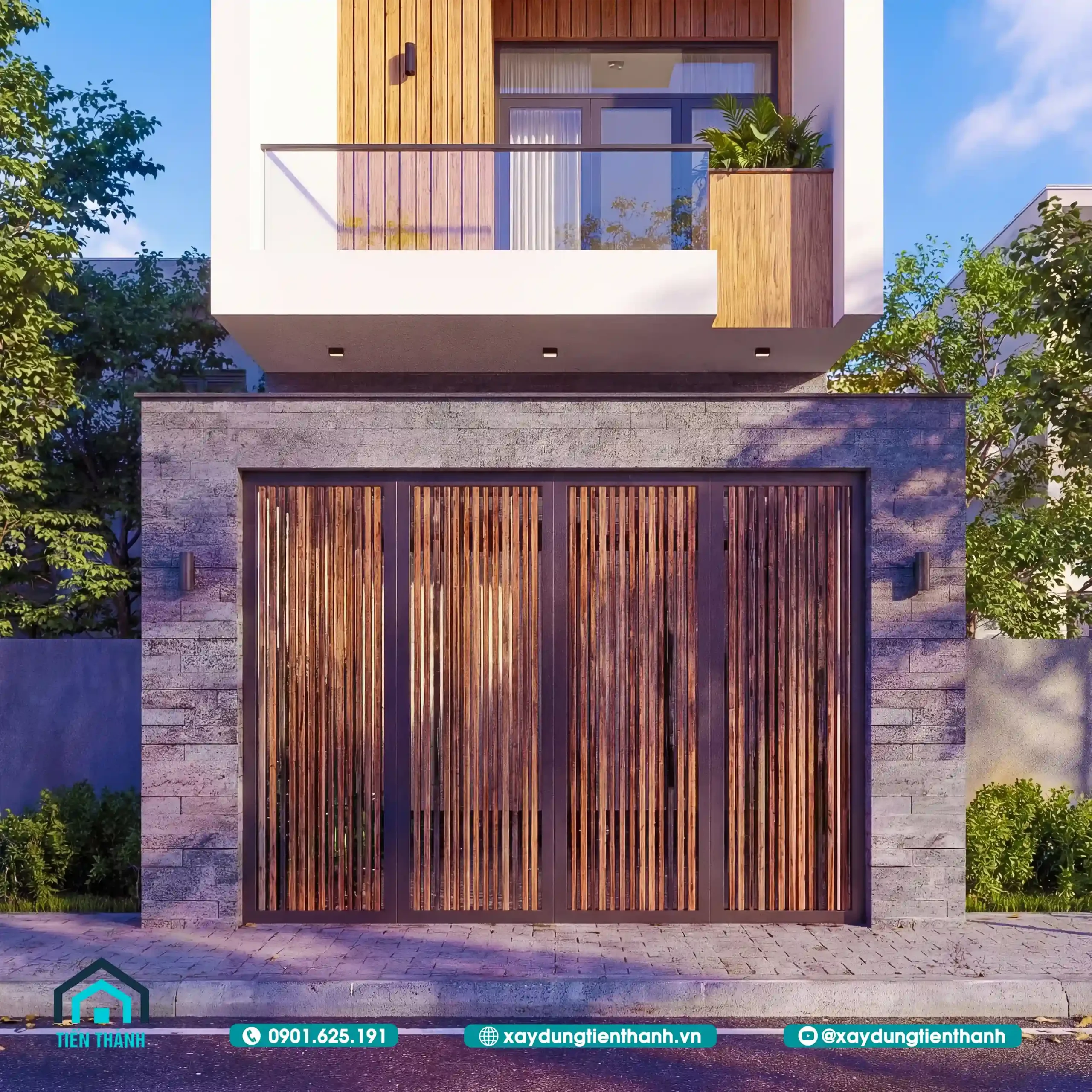 Cận cảnh hệ cổng gỗ và tường đá xám của mẫu mặt tiền nhà ống 4m.