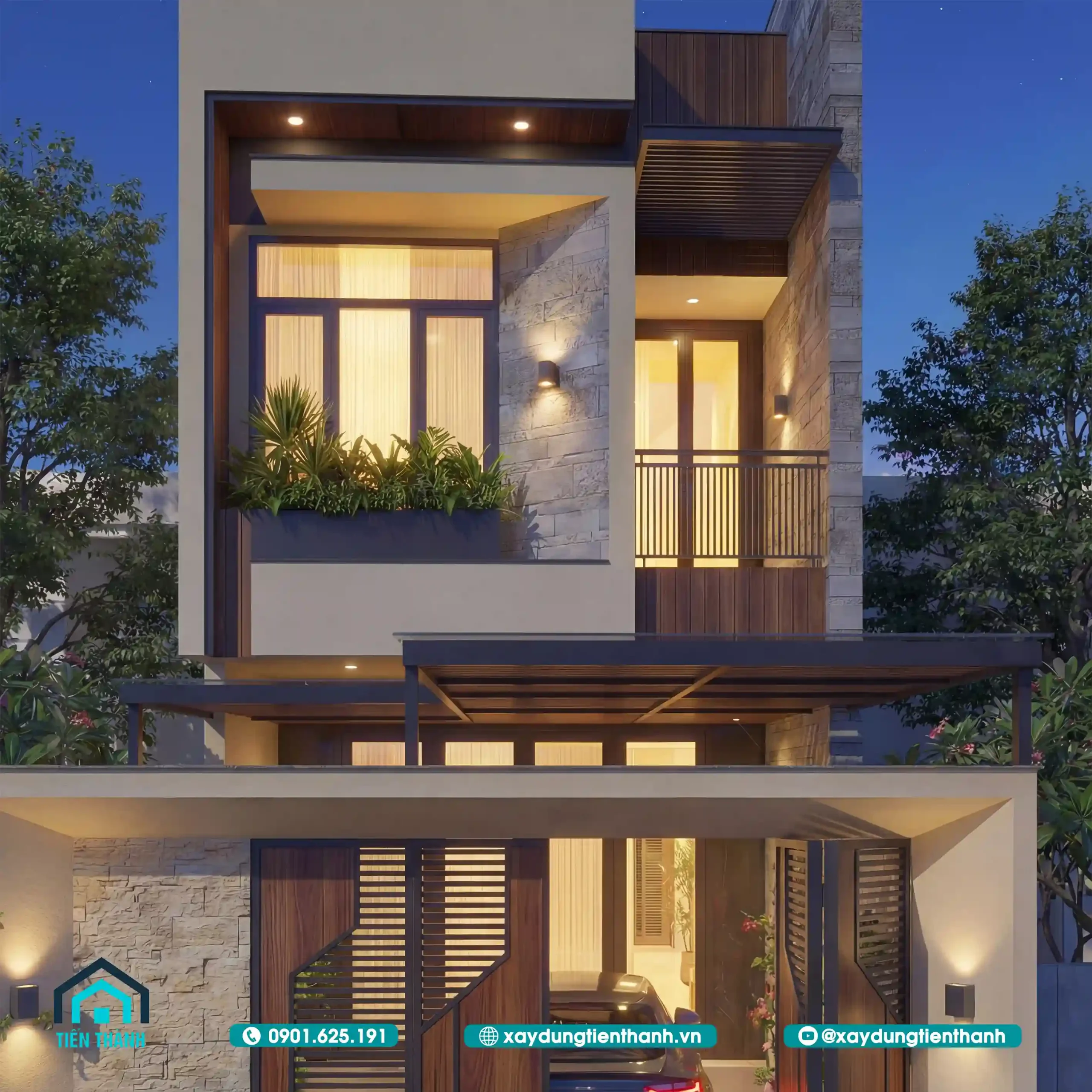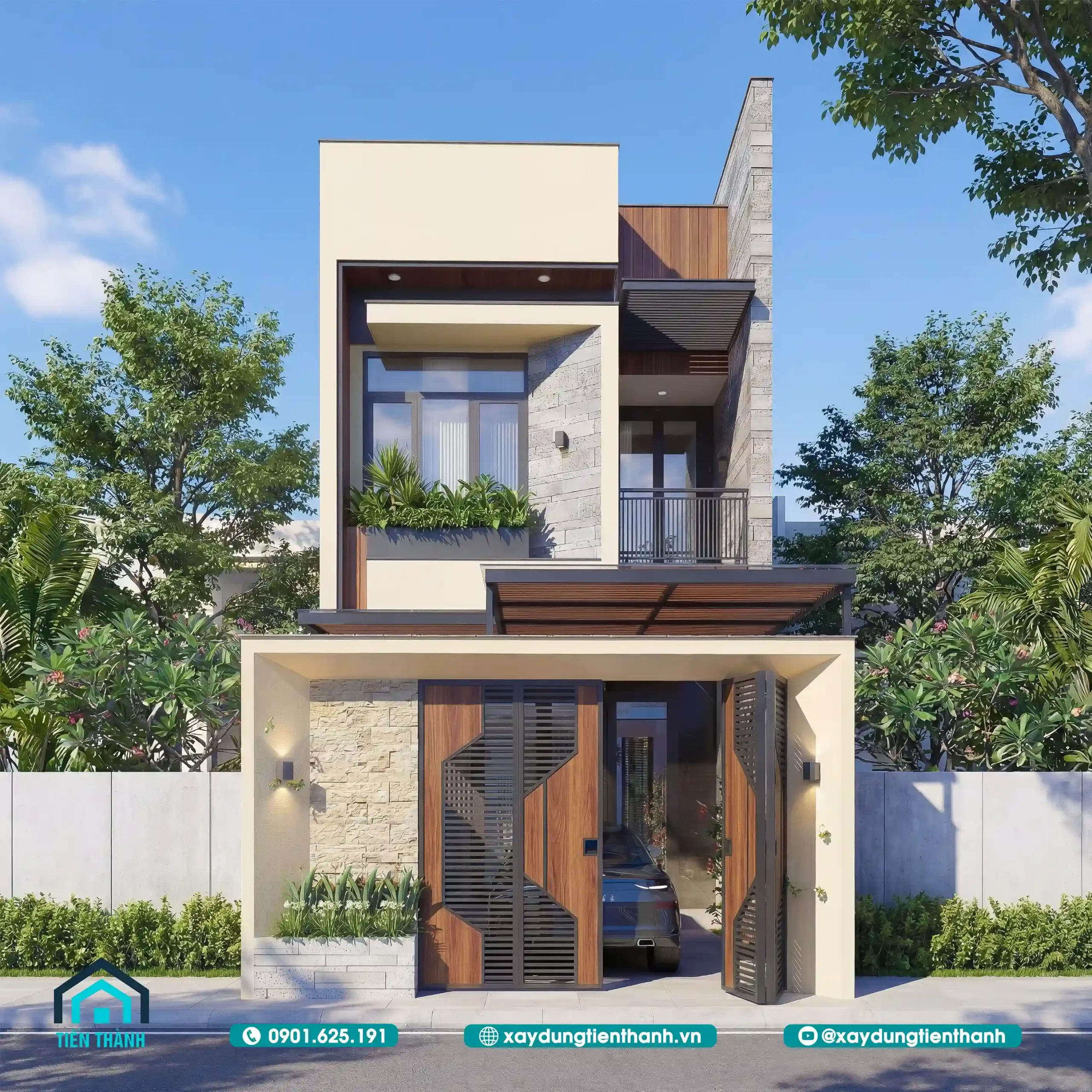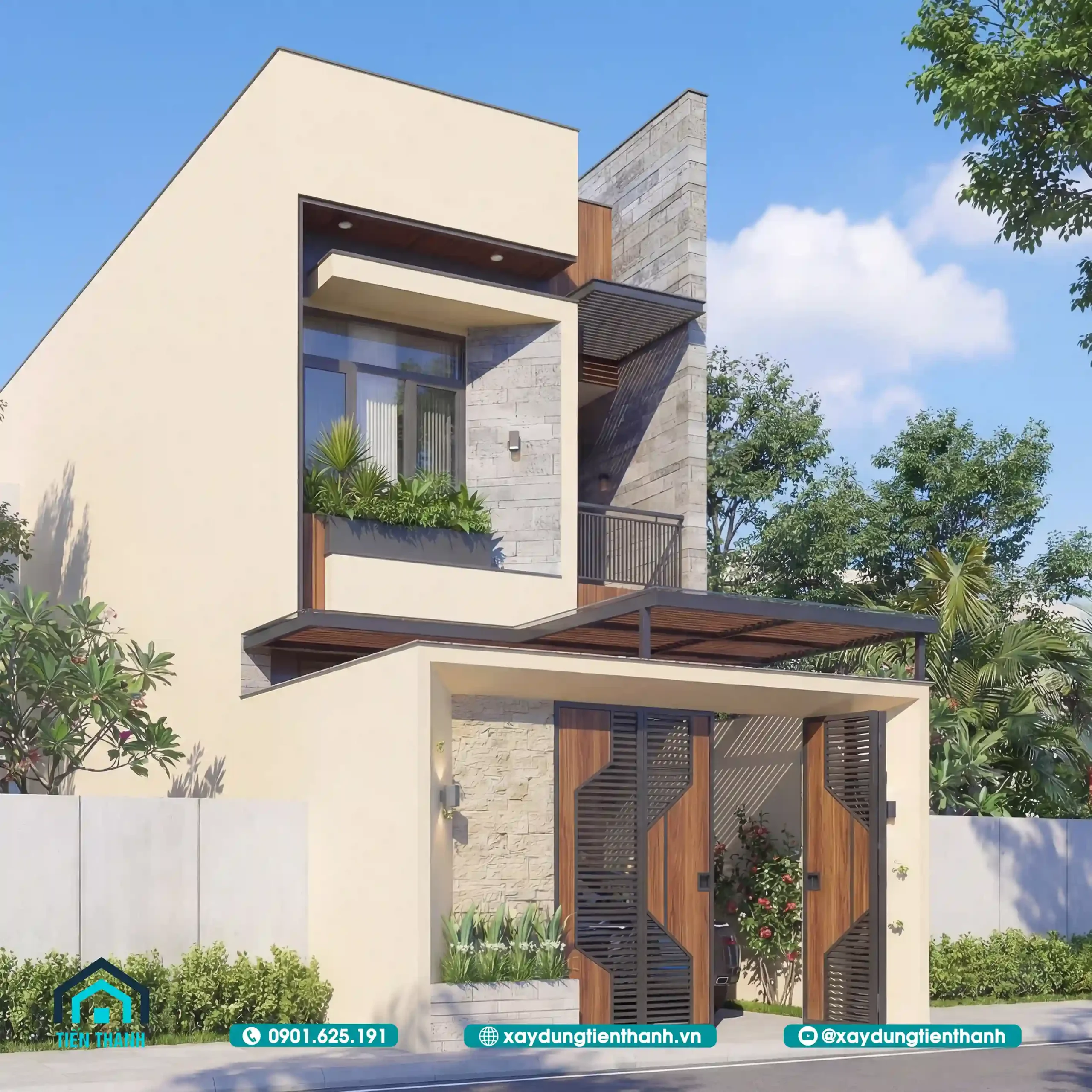 Thiết kế mặt tiền nhà phố 5m 2 tầng hiện đại thường ưu tiên các khối hình học vuông vức, tối giản các chi tiết rườm rà. Thay vào đó, kiến trúc sư sẽ tập trung vào sự kết hợp giữa các vật liệu mới như kính cường lực, lam gỗ trang trí và đá tự nhiên để tạo điểm nhấn thị giác mạnh mẽ.