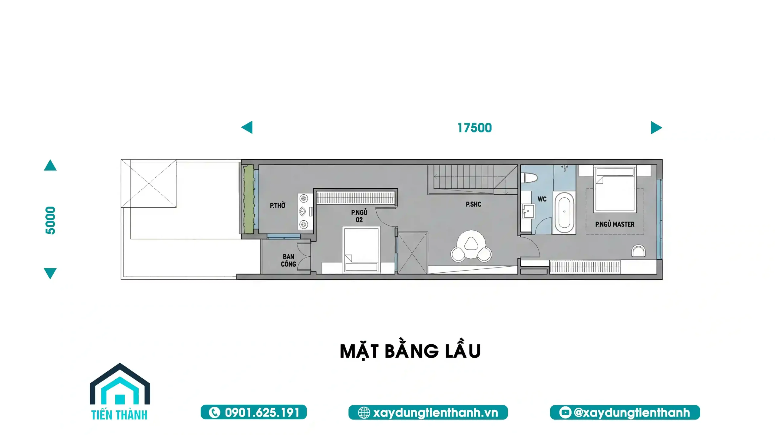 Tiếp nối sự khoa học của tầng trệt, không gian tầng lầu của mẫu mặt tiền nhà phố 5m 2 tầng này tập trung hoàn toàn vào sự riêng tư và nhu cầu thư giãn của các thành viên trong gia đình. Việc phân chia diện tích dựa trên kích thước thực tế 5×17.5m (phần xây dựng) giúp mỗi phòng đều có diện tích sử dụng thoải mái.