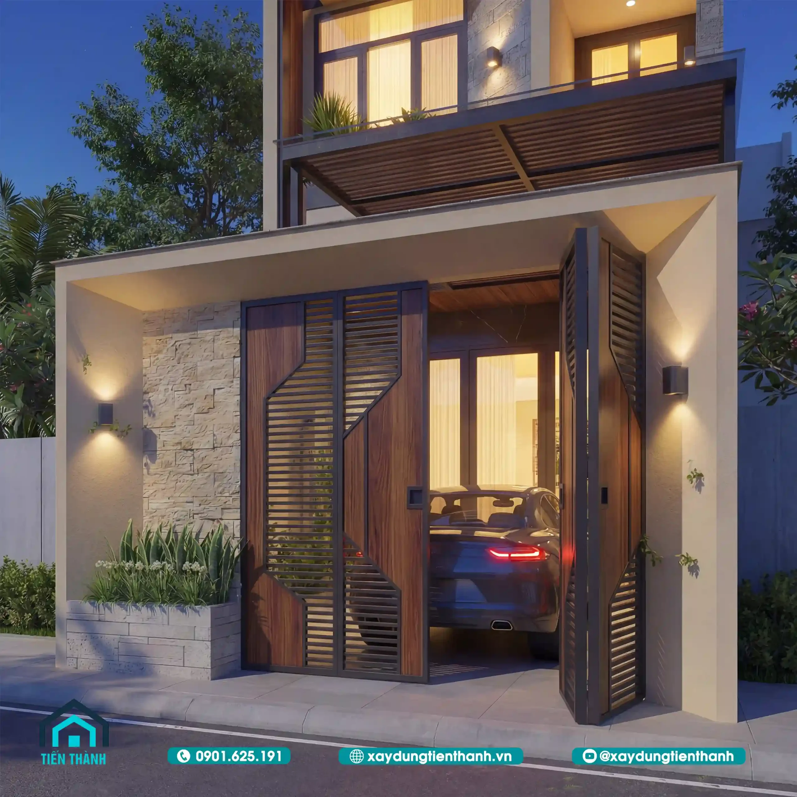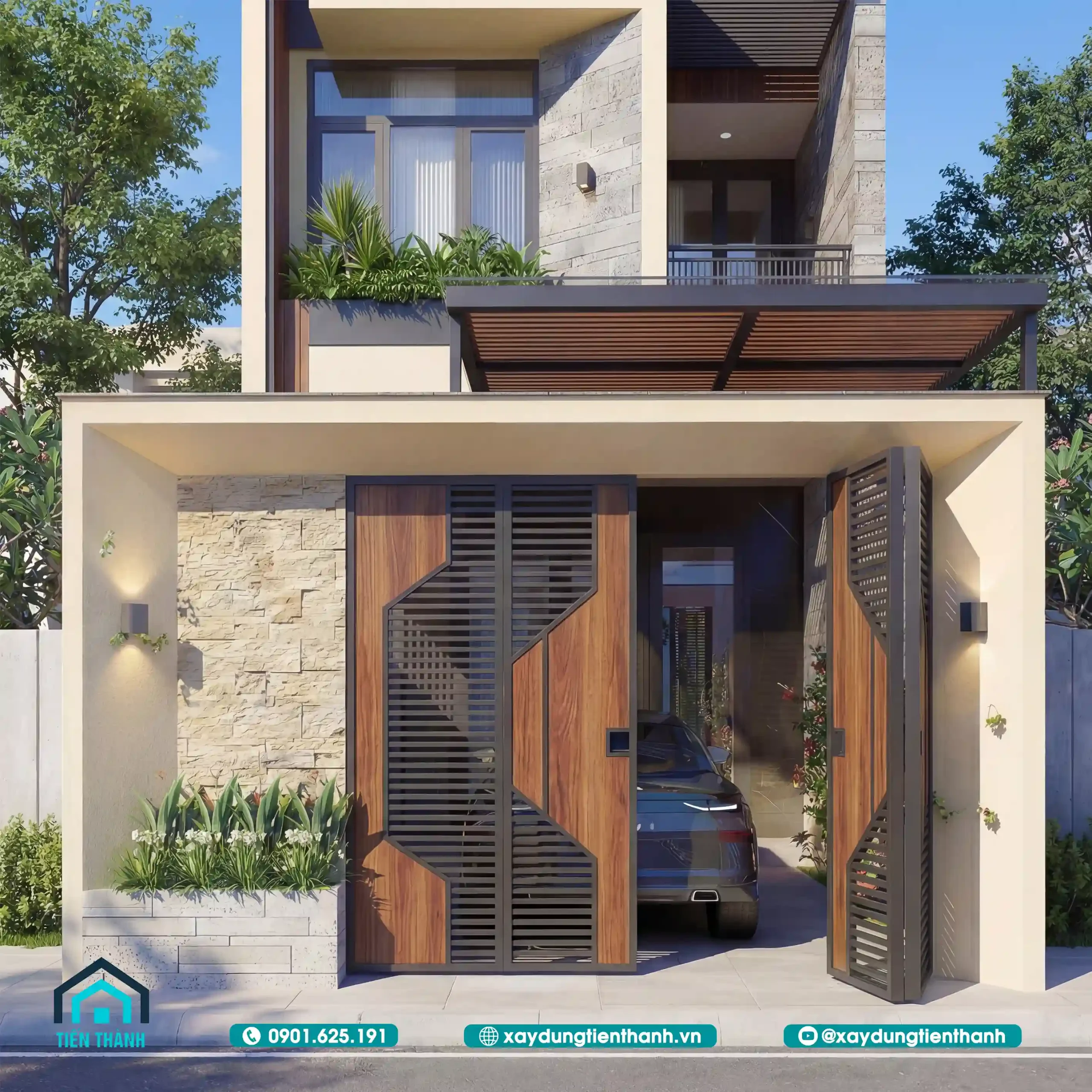 Mẫu nhà phố chúng ta đang chiêm ngưỡng là sự kết hợp tinh tế giữa phong cách hiện đại và không gian xanh. Điểm nhấn đầu tiên chính là hệ cổng chính được thiết kế cách điệu. Sự kết hợp giữa nan gỗ nâu ấm áp và khung sắt sơn tĩnh điện đen tạo nên vẻ đẹp khỏe khoắn, đồng thời đảm bảo sự riêng tư nhưng vẫn thoáng khí cho khu vực sân trước.