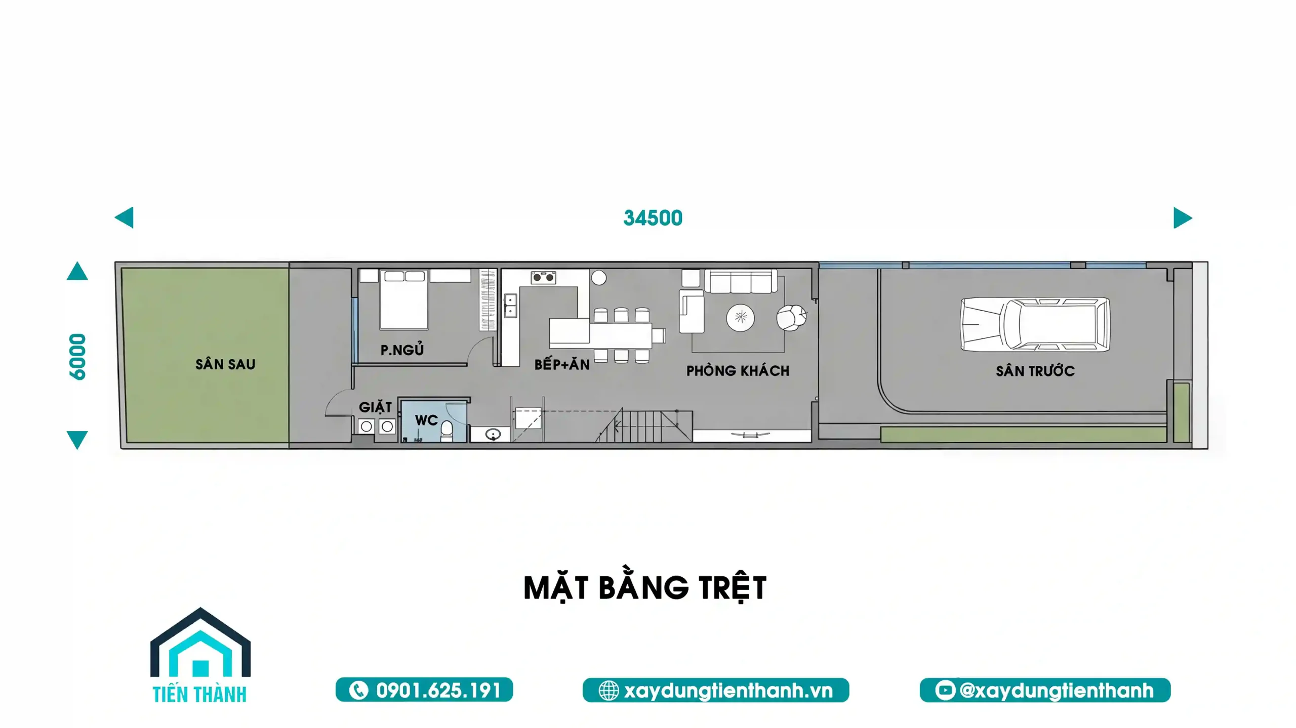 Để một ngôi nhà hoàn hảo, thẩm mỹ mặt tiền phải đi đôi với công năng sử dụng. Với chiều dài lô đất đáng kể (khoảng 34.5m trong bản vẽ), ngôi nhà được chia thành các khu vực chức năng rành mạch.