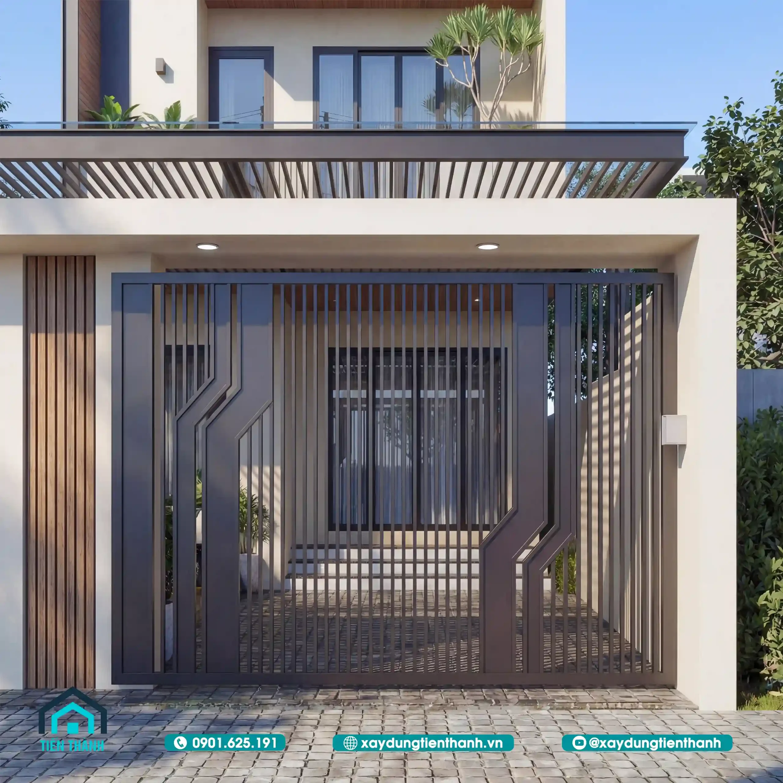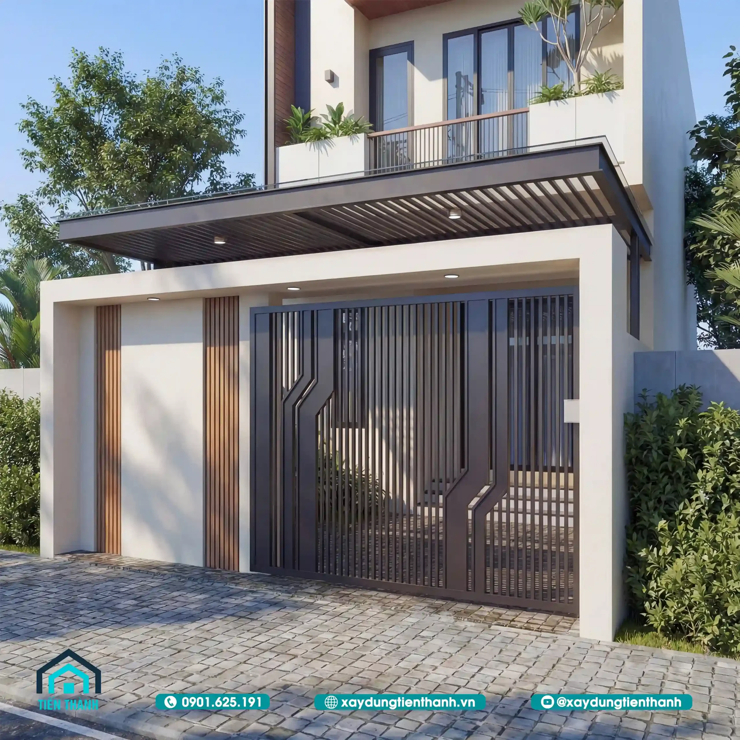 Đối với mặt tiền nhà phố 6m 2 tầng, hệ thống cổng đóng vai trò quyết định đến diện mạo ngôi nhà. Ở mẫu này, kiến trúc sư sử dụng cổng sắt nan dọc với các đường cắt xẻ CNC nghệ thuật, vừa đảm bảo an ninh vừa tạo độ thông thoáng (view-through) giúp ngôi nhà không bị bí bách.