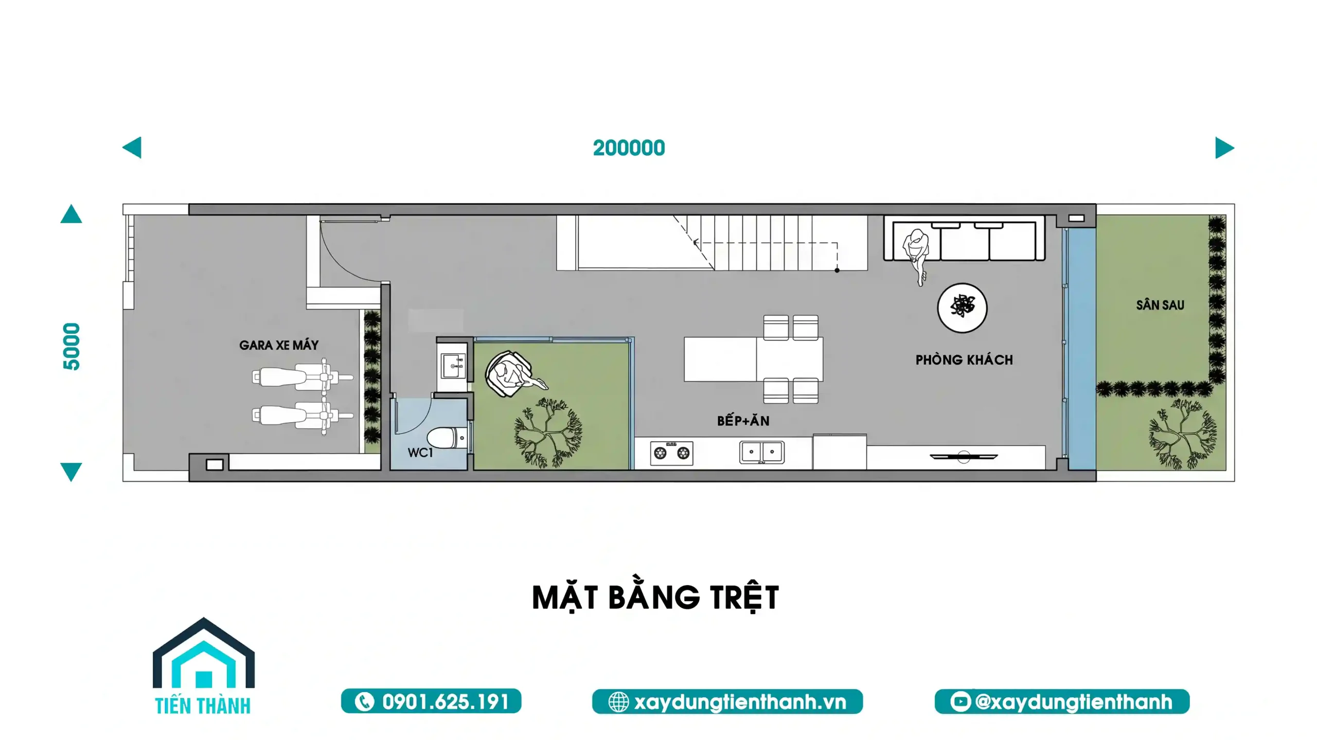 Với chiều dài 20m, mặt bằng tầng trệt được tính toán kỹ lưỡng để đảm bảo sự liền mạch.