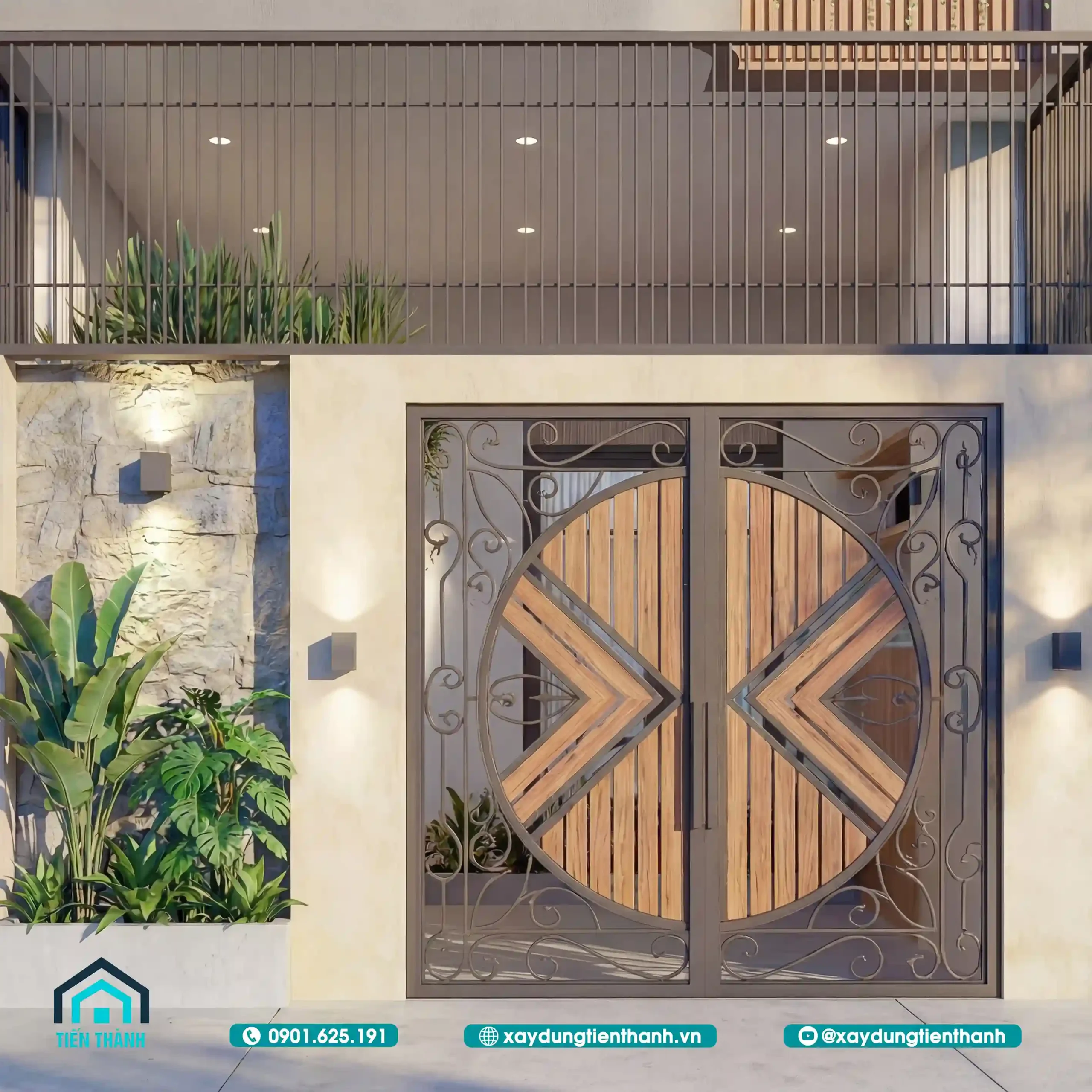 Chi tiết cửa cổng sắt nghệ thuật kết hợp gỗ tự nhiên tạo điểm nhấn độc đáo.